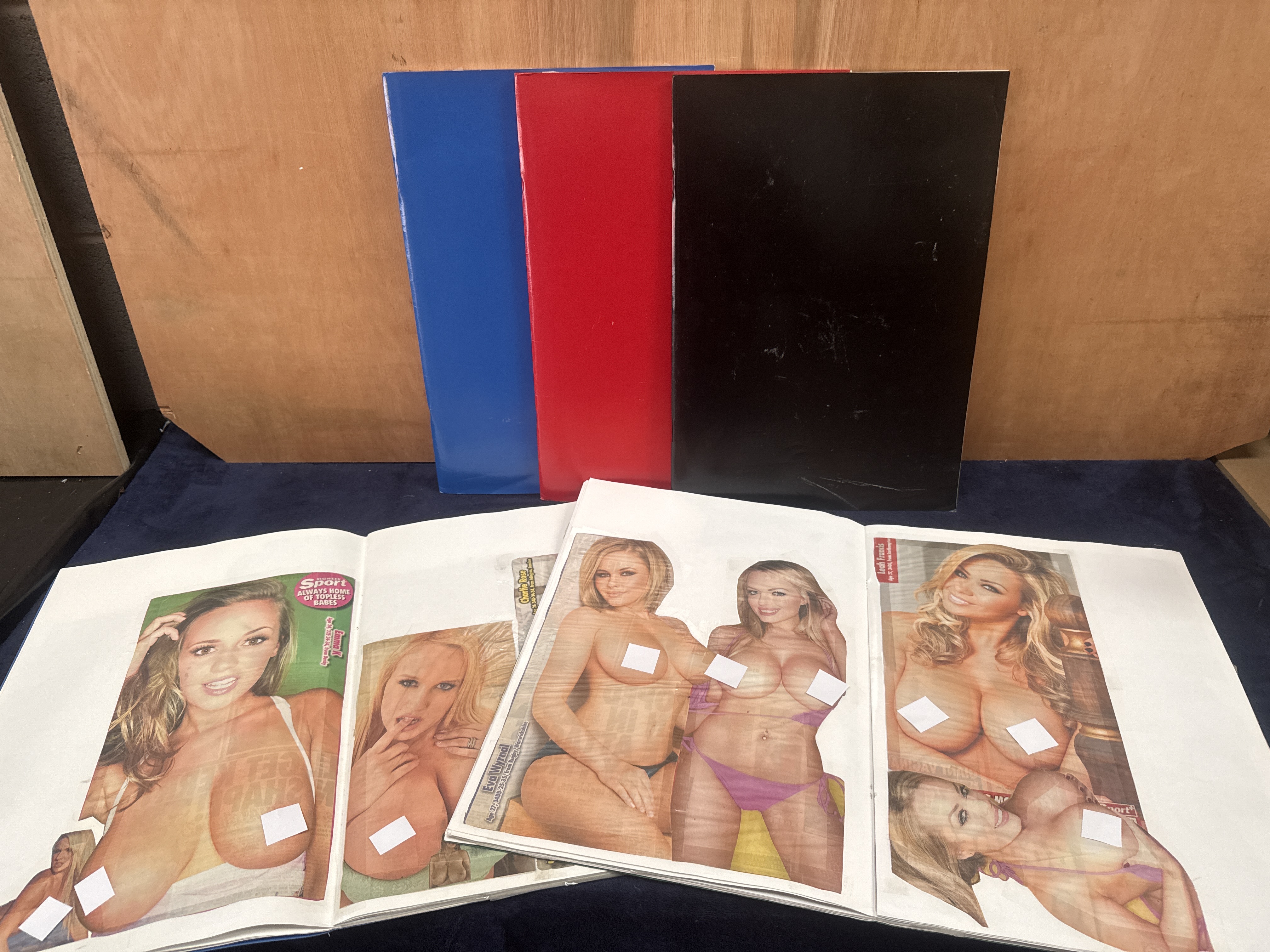 A collection of five adult content full scrap books and portfolios containing an assortment of printed and cut-out glamour photography clippings. The lot includes three solid-colored binders in blue, red, and black, along with two portfolios. The contents consist of curated clippings sourced from various adult-oriented periodicals and tabloid-style publications, featuring topless and swimwear photography. Identified individuals within the collection include Emma K, Eva Wyrwal, and Leah Francis. The clippings are mounted to the interior paper pages.