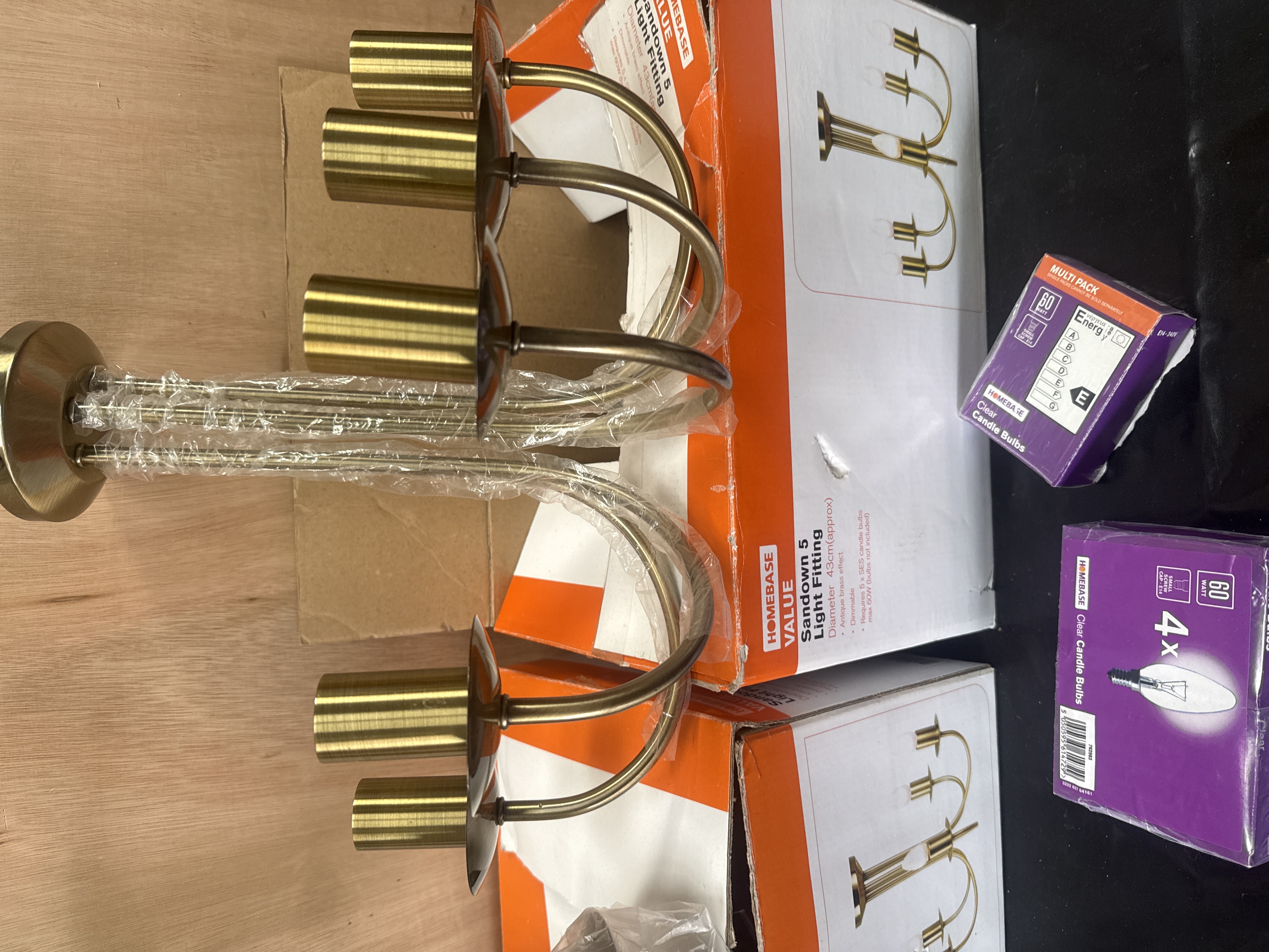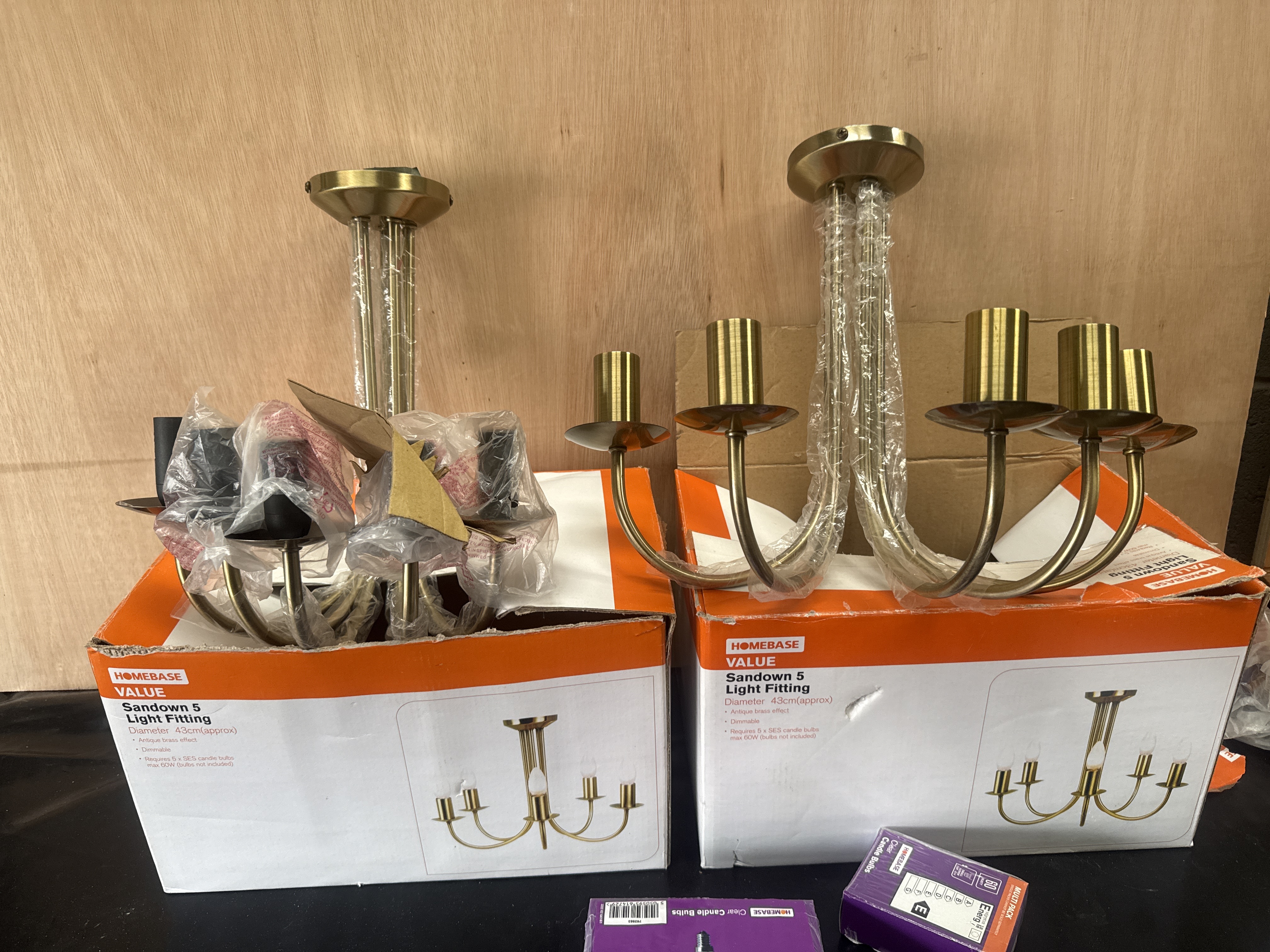 A group of Homebase Sandown five-light ceiling fittings in an antique brass-effect finish. Each fixture features five curved arms extending from a central support, terminating in cylindrical sockets designed for SES candle bulbs. According to the manufacturer packaging, each fitting is dimmable. The lot includes several packs of clear candle light bulbs.