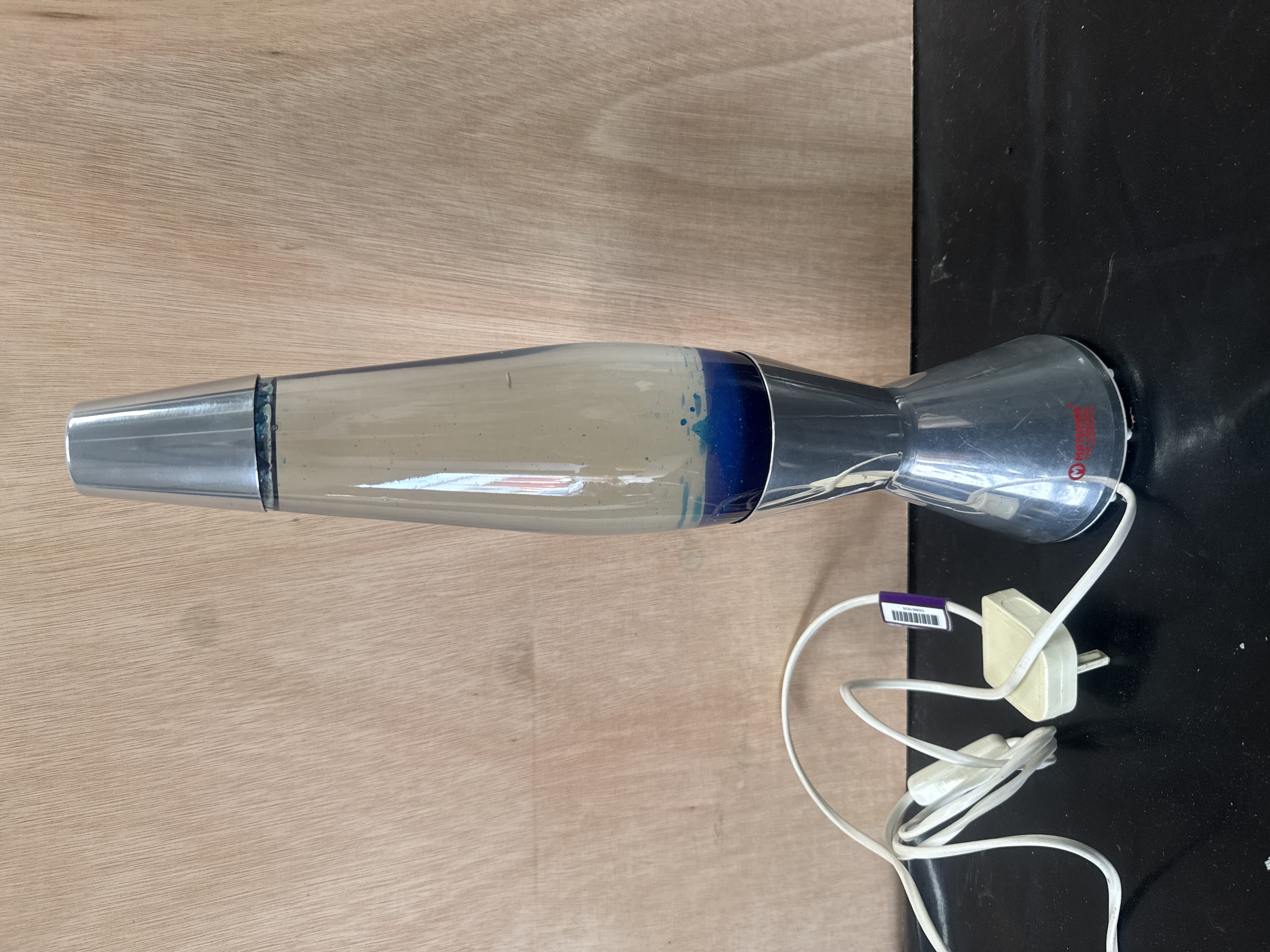 A Mathmos Astro model lava lamp featuring a 17 inch height. The unit comprises a polished chrome-finished metal base and a matching tapered top cap. The central glass vessel contains blue wax suspended within a pale liquid. The base displays a red brand logo and text reading MATHMOS THE ORIGINAL INVENTED IN 1963. The lamp is fitted with a white power cord, an inline switch, and a three-pin plug.