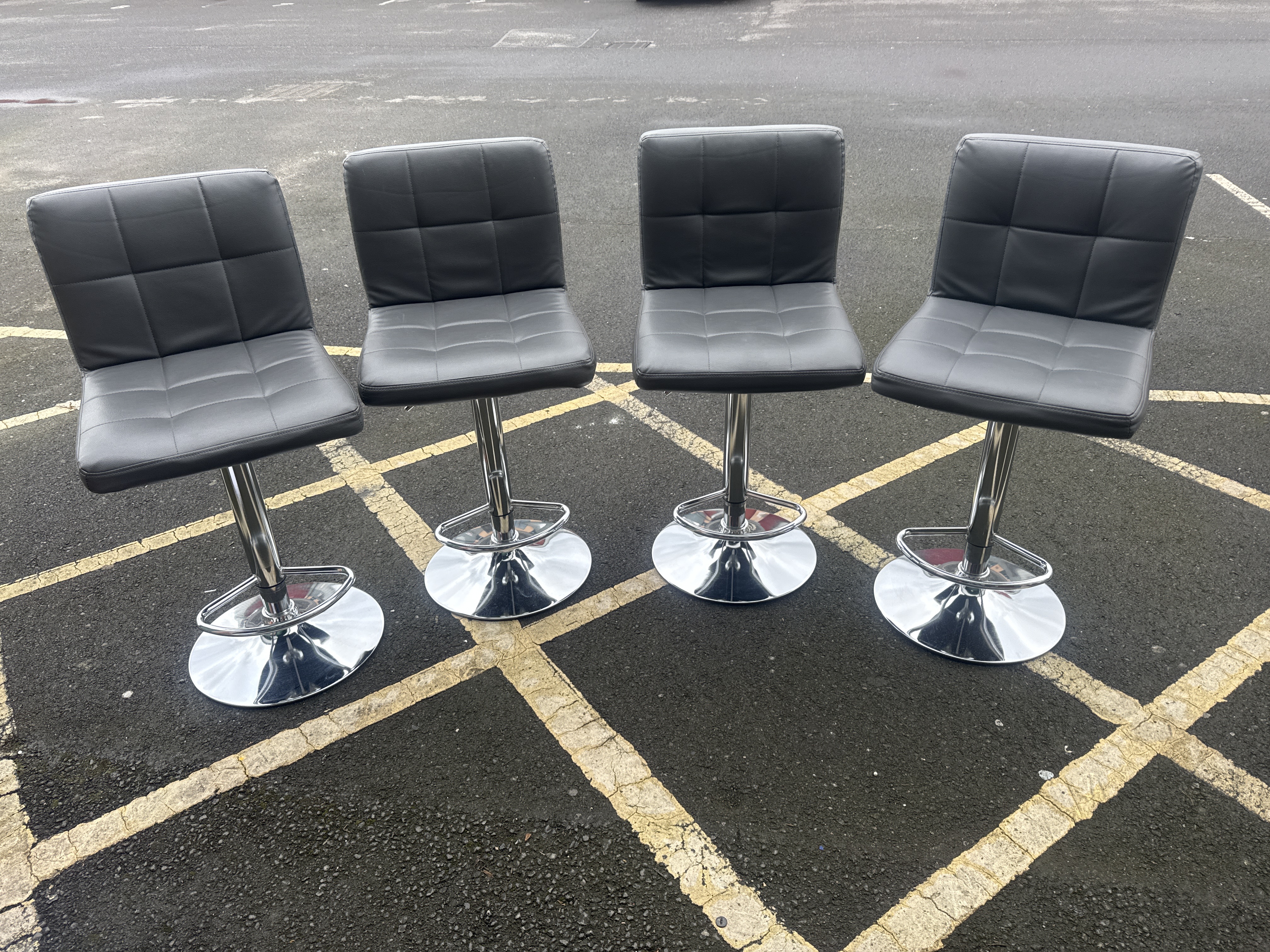 A set of modern barstools featuring dark gray faux leather upholstered seats and backrests with decorative grid-patterned stitching. Each stool is supported by a polished chrome-plated circular pedestal base with a central column. The construction includes a hydraulic gas lift height-adjustment lever located beneath the seat and an integrated footrest. The stools feature a 360-degree swivel mechanism.