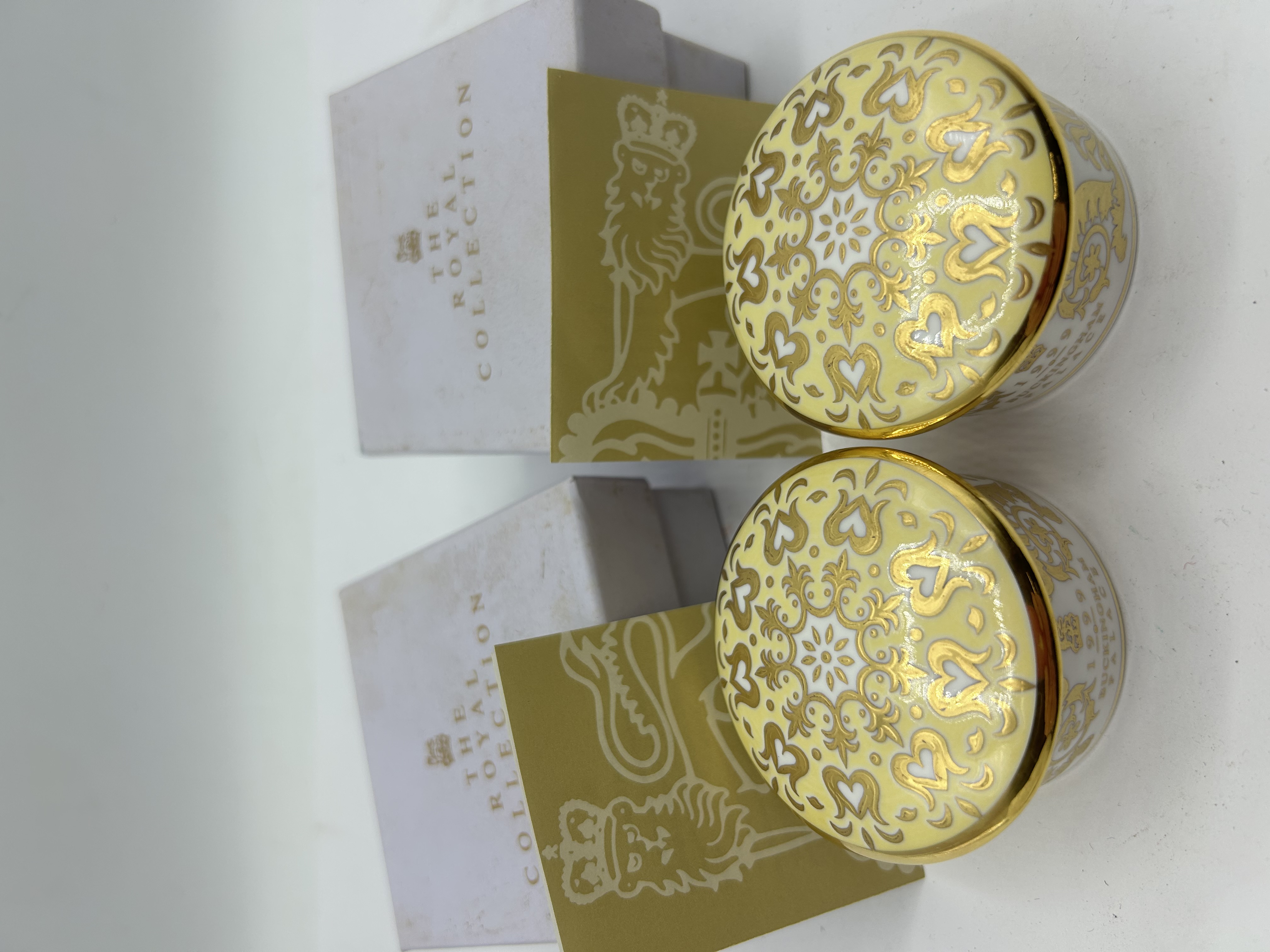 A pair of English fine bone china lidded trinket boxes from The Royal Collection, Buckingham Palace, dated 1999. The design is inspired by the silk damask of the White Drawing Room at Buckingham Palace, featuring a gilded scroll and damask pattern on a pale yellow ground. The sides of the boxes are decorated with gilded heraldic lion motifs. The bases are marked in gold lettering: BUCKINGHAM PALACE 1999 ENGLISH FINE BONE CHINA and DESIGN FROM THE SILK DAMASK OF THE WHITE DRAWING ROOM. Each item is accompanied by its original white presentation box branded THE ROYAL COLLECTION and a descriptive gold-tone insert.
