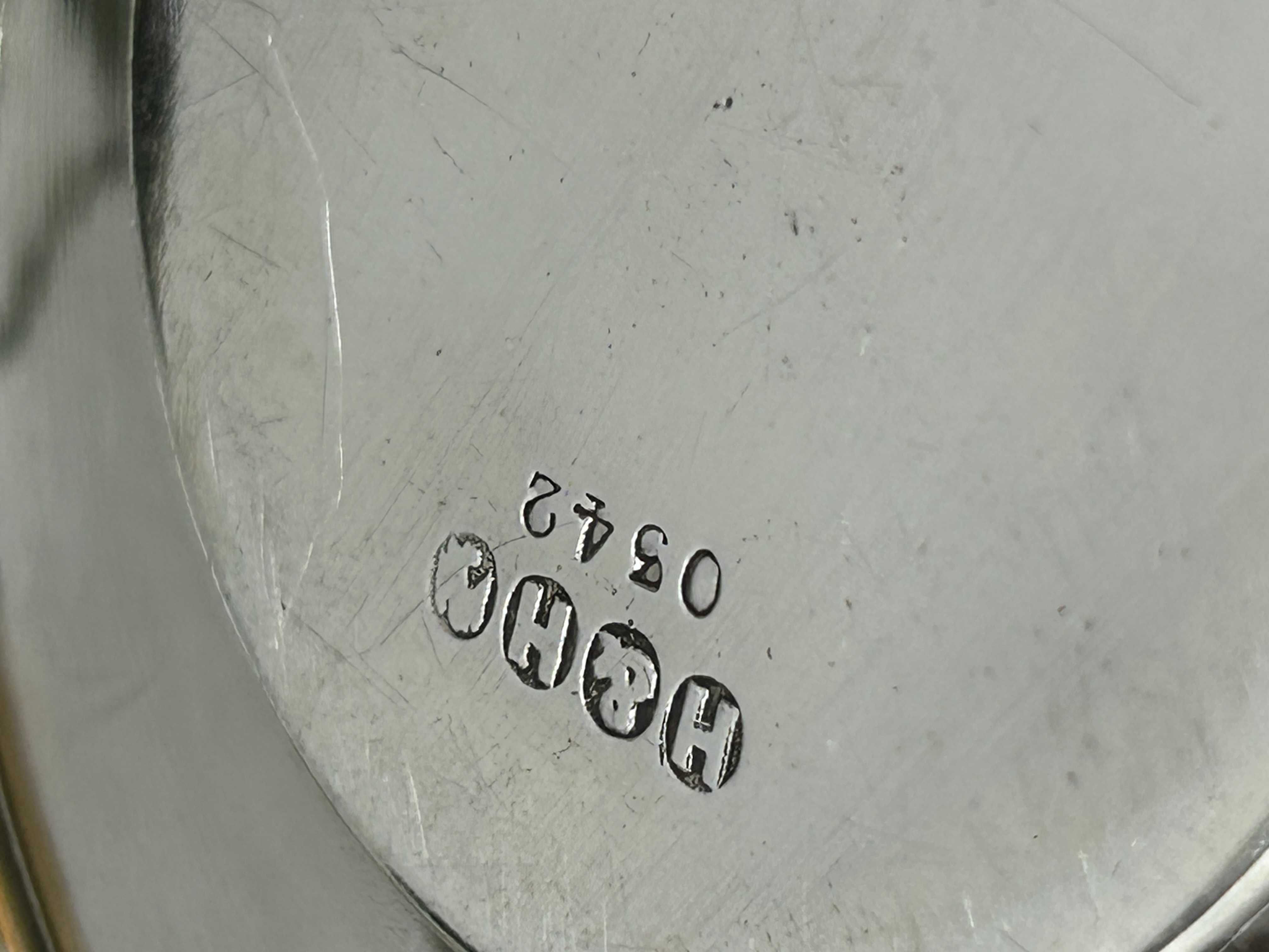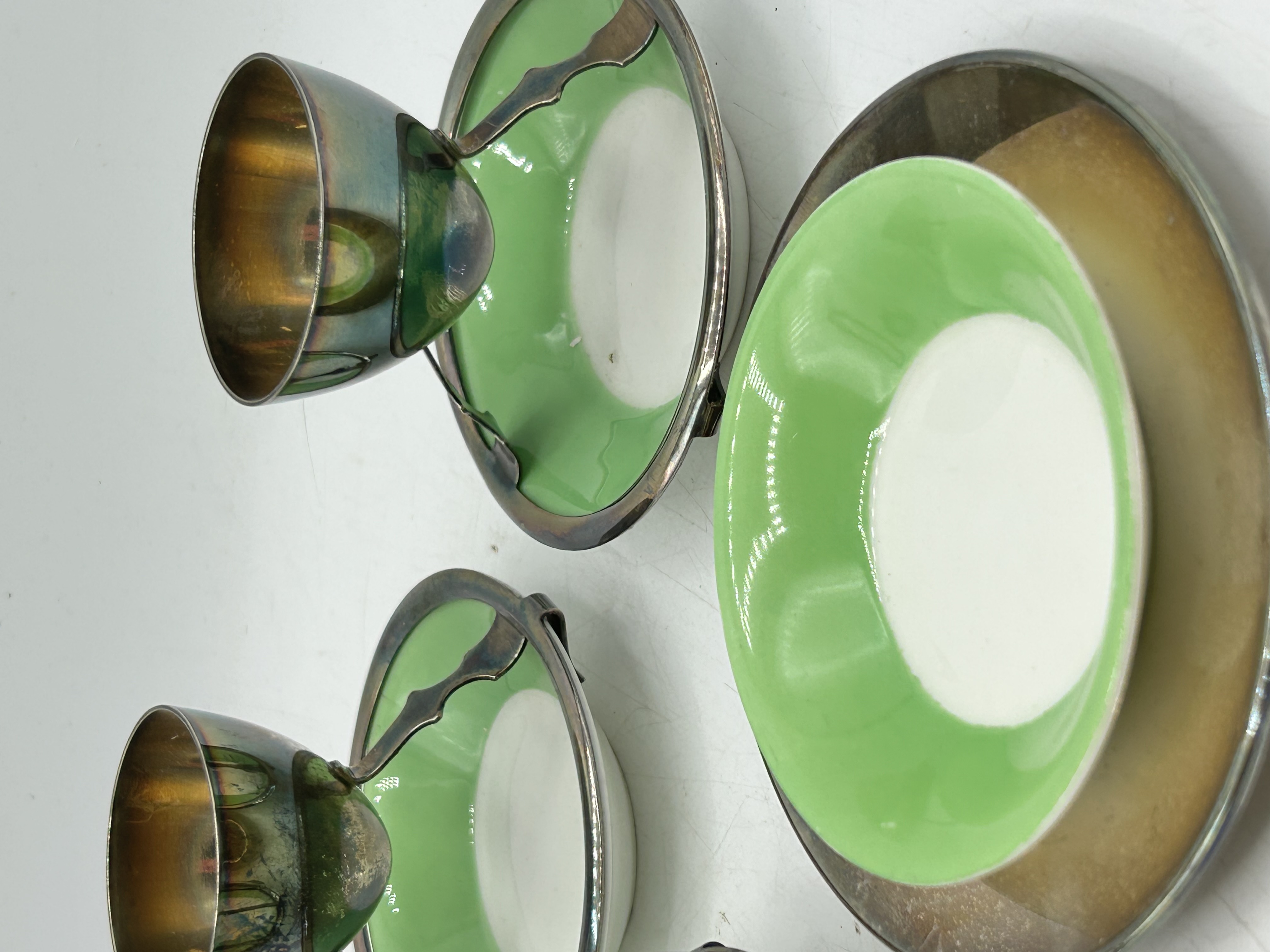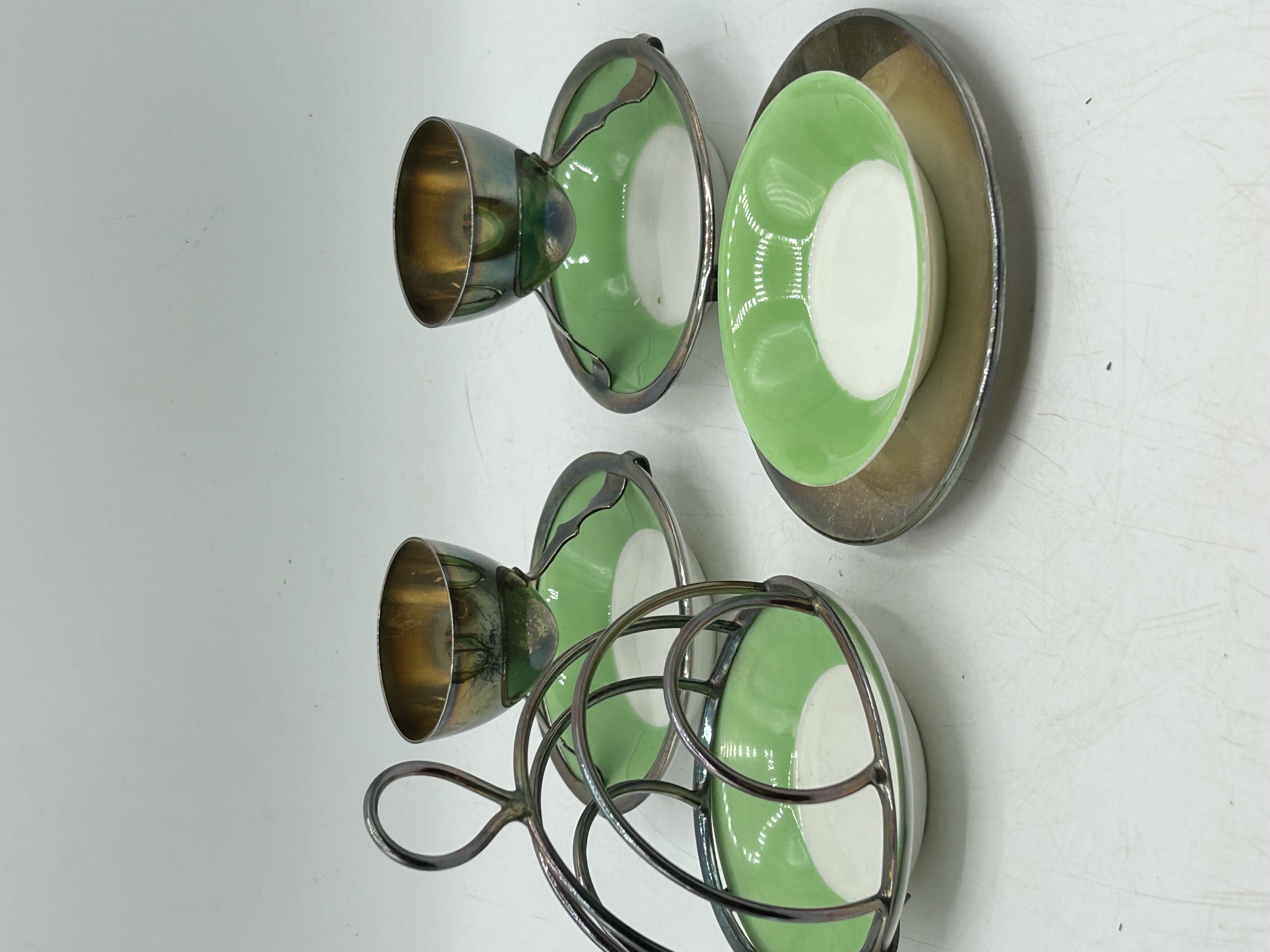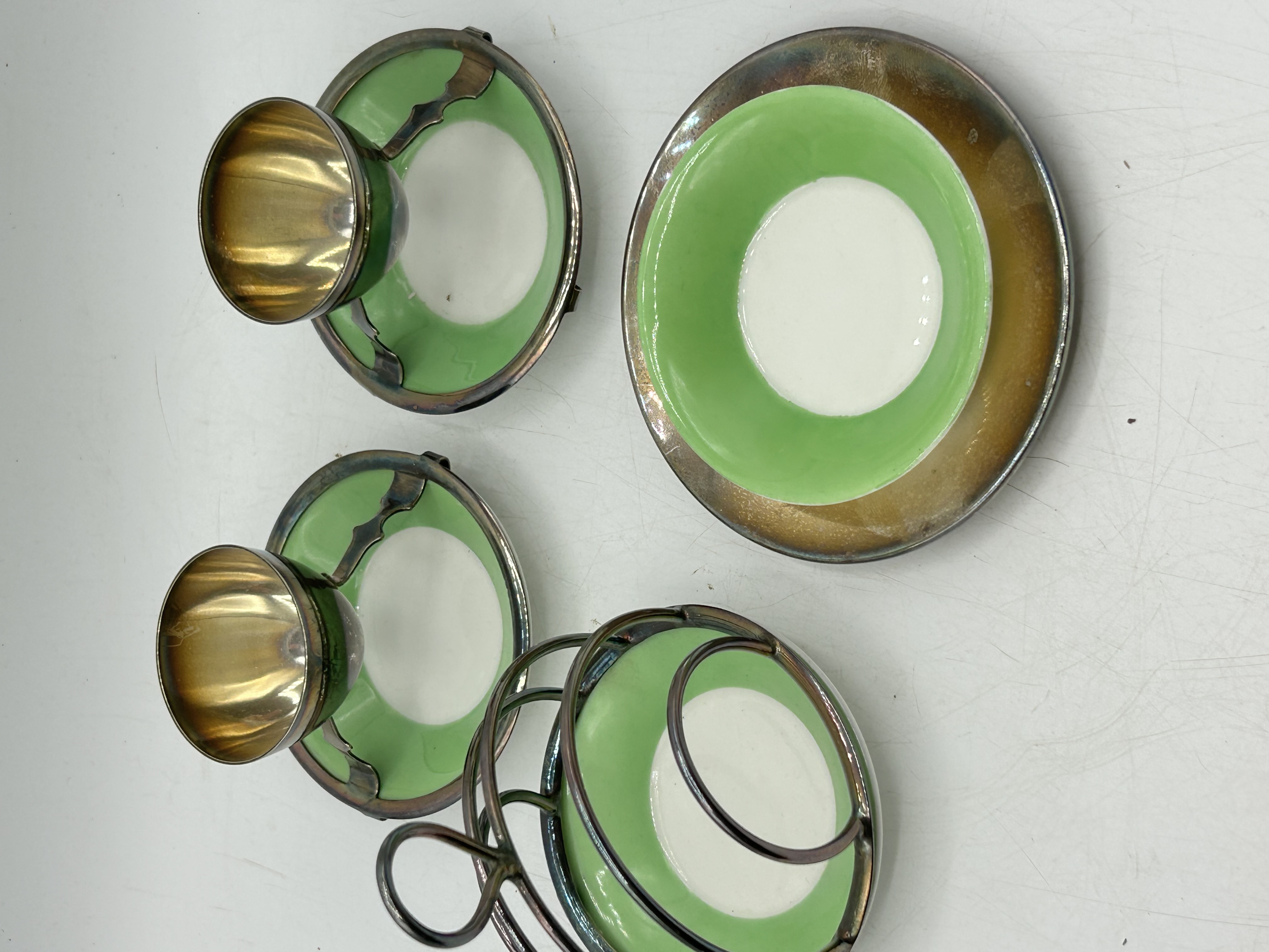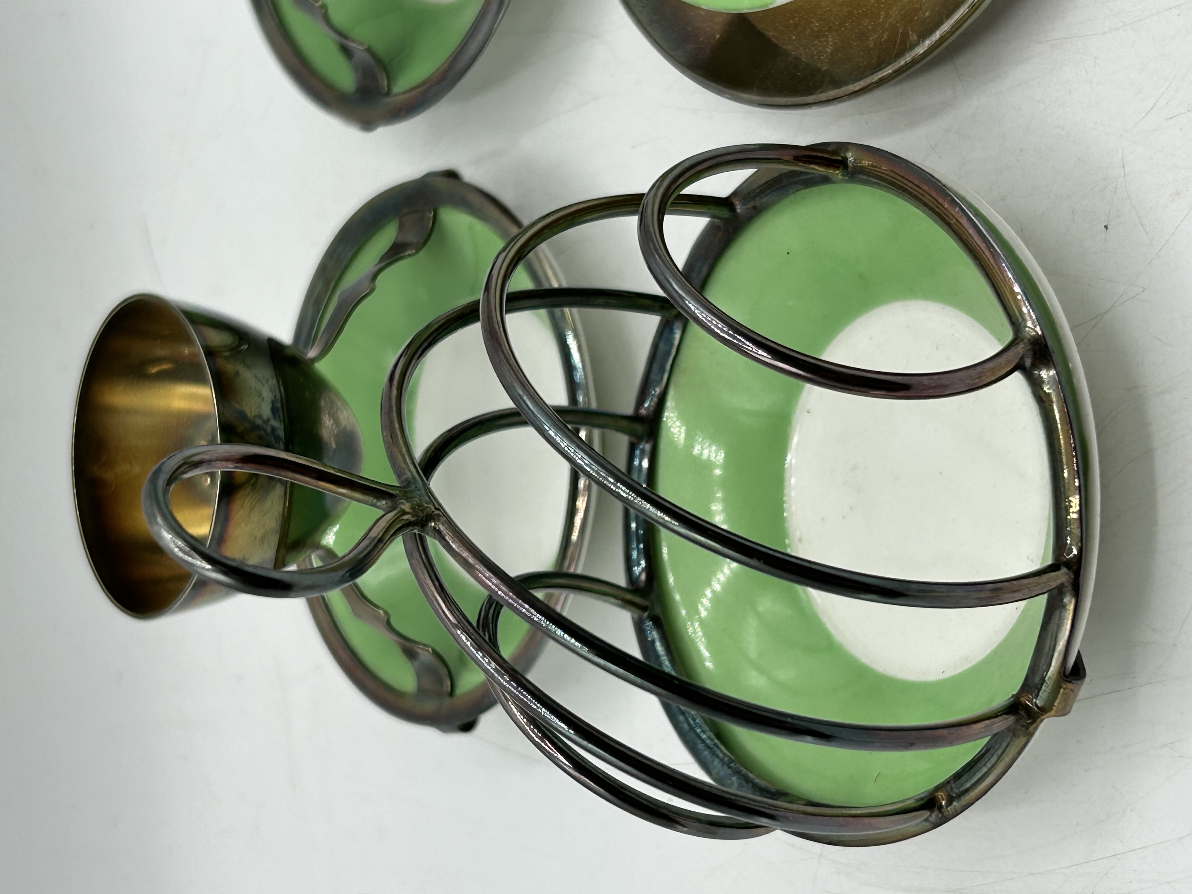 A group of silver-plated and ceramic breakfast service items manufactured by Hukin and Heath. The collection features lime green and white glazed ceramic dishes set into silver-plated metal frames. The items include egg cups on integrated stands, a wire-form toast rack, and a rimmed saucer. The metal components are stamped on the underside with the manufacturer mark H and H and the serial number 0342. The pieces are designed in the Arts and Crafts style.
