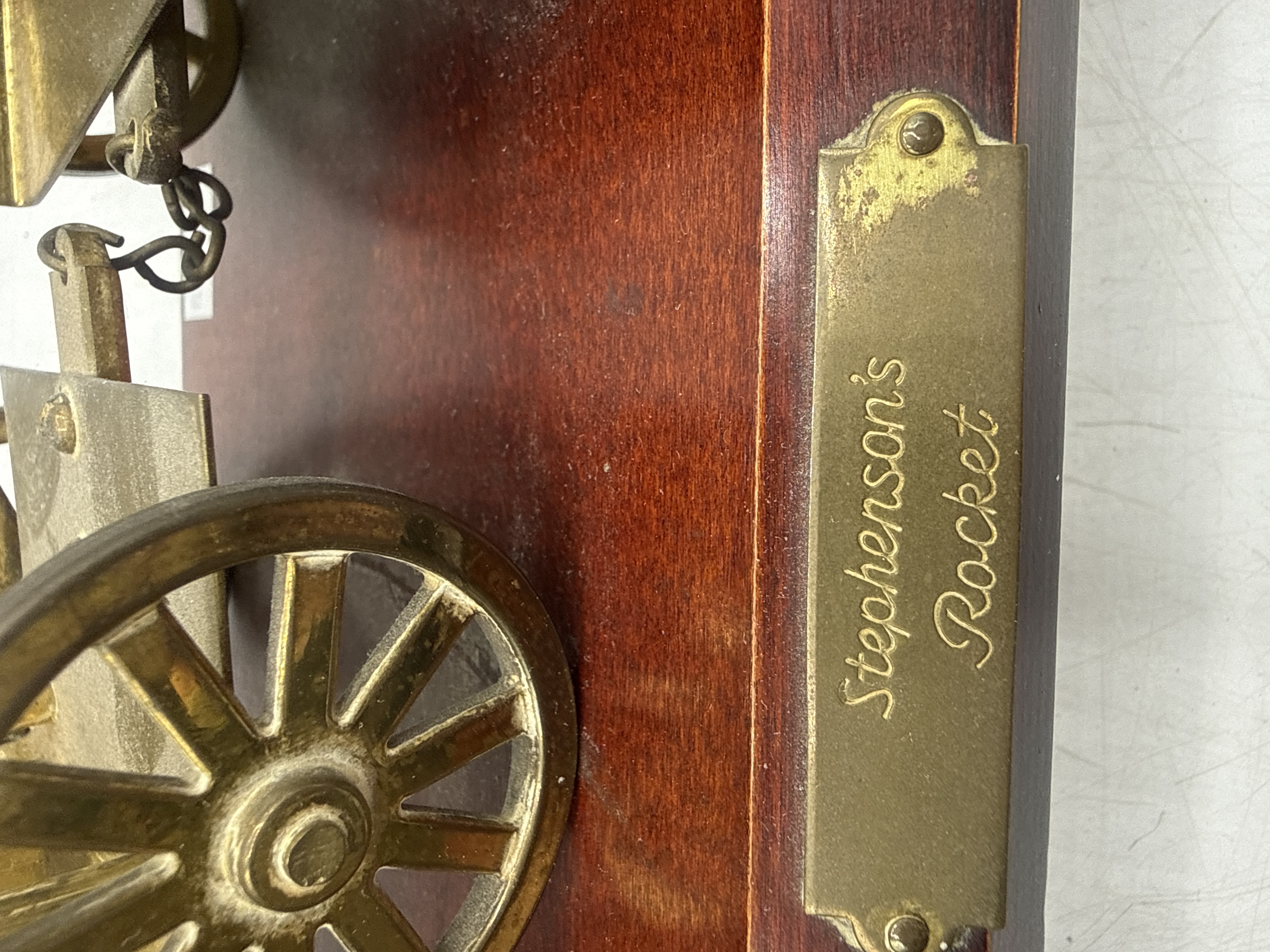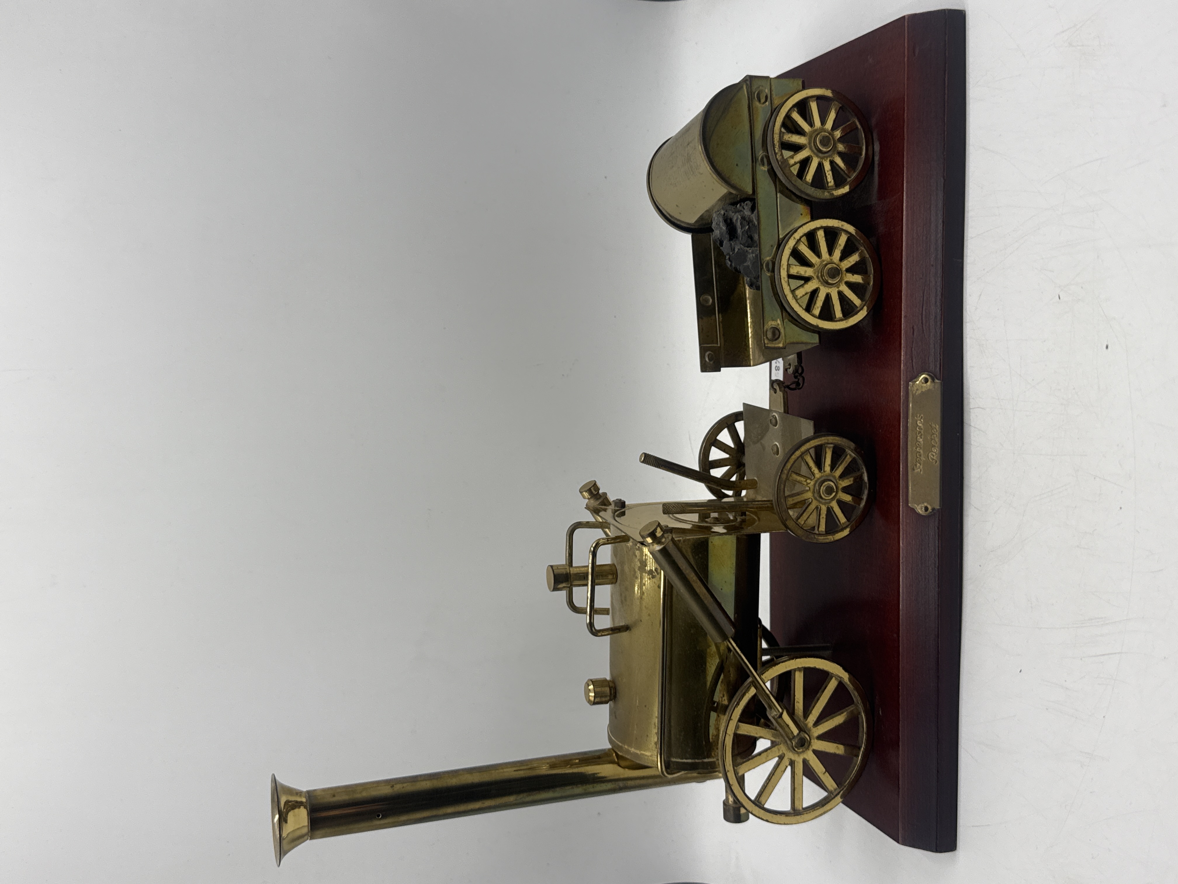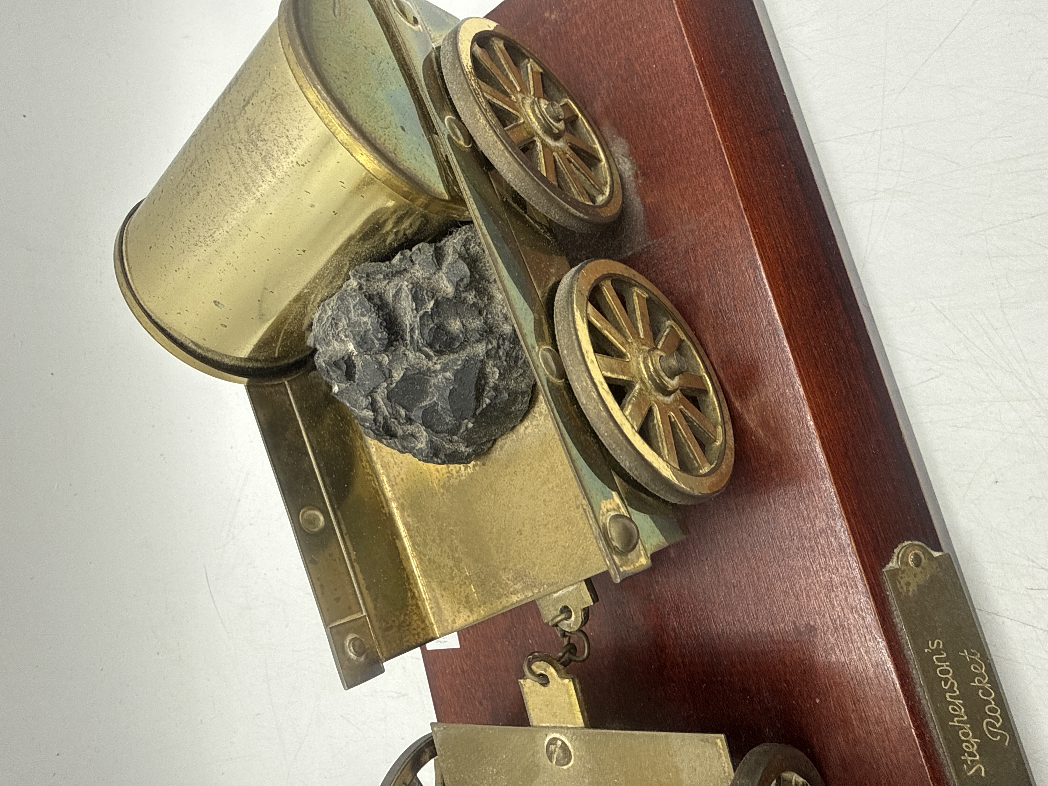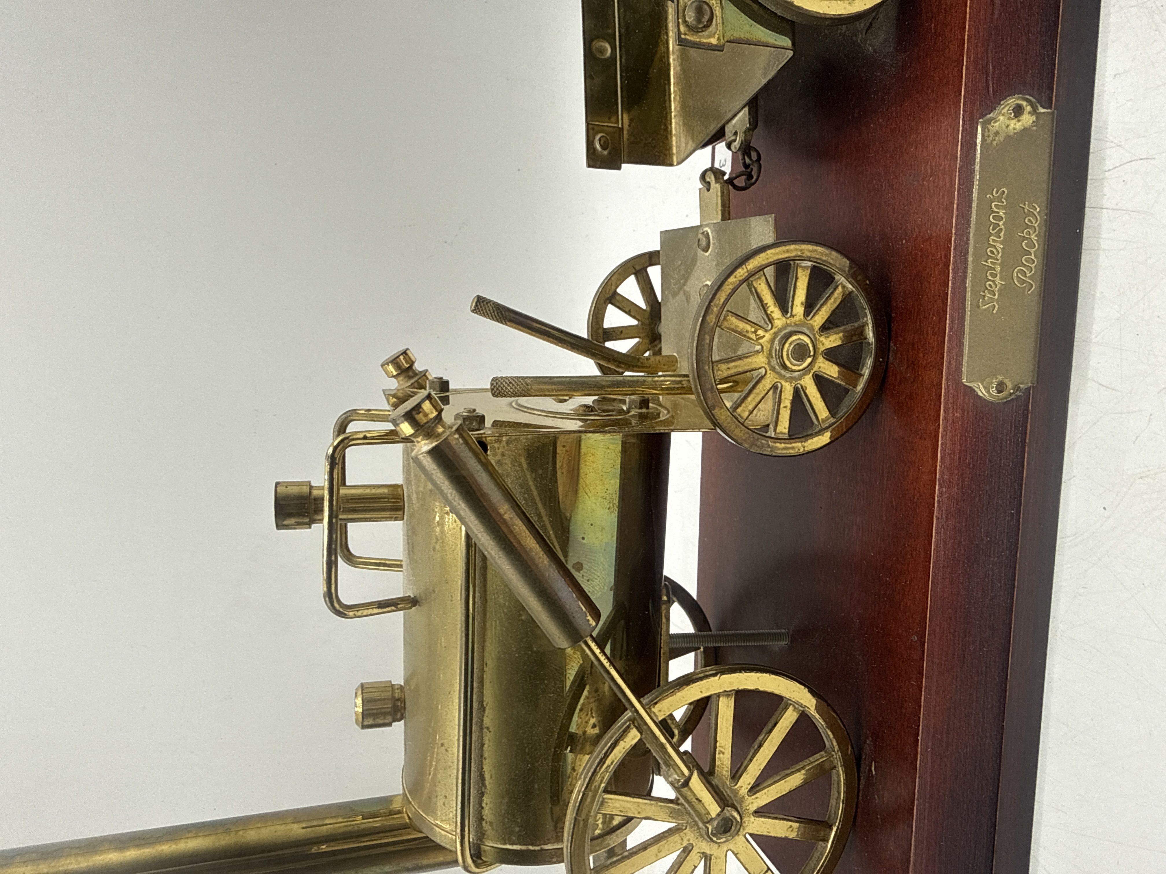 A brass scale model replica of the historic steam locomotive Stephenson’s Rocket and its tender, mounted on a rectangular, dark-finished wooden plinth. The model features detailed brass construction, including the boiler, tall chimney, and spoked wheels. The connected tender holds a representation of a piece of coal and a cylindrical barrel. An engraved brass plaque is affixed to the side of the wooden base, bearing the name Stephenson’s Rocket in a cursive script.