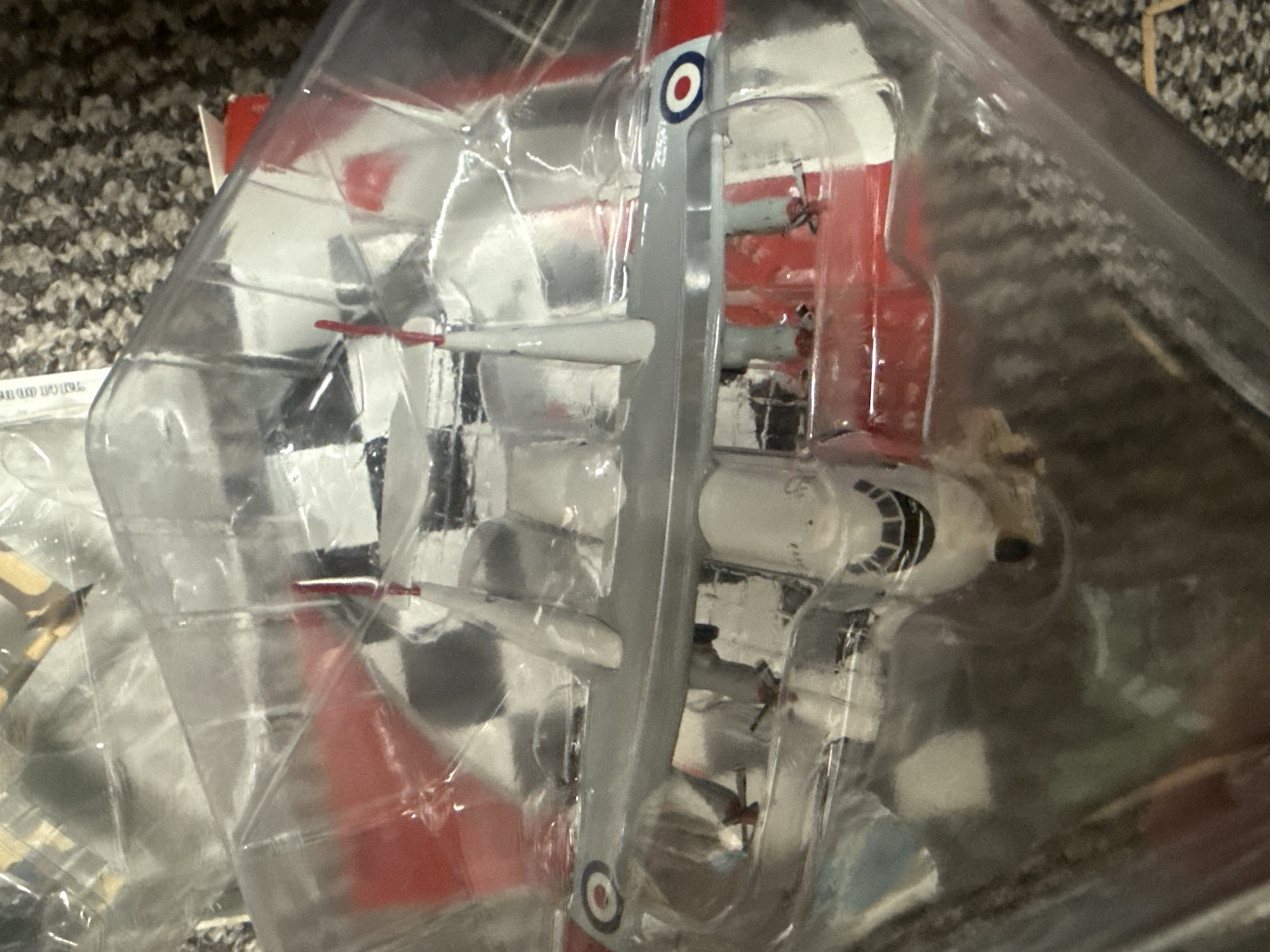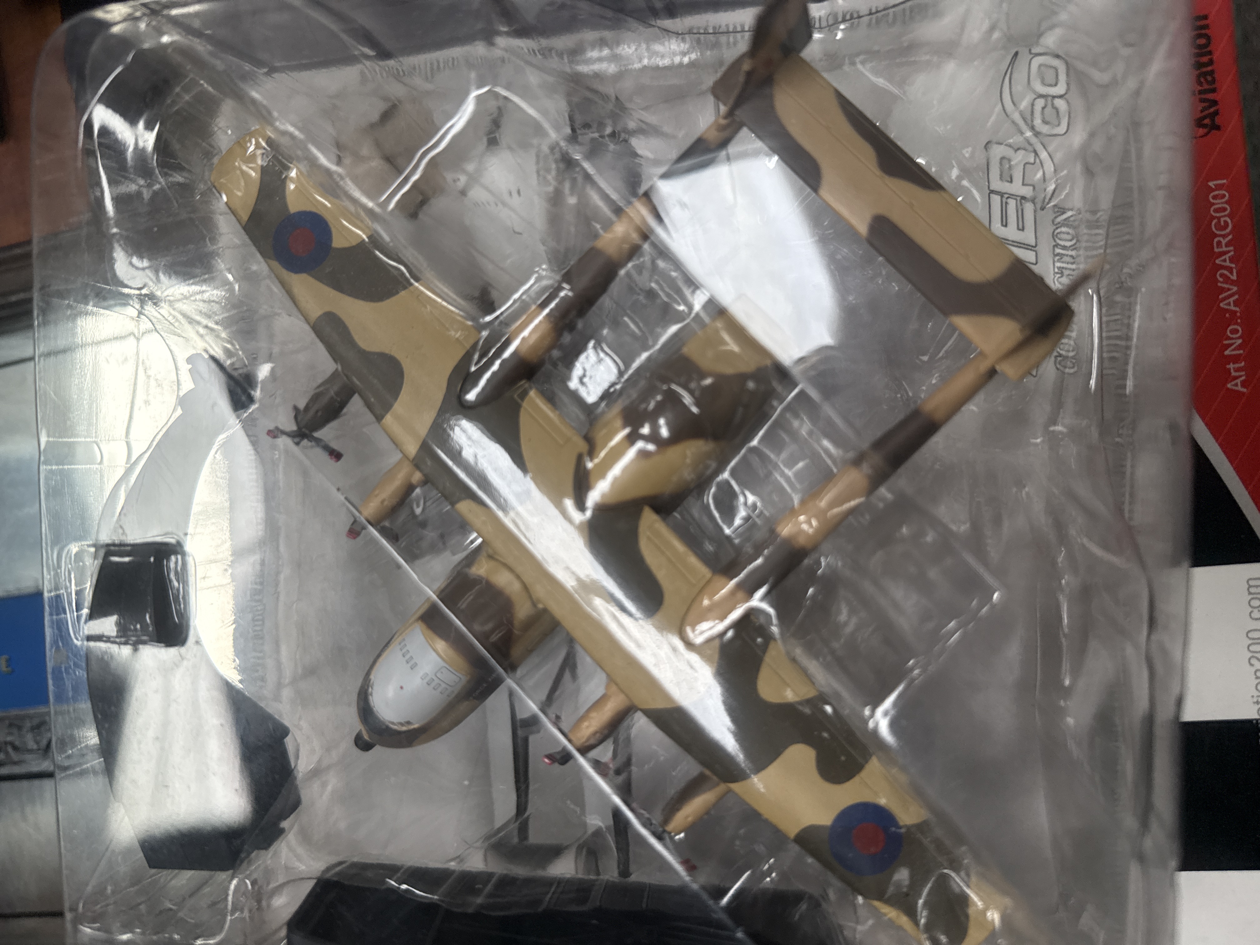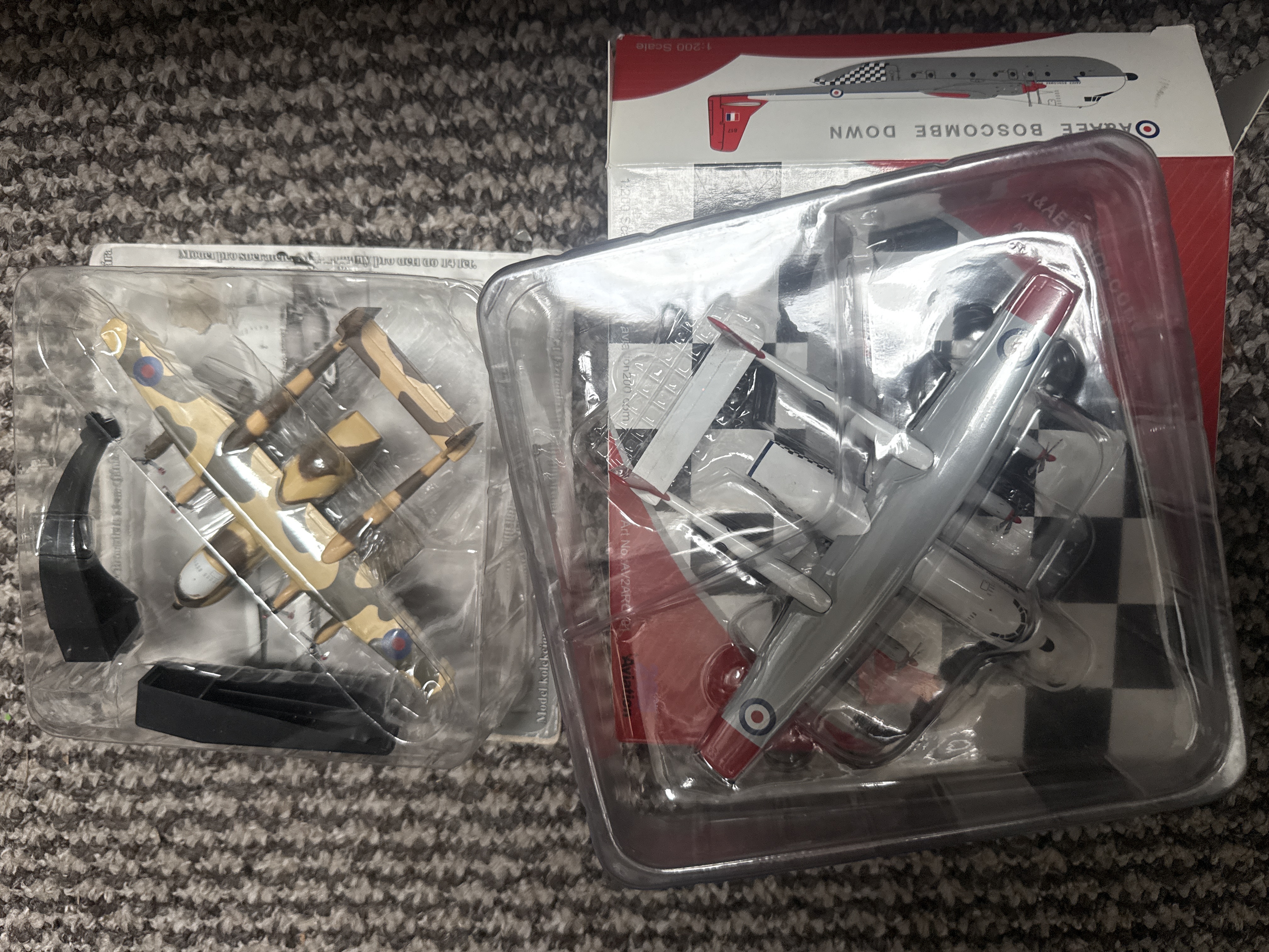 Two 1:200 scale die-cast metal model aircraft from the Aviation 200 series, both depicting the Armstrong Whitworth Argosy. The first model is finished in a grey and white livery with red accents and Royal Air Force roundels, identified by its packaging as an A&AEE Boscombe Down aircraft. The second model features a tan and brown camouflage pattern with Royal Air Force markings. Both models are secured within their original clear plastic blister packaging. One model includes its original red and white retail box, which is labelled with Art No.: AV2ARG001. The aircraft feature a four-engine, twin-boom design characteristic of the type.