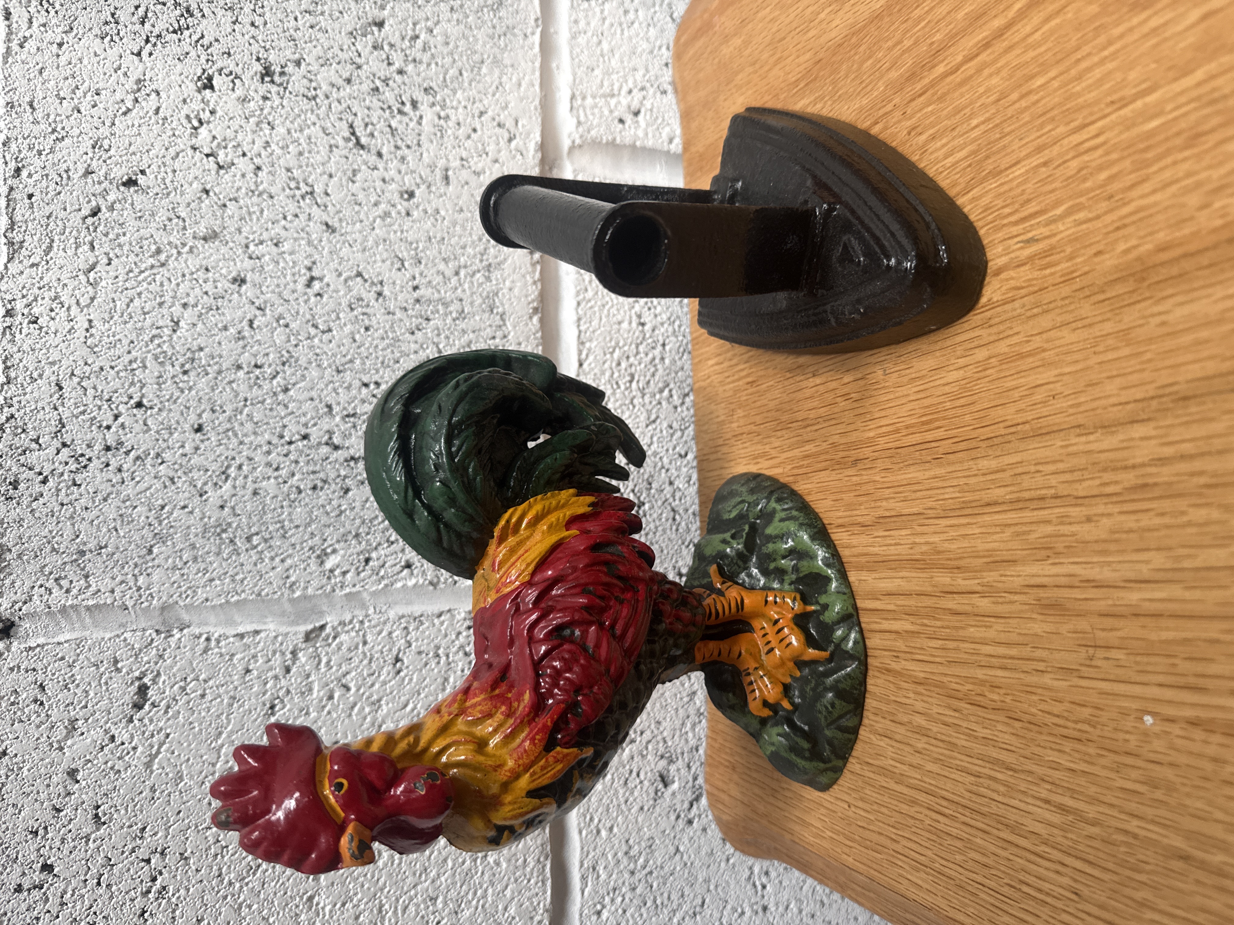 Two cast iron decorative items comprising a standing 8-inch cockerel door stop and a miniature flat iron. The cockerel is finished in polychrome colours of red, yellow, and green, depicted on a textured green base. The miniature flat iron features a uniform dark finish. Both items are mounted to a rectangular light-toned wooden plaque with a polished finish and prominent natural grain.