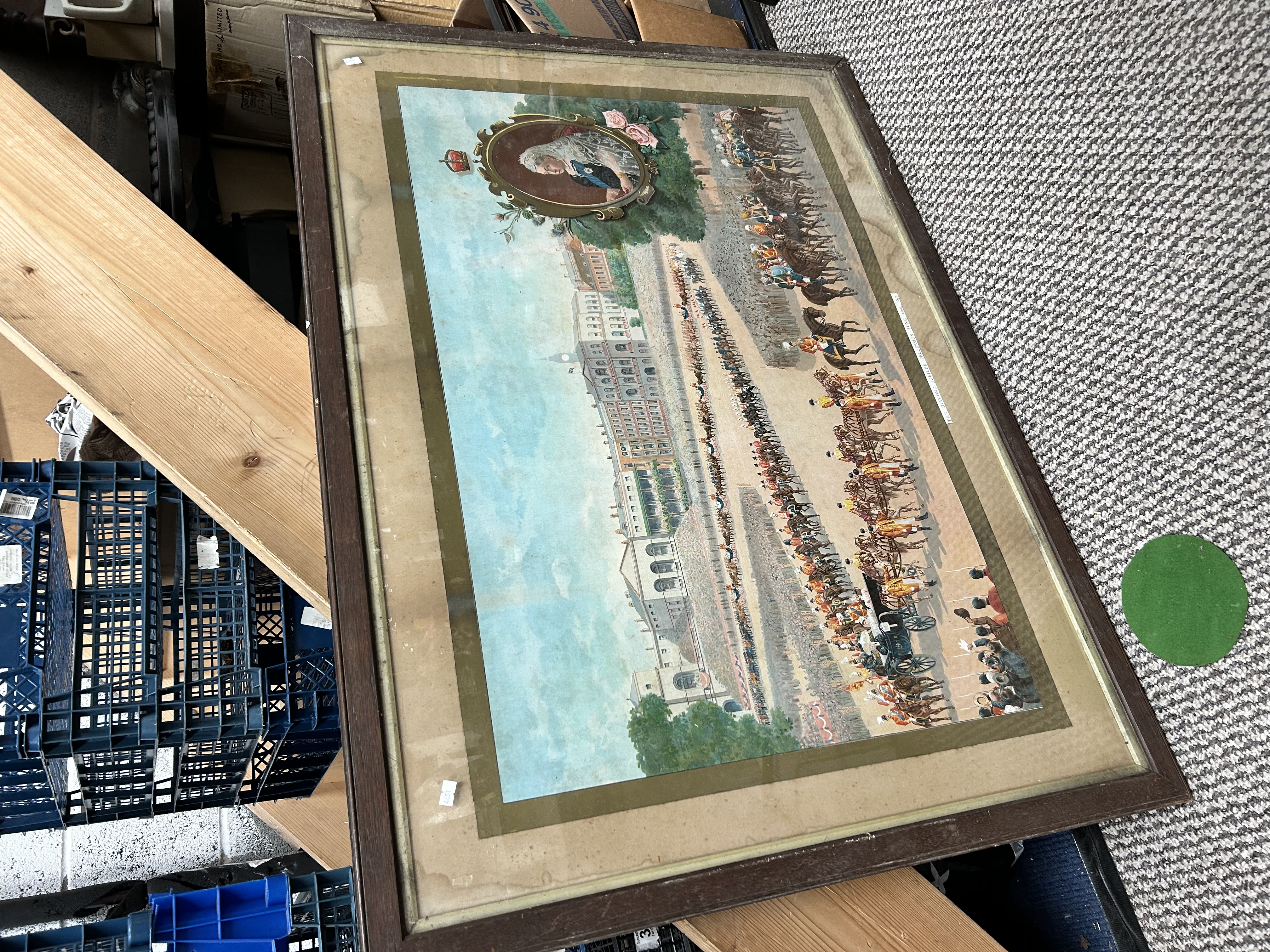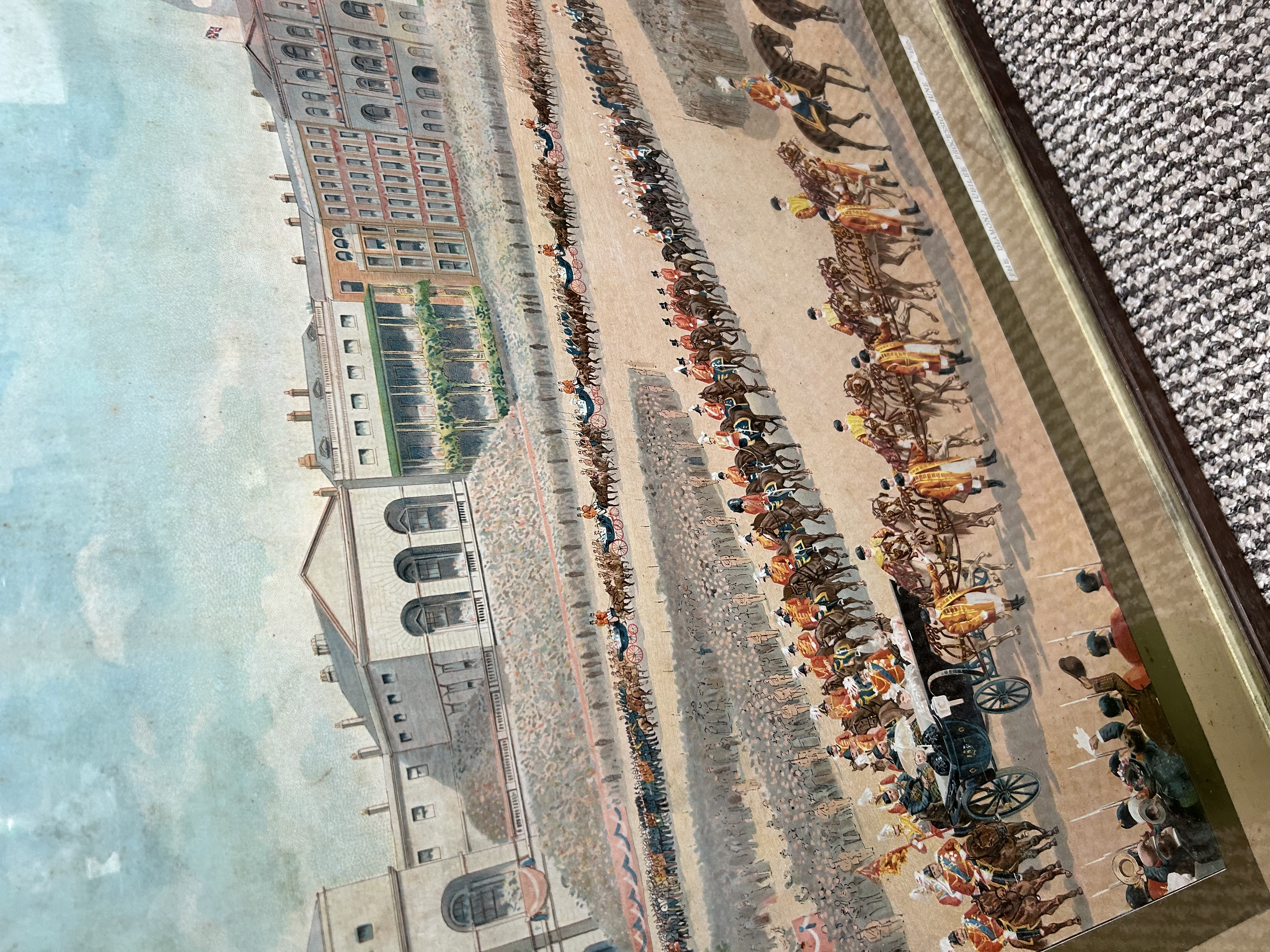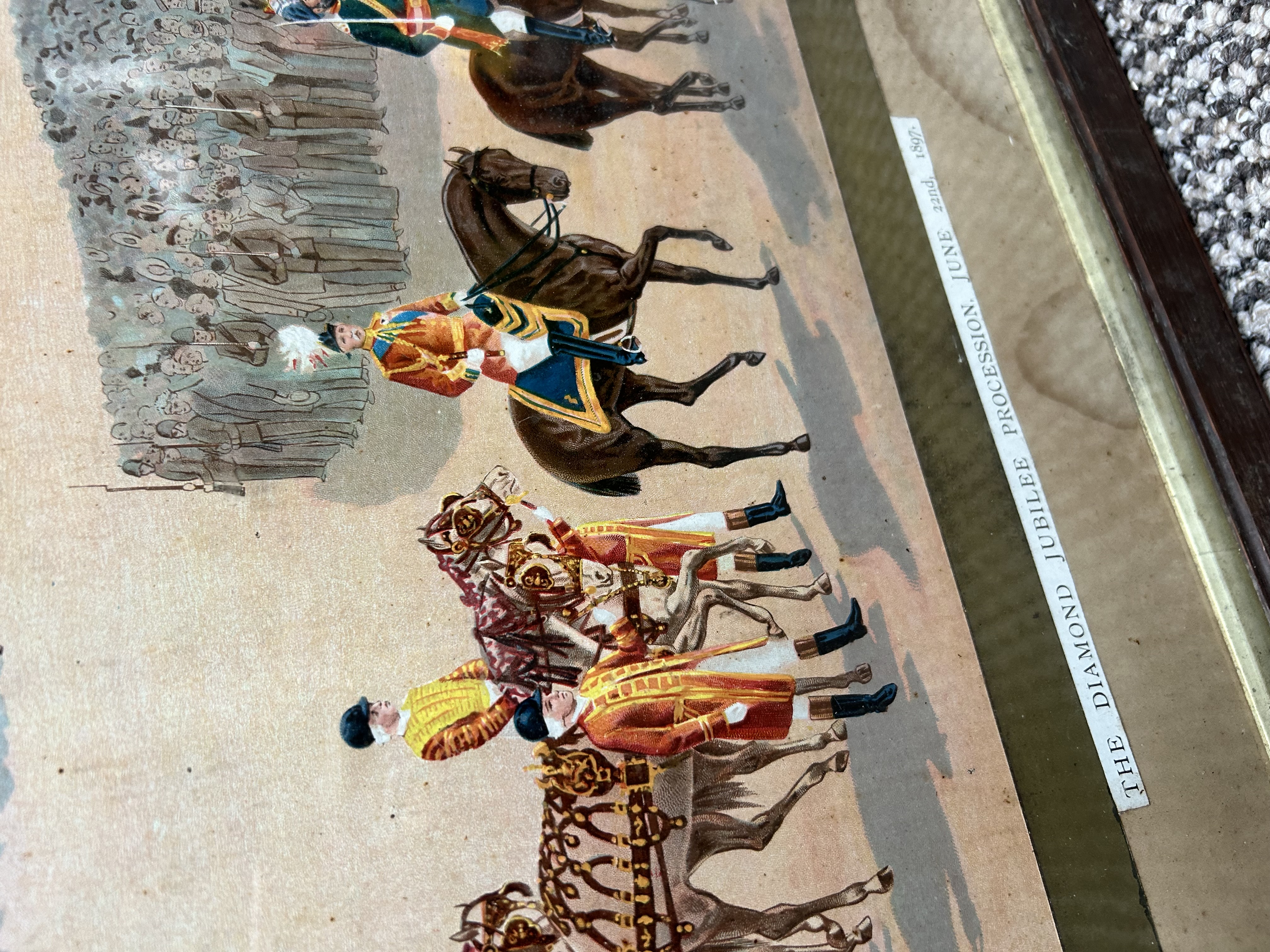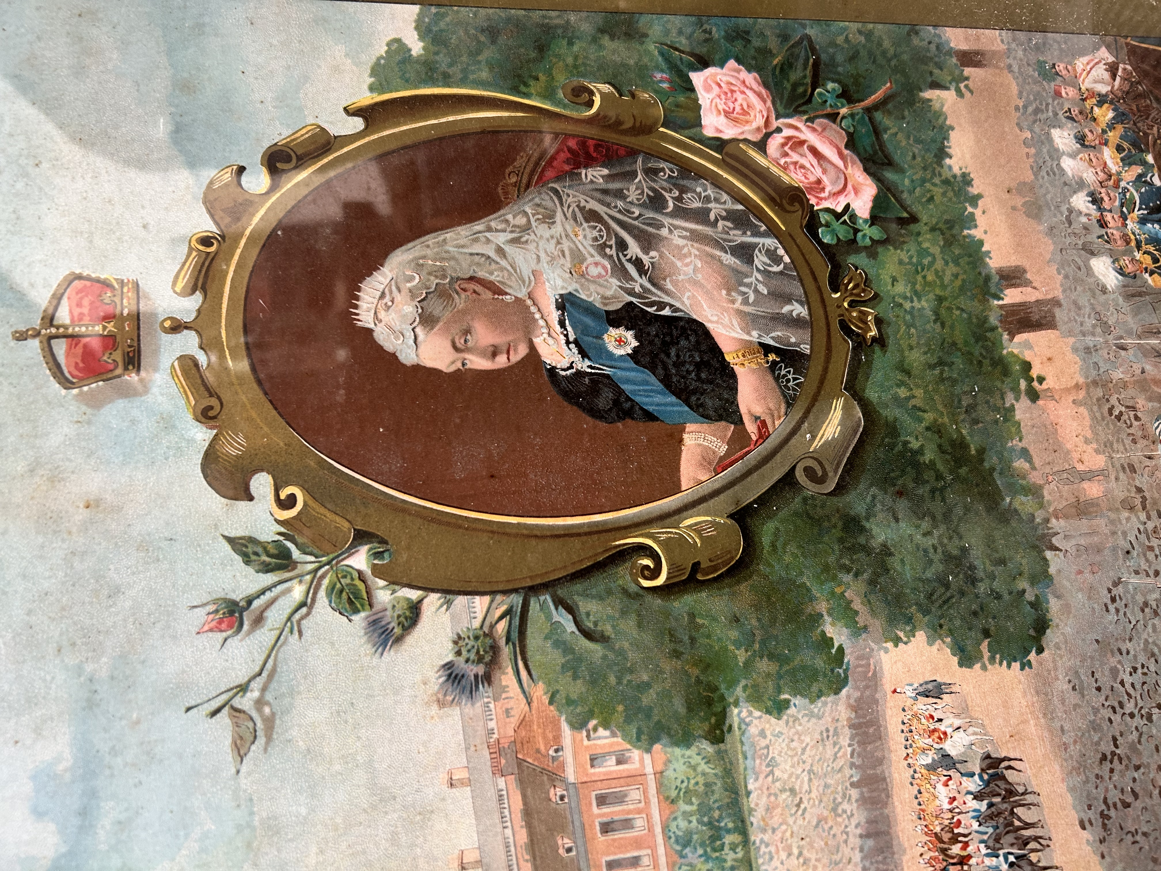 This large-scale commemorative colour lithograph depicts The Diamond Jubilee Procession, June 22nd, 1897, celebrating the reign of Queen Victoria. The composition features a centralised oval portrait of the Queen in profile, wearing a lace veil and royal orders, set within an ornate scrolled border and flanked by floral emblems including roses and thistles. Below the portrait is a detailed panoramic scene of the royal and military procession in front of a grand palace, showing numerous horse-drawn carriages and soldiers in full ceremonial dress. A printed title strip is affixed to the lower right corner. The piece is housed in a dark wood frame with a gold-tone inner slip under glass.