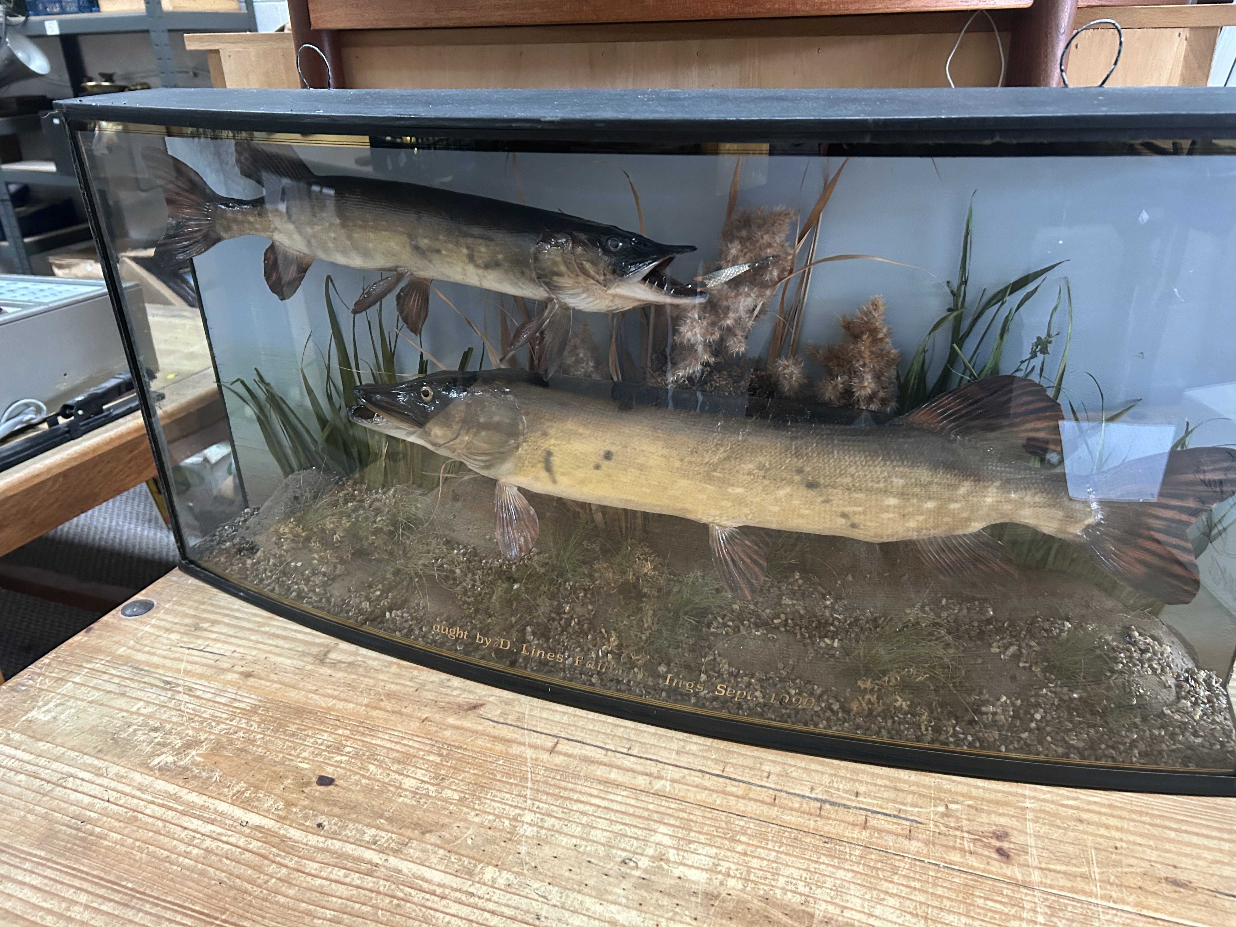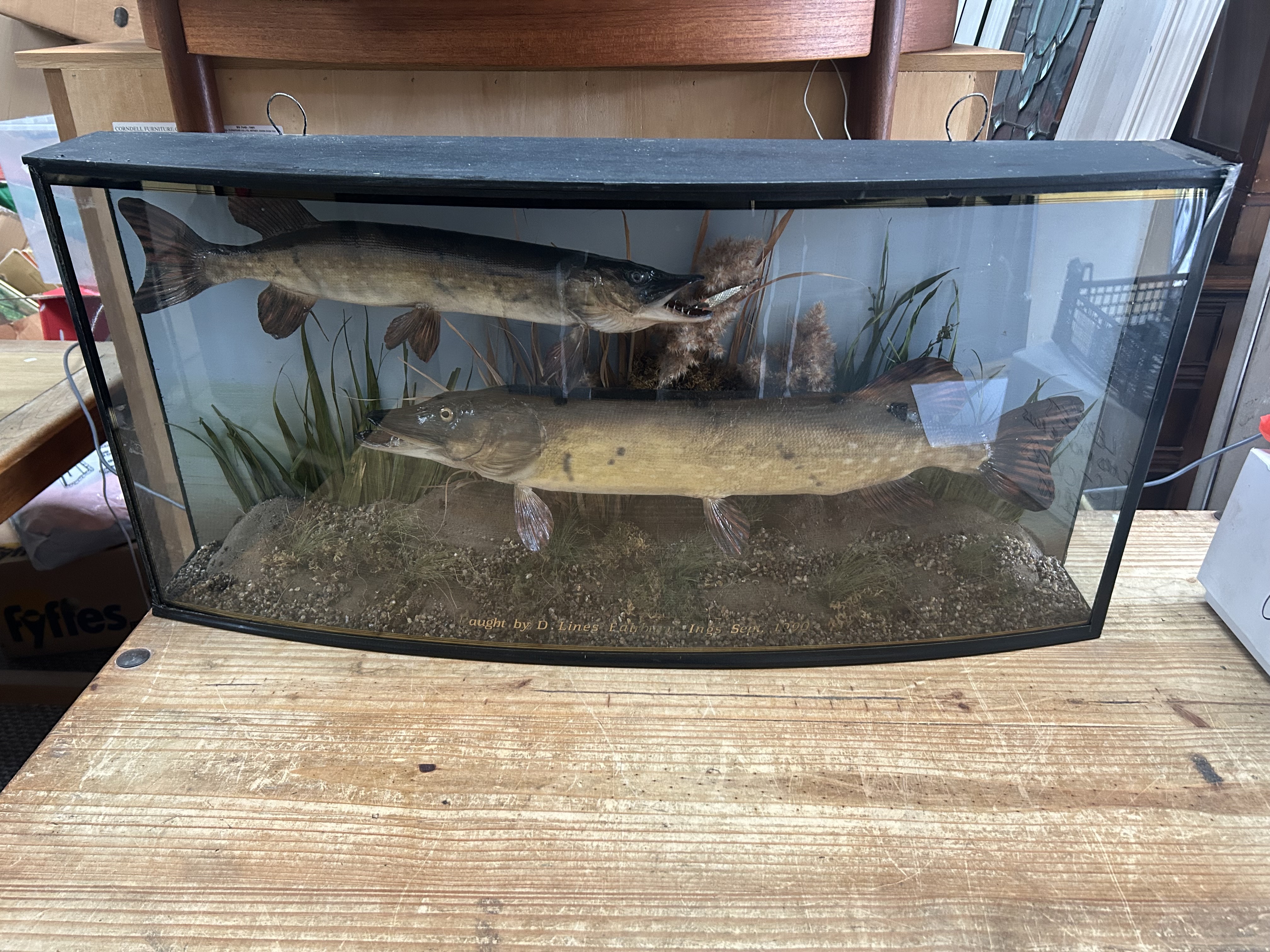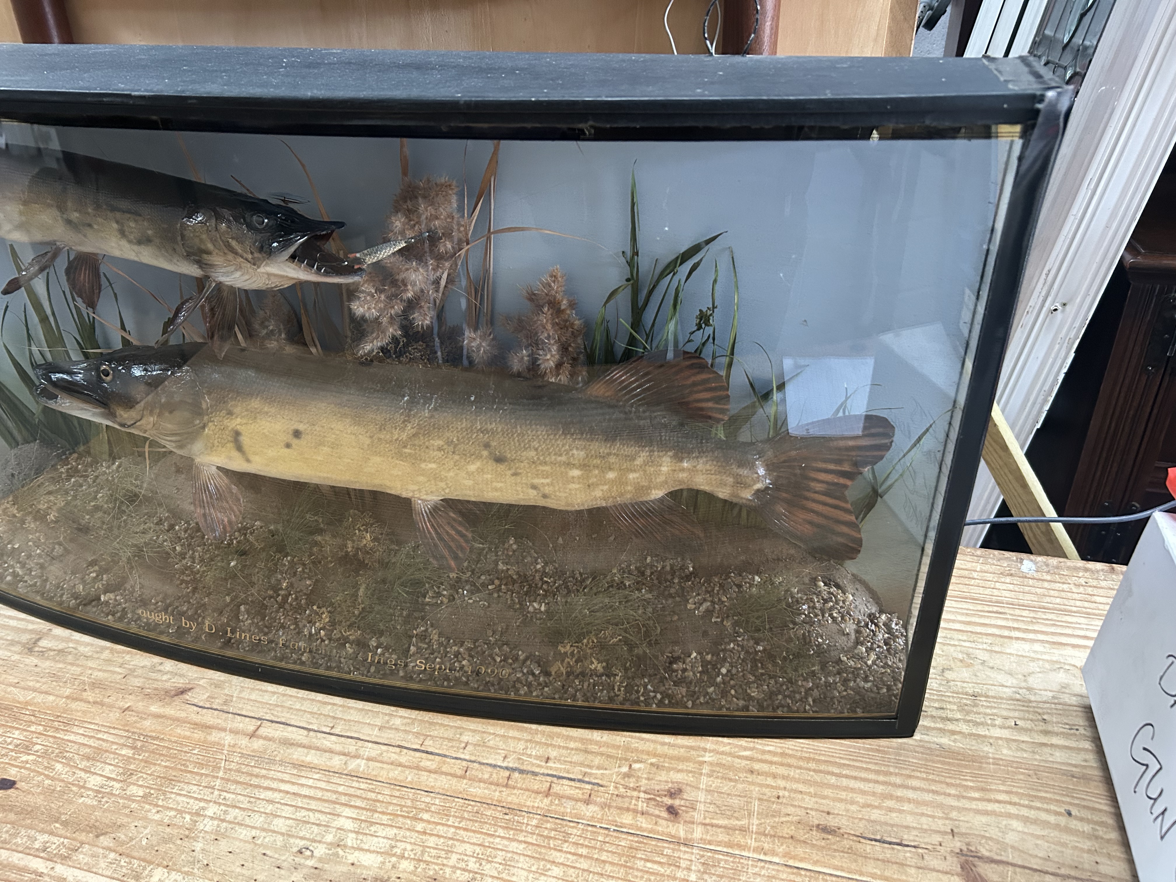 A taxidermy display featuring two specimens of pike (Esox lucius) presented in a naturalistic aquatic setting. The specimens are mounted within a black-finished wood and glass bow-fronted case. The interior diorama includes dried reeds, grasses, and a gravelly substrate, with one specimen shown with a silver-colored fishing lure in its mouth. The front glass panel is inscribed with gold-tone lettering that reads Caught by D. Lines Fairburn Ings Sept. 1990. The case is equipped with two metal hanging loops on the upper surface.