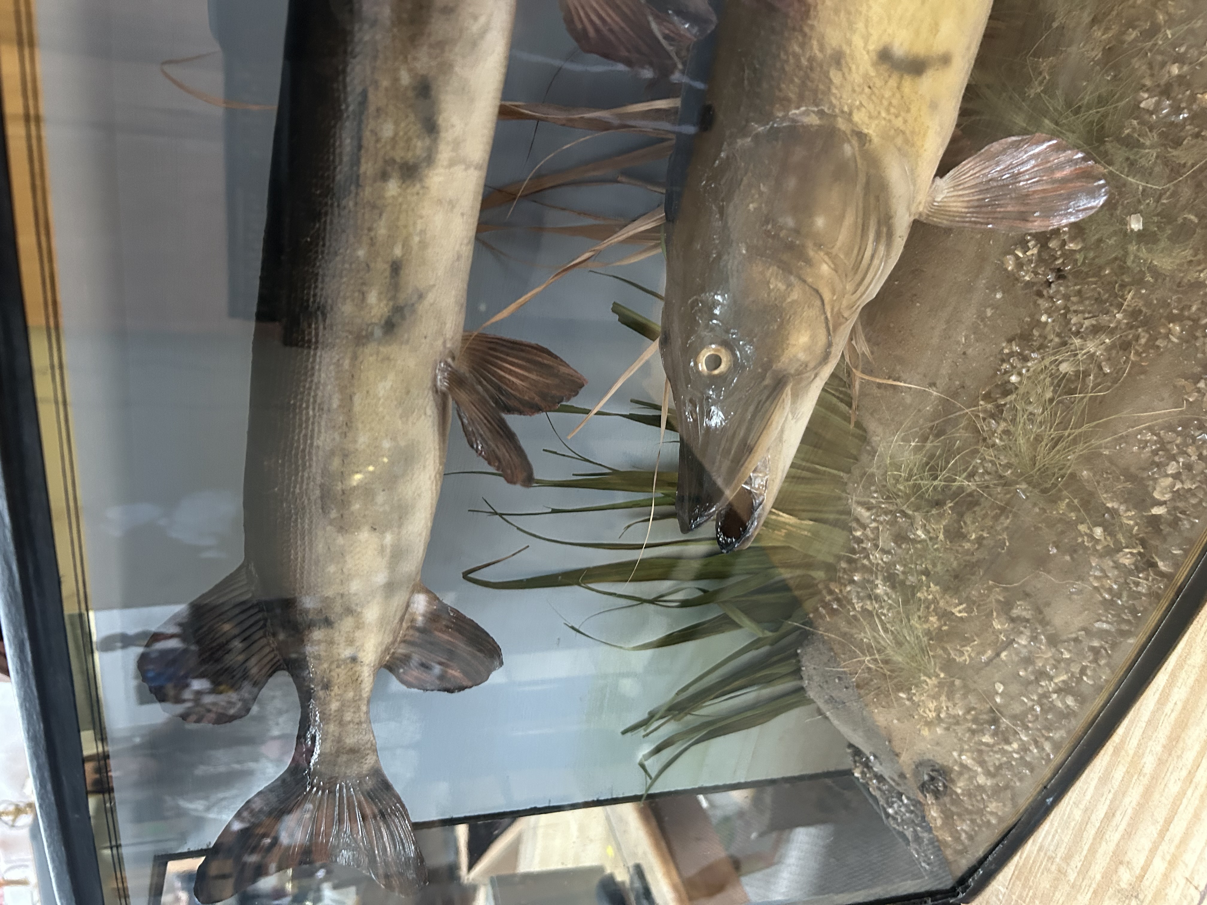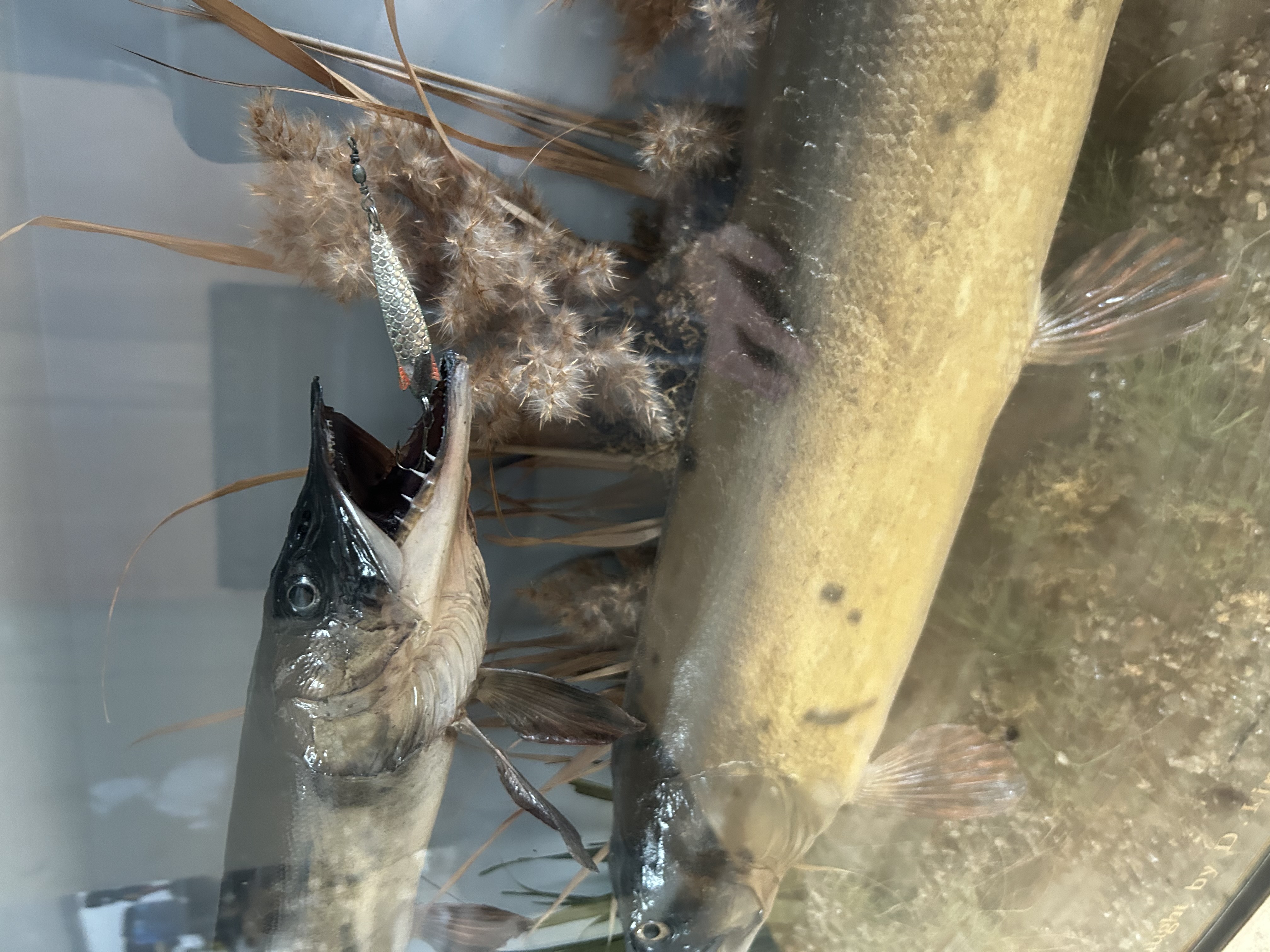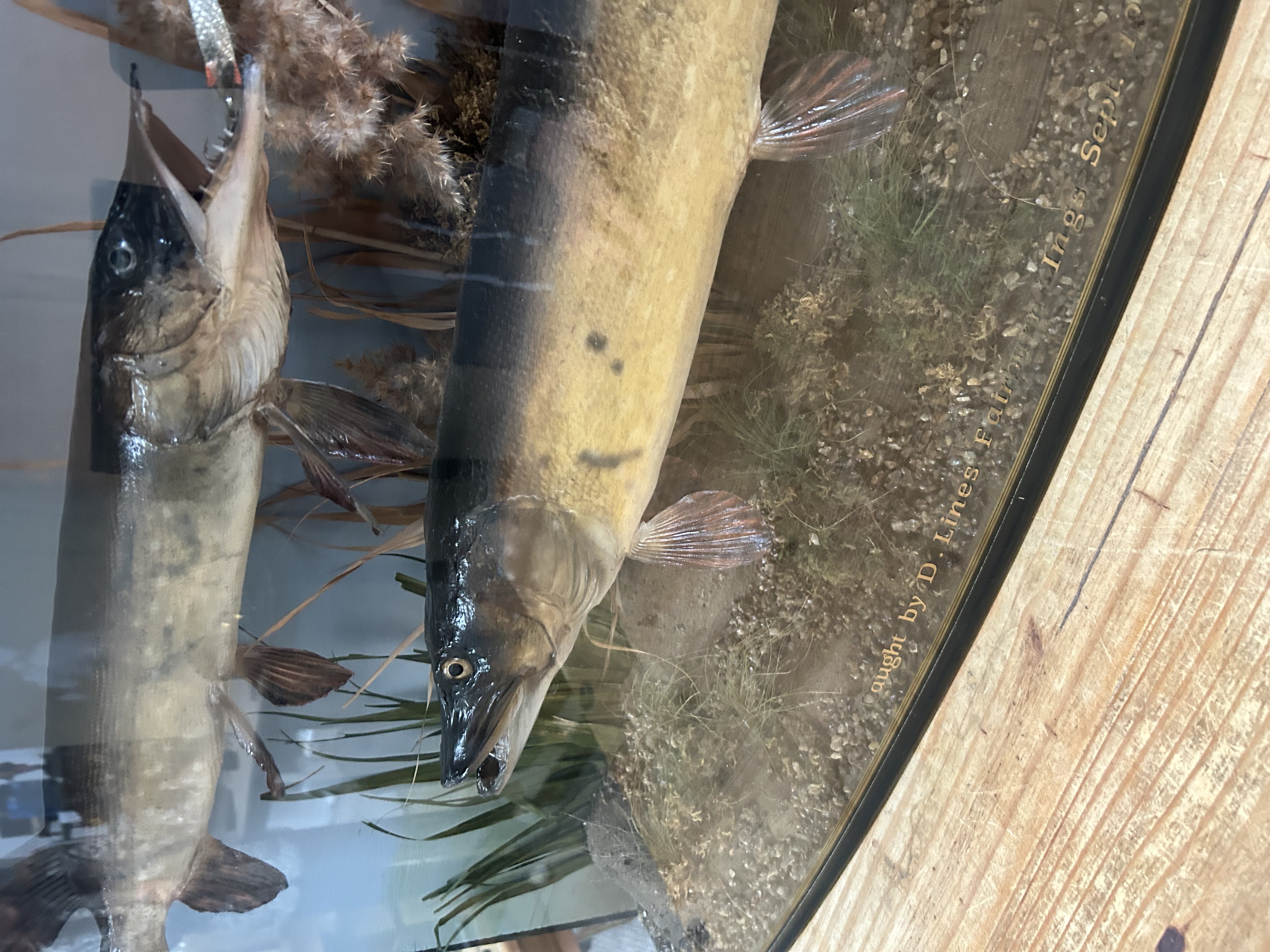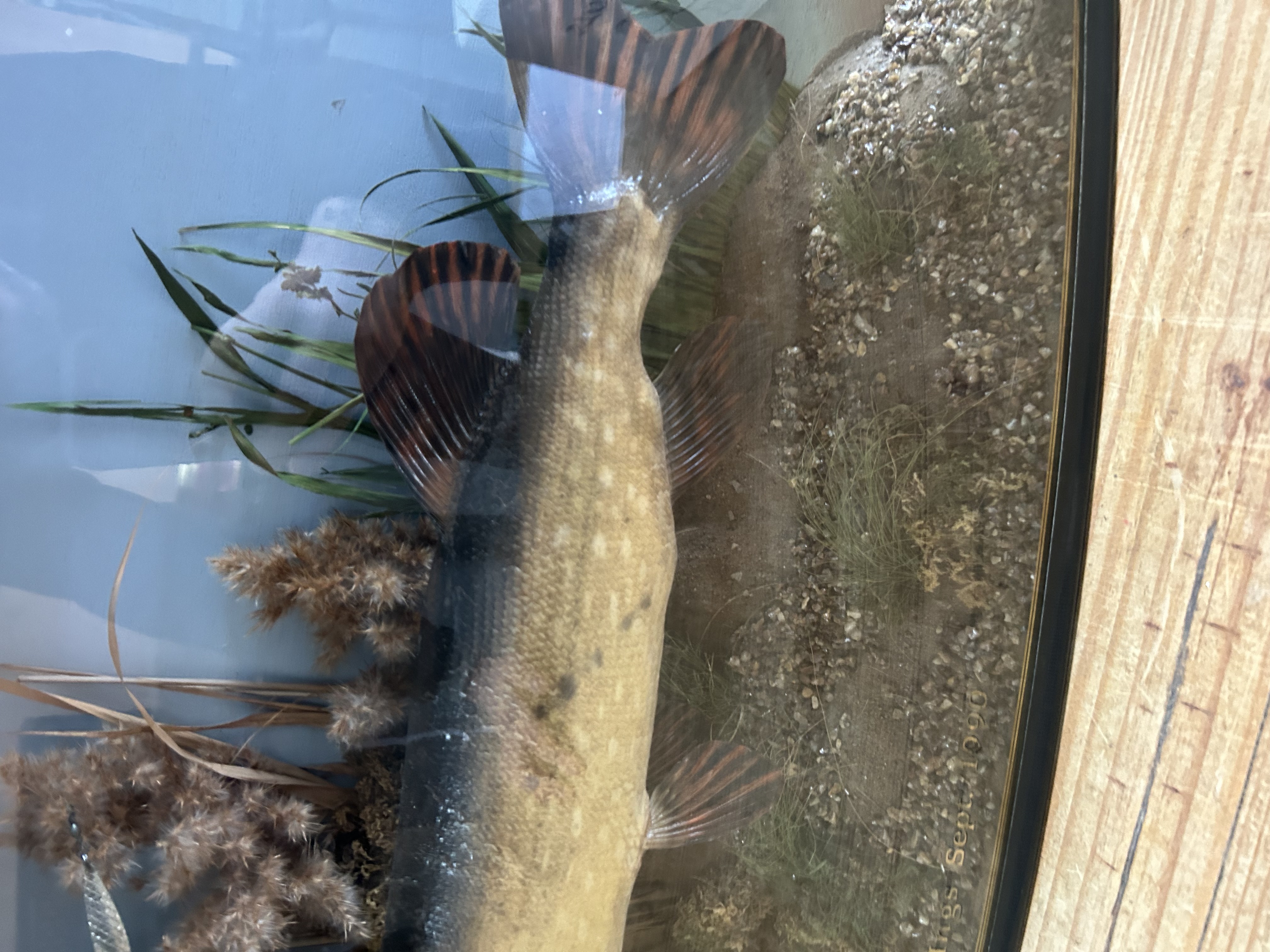 A taxidermy display featuring two specimens of pike (Esox lucius) presented in a naturalistic aquatic setting. The specimens are mounted within a black-finished wood and glass bow-fronted case. The interior diorama includes dried reeds, grasses, and a gravelly substrate, with one specimen shown with a silver-colored fishing lure in its mouth. The front glass panel is inscribed with gold-tone lettering that reads Caught by D. Lines Fairburn Ings Sept. 1990. The case is equipped with two metal hanging loops on the upper surface.