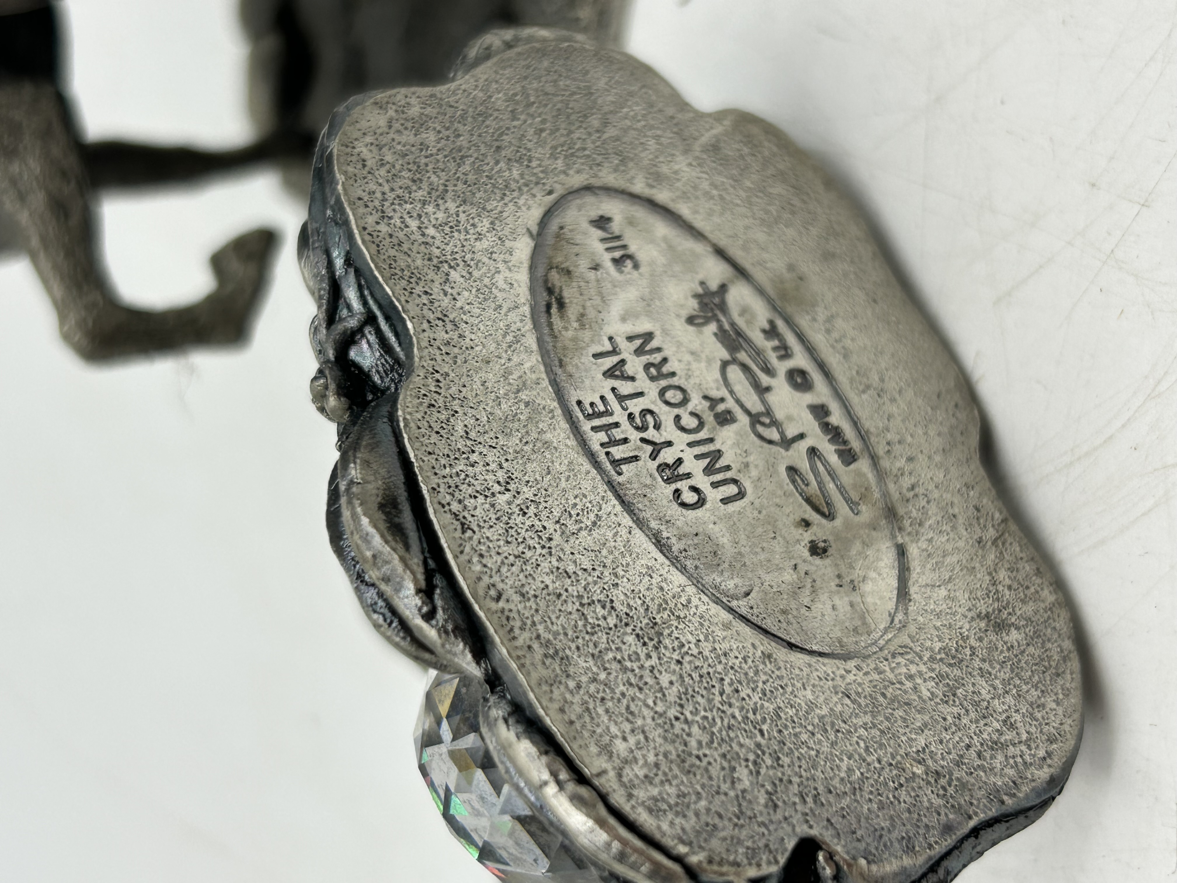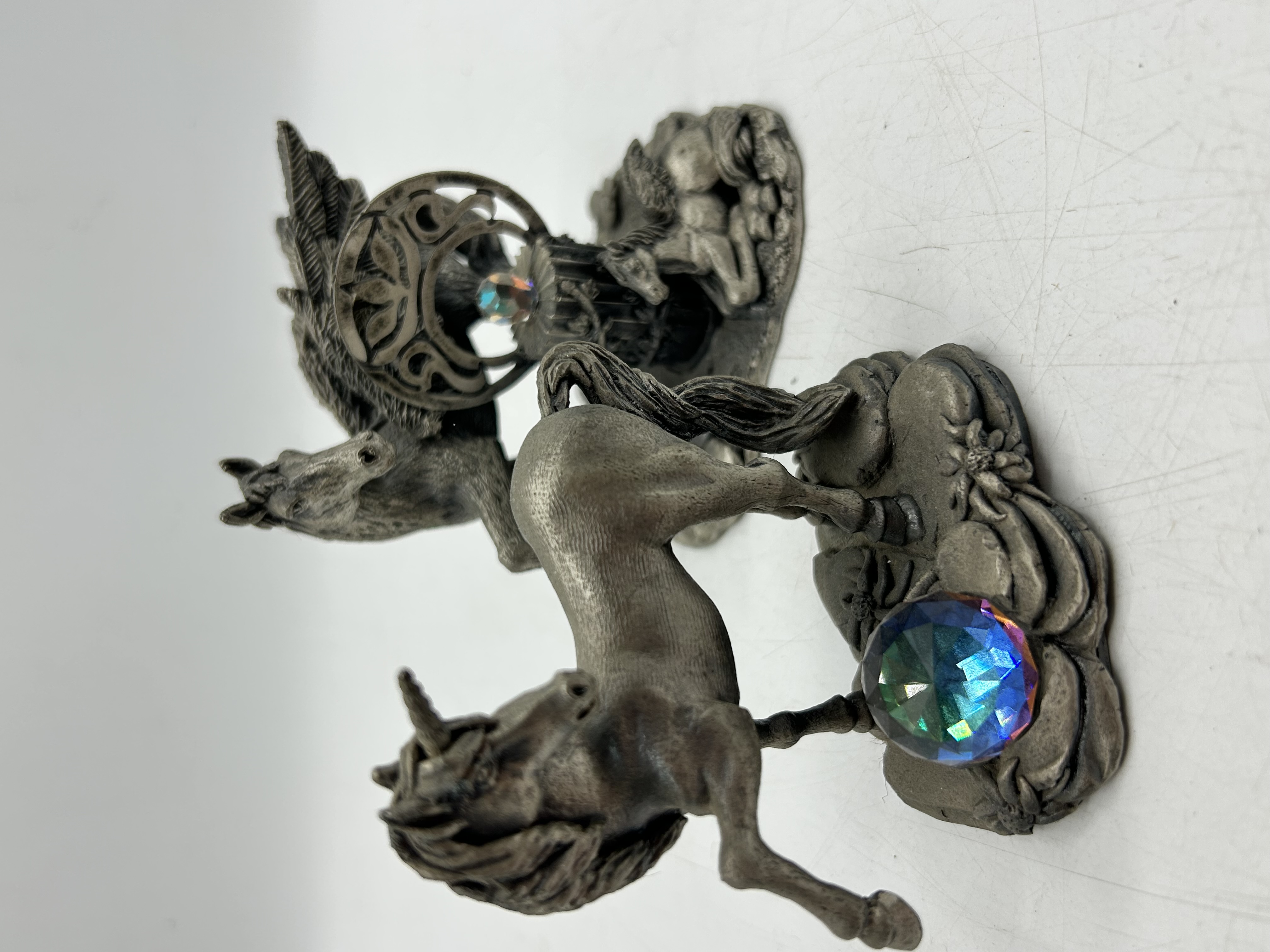 Two cast pewter figurines from the Myth and Magic collection by Tudor Mint. The lot includes a figurine titled The Crystal Unicorn and a winged horse figurine. Both pieces are cast in a grey metal with a textured matte finish and are accented with iridescent faceted crystal spheres. The base of the unicorn figurine is marked THE CRYSTAL UNICORN BY [illegible signature] © WAPW U.K. 3114. WAPW is the manufacturing mark associated with the Tudor Mint Myth and Magic series.