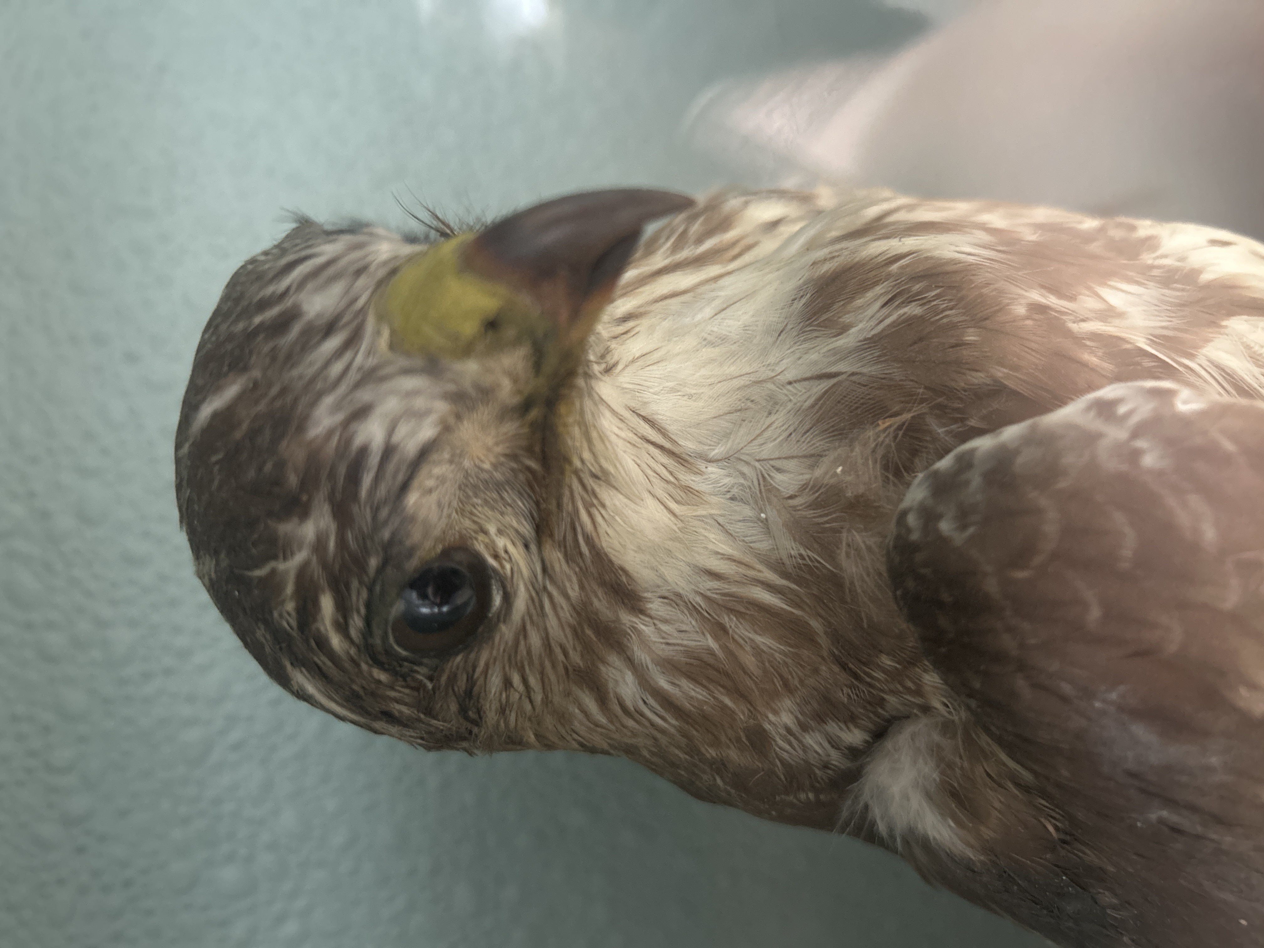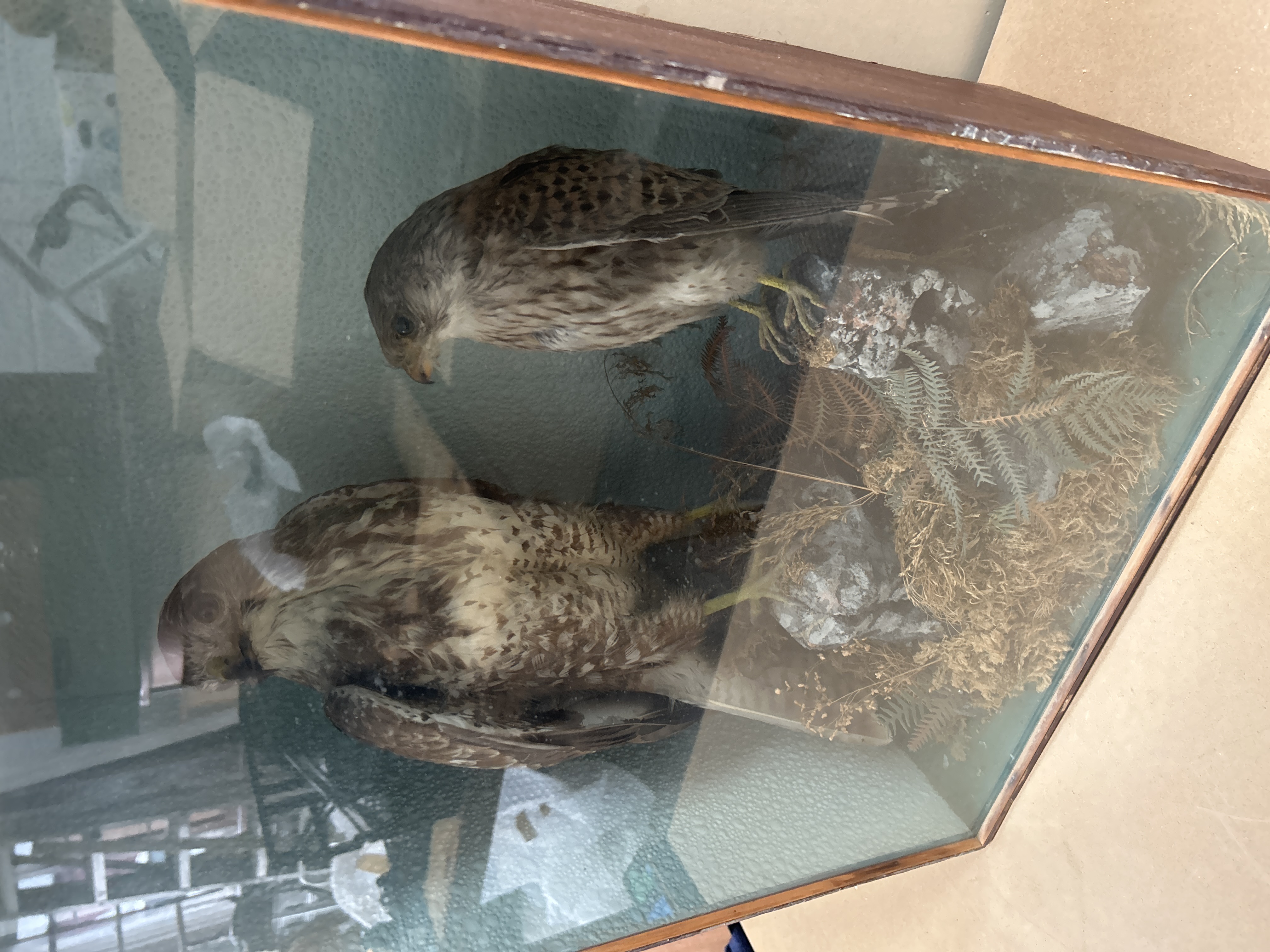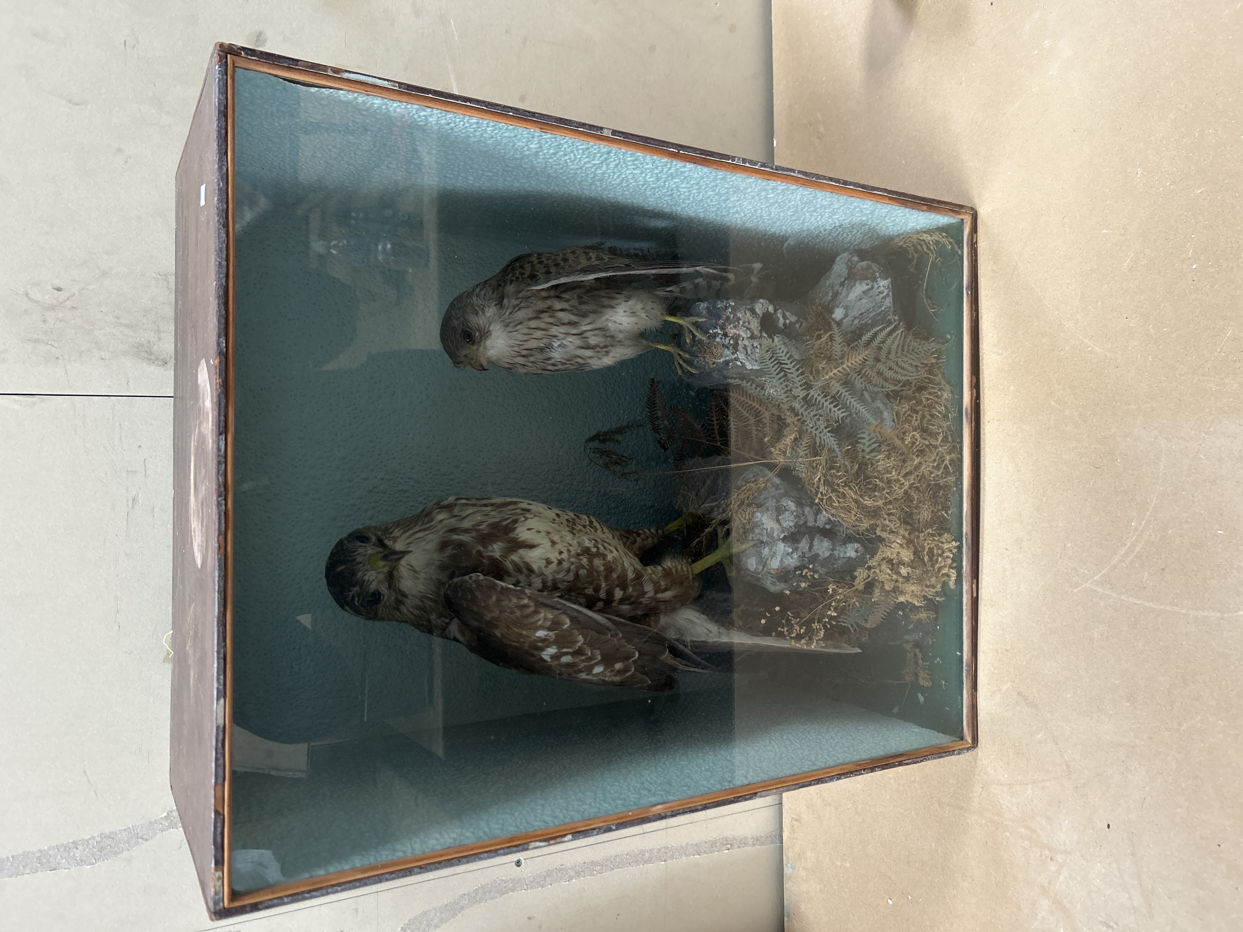 A taxidermy display by Hutchings of Aberystwyth featuring two birds of prey, including a buzzard and a smaller specimen, possibly a kestrel. The birds are mounted in a naturalistic setting composed of rocks, moss, and dried vegetation. The specimens are housed within a rectangular wooden case measuring 24 x 19”, featuring a glass front and a textured, light blue-green interior. A small white identification sticker is affixed to the upper left corner of the wooden frame.