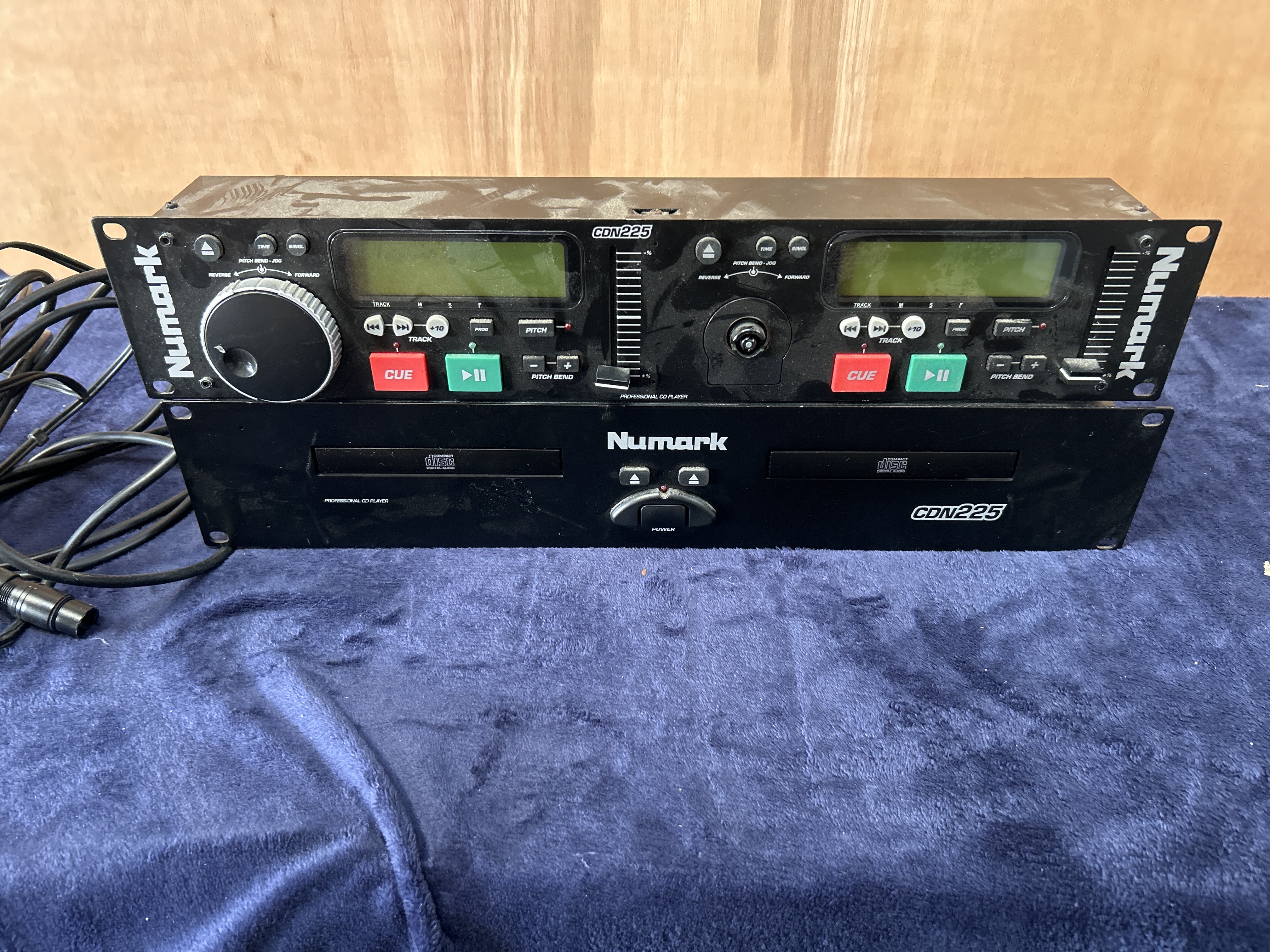 A professional dual CD player system manufactured by Numark, model CDN225. The lot comprises two separate rack-mountable components finished in black. The first unit is a control interface featuring dual backlit LCD displays, independent pitch control sliders, and various playback buttons including large red CUE and green play/pause controls. The second unit is a dual-tray CD transport mechanism. Both units are clearly marked with the Numark brand and CDN225 model designation and include integral rack ears for installation in standard equipment racks. The system is accompanied by associated power and interface cabling.