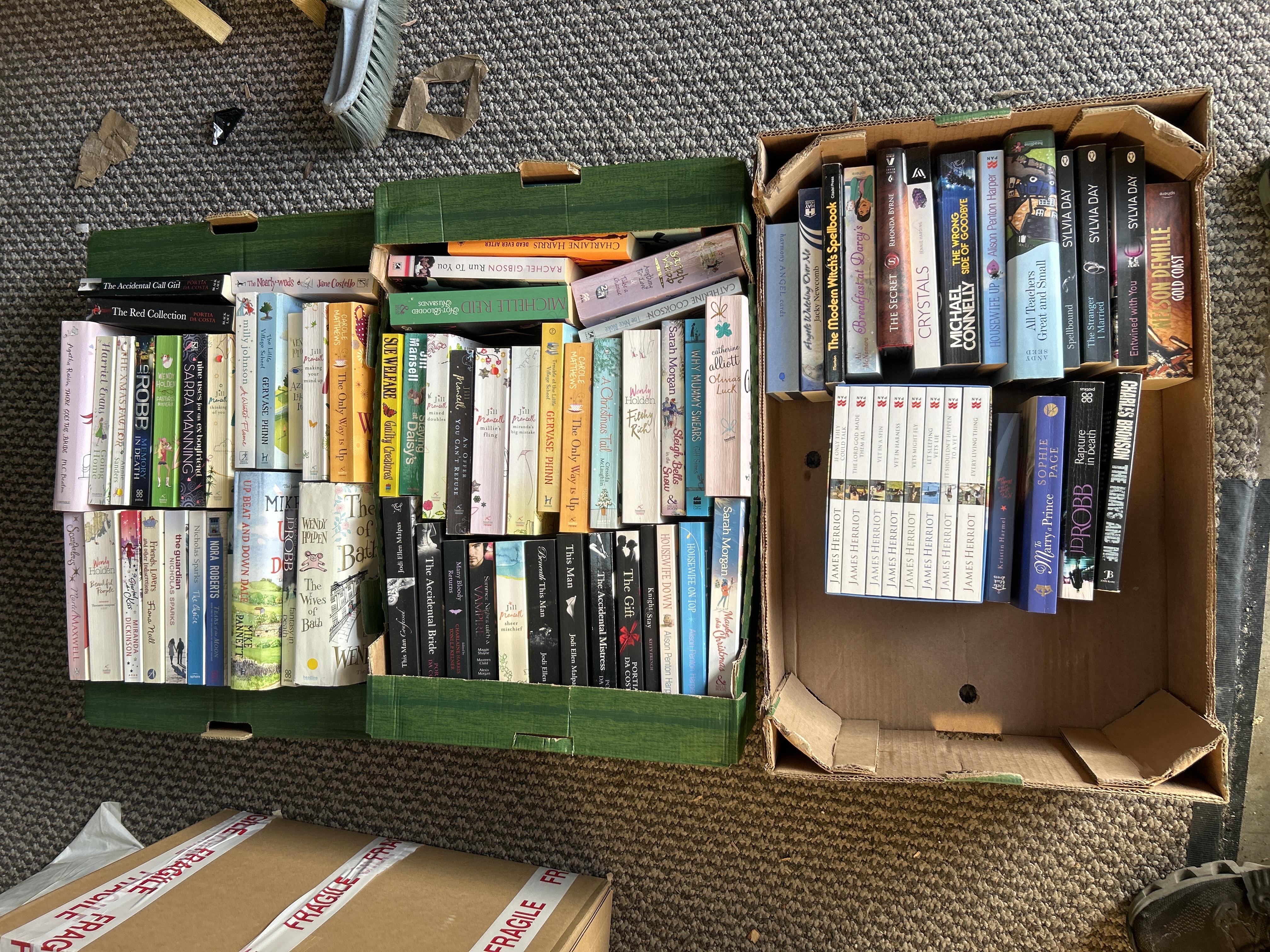 A large collection of contemporary mass-market paperback books encompassing various genres such as contemporary romance, crime fiction, thrillers, and lifestyle non-fiction. Notable authors represented in the group include James Herriot, Sylvia Day, Michael Connelly, Nelson DeMille, J.D. Robb, Nora Roberts, Jill Mansell, Gervase Phinn, and Carole Matthews. The books are housed in several green and brown cardboard boxes.