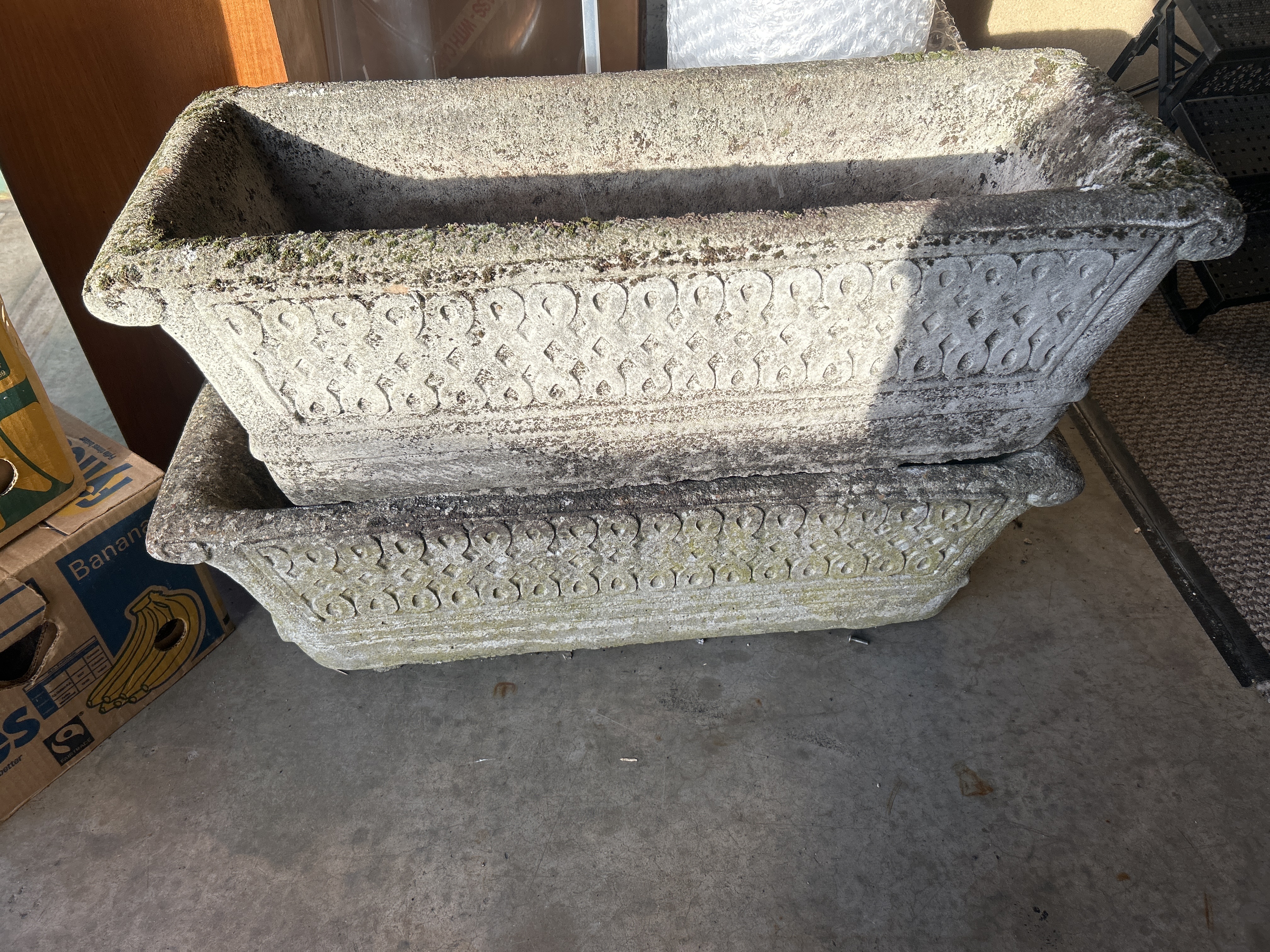 A pair of large rectangular garden trough planters, each measuring 36 inches wide, crafted from cast composition stone. The design features a flared rim above a decorative exterior band of relief-moulded repeating heart and scroll motifs. These troughs are substantial in form and intended for garden or patio placement.