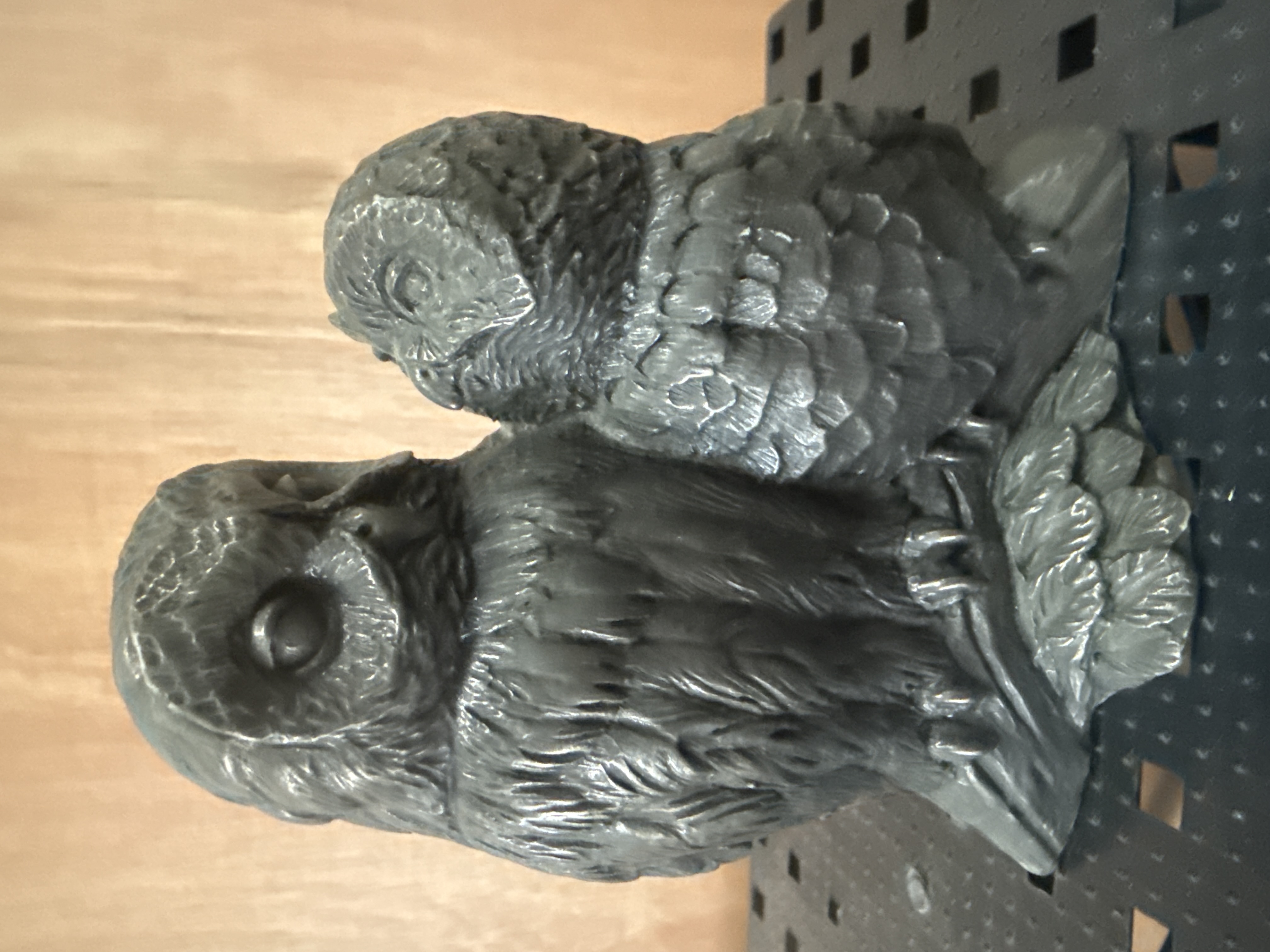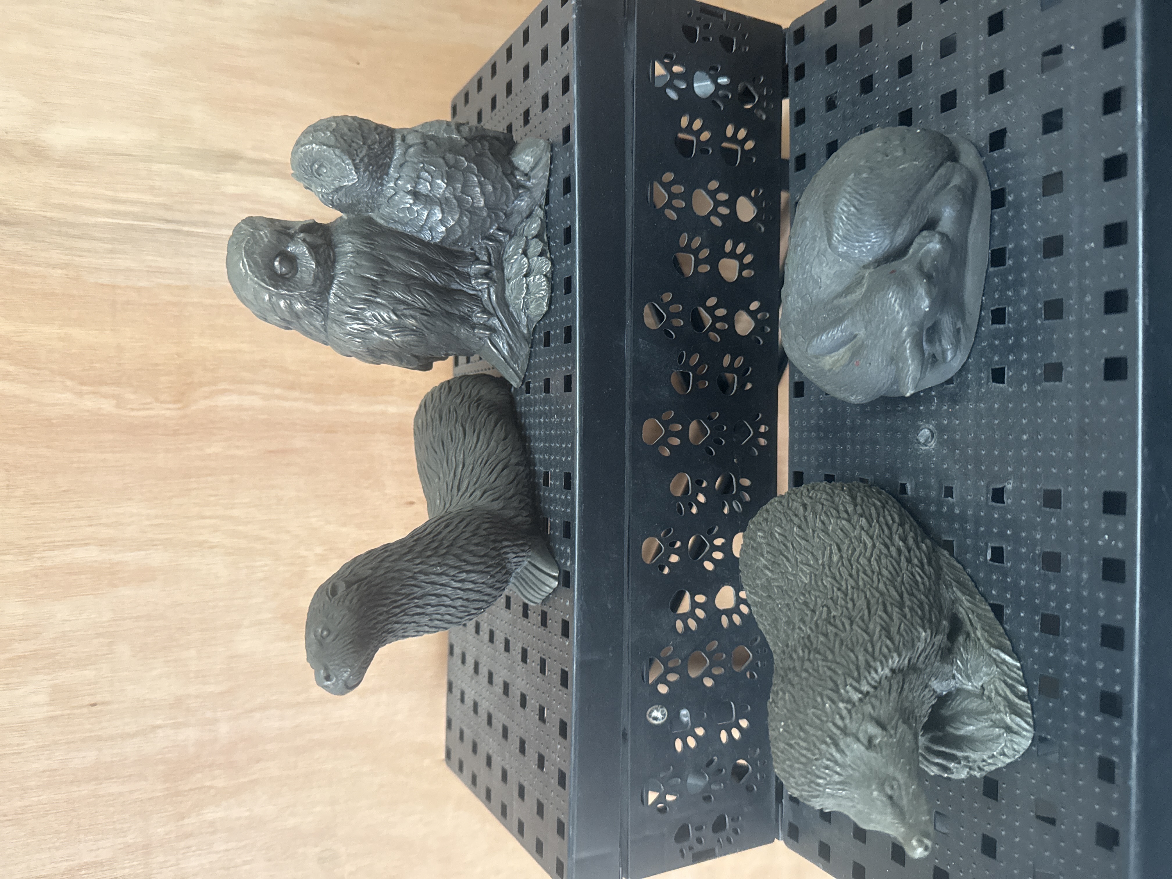 This collection of animal figurines is attributed to The Wolf Sculptures, also known as A Wolf Original, Canada. The group includes various wildlife subjects including a pair of owls on a branch, a resting otter, a curled fox, and a hedgehog. Each piece is cast in a dark gray composite material with a finish intended to simulate hand-carved soapstone. The sculptures feature detailed textural representations of fur, feathers, and quills. The items are contemporary in style and exhibit a matte to low-luster stone-like appearance. No maker marks are visible on the exterior surfaces.