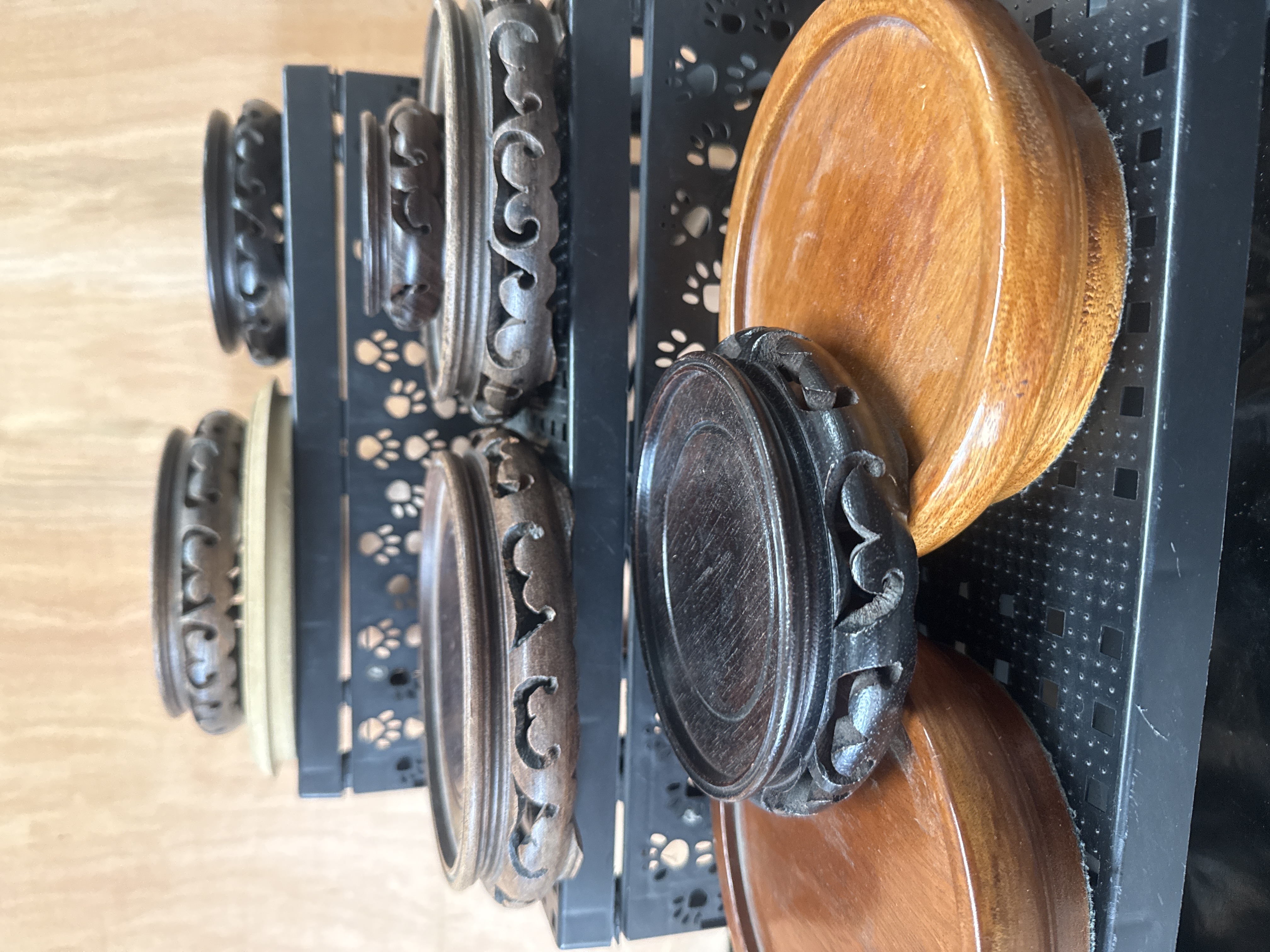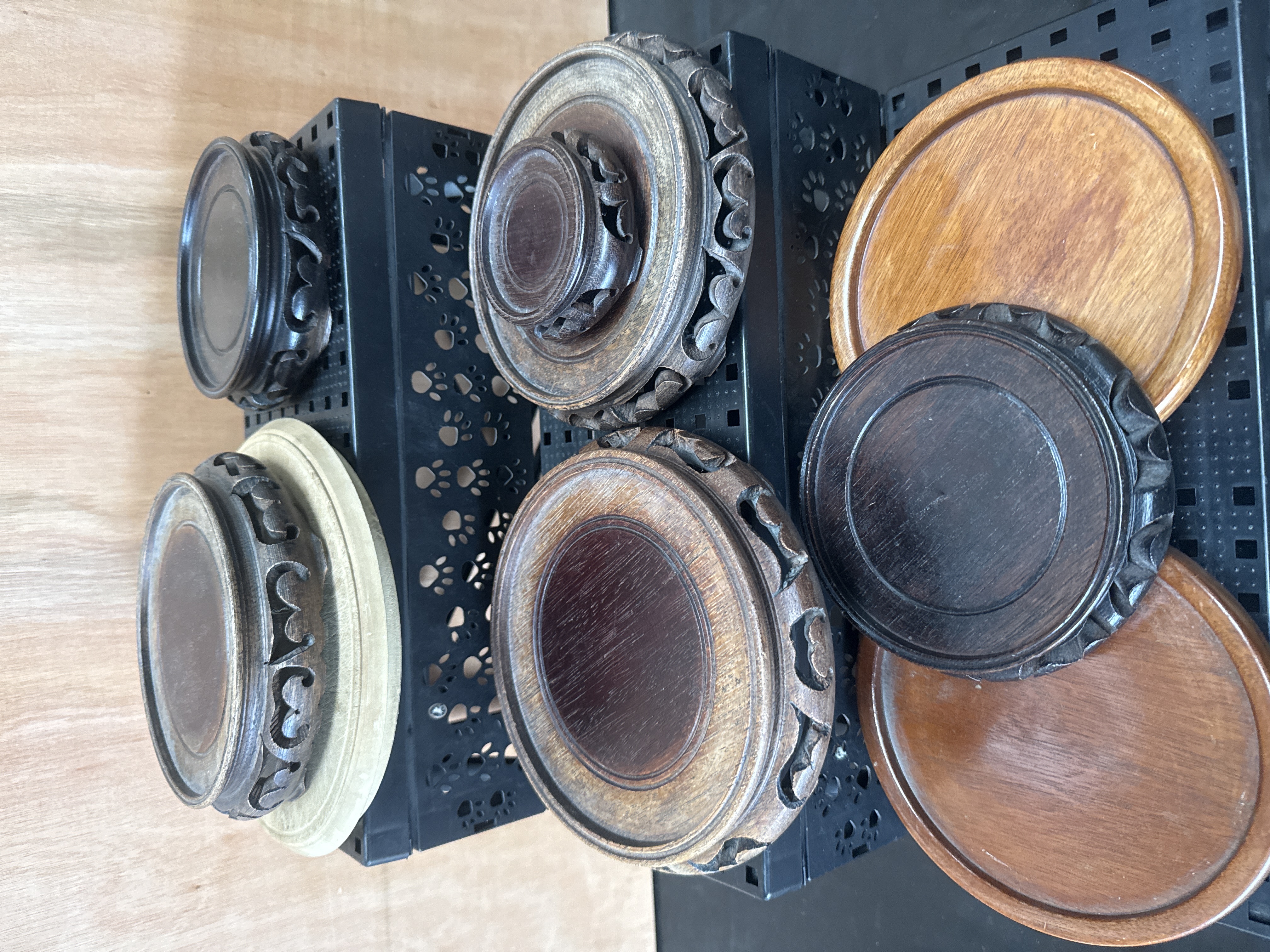 A collection of Chinese carved wooden display stands in various sizes and finishes. The group includes stands with ebonized, medium-brown, and light-blonde wood tones. The stands are of circular construction, many featuring pierced openwork bases with ruyi-head and scroll motifs. The assortment includes different heights and profiles, including stepped and multi-tiered designs. These stands are traditionally used to support ceramic vessels such as vases and ginger jars.