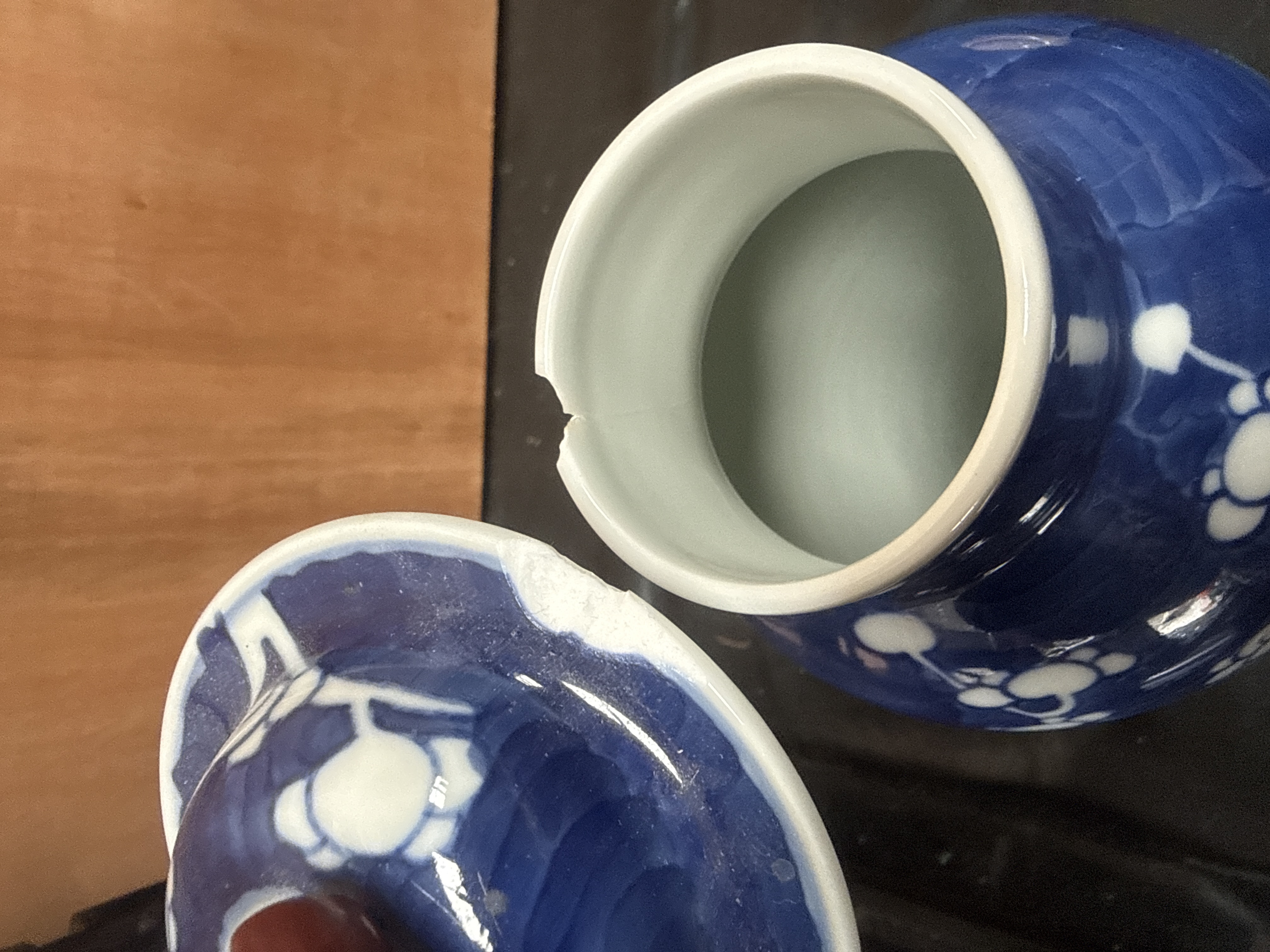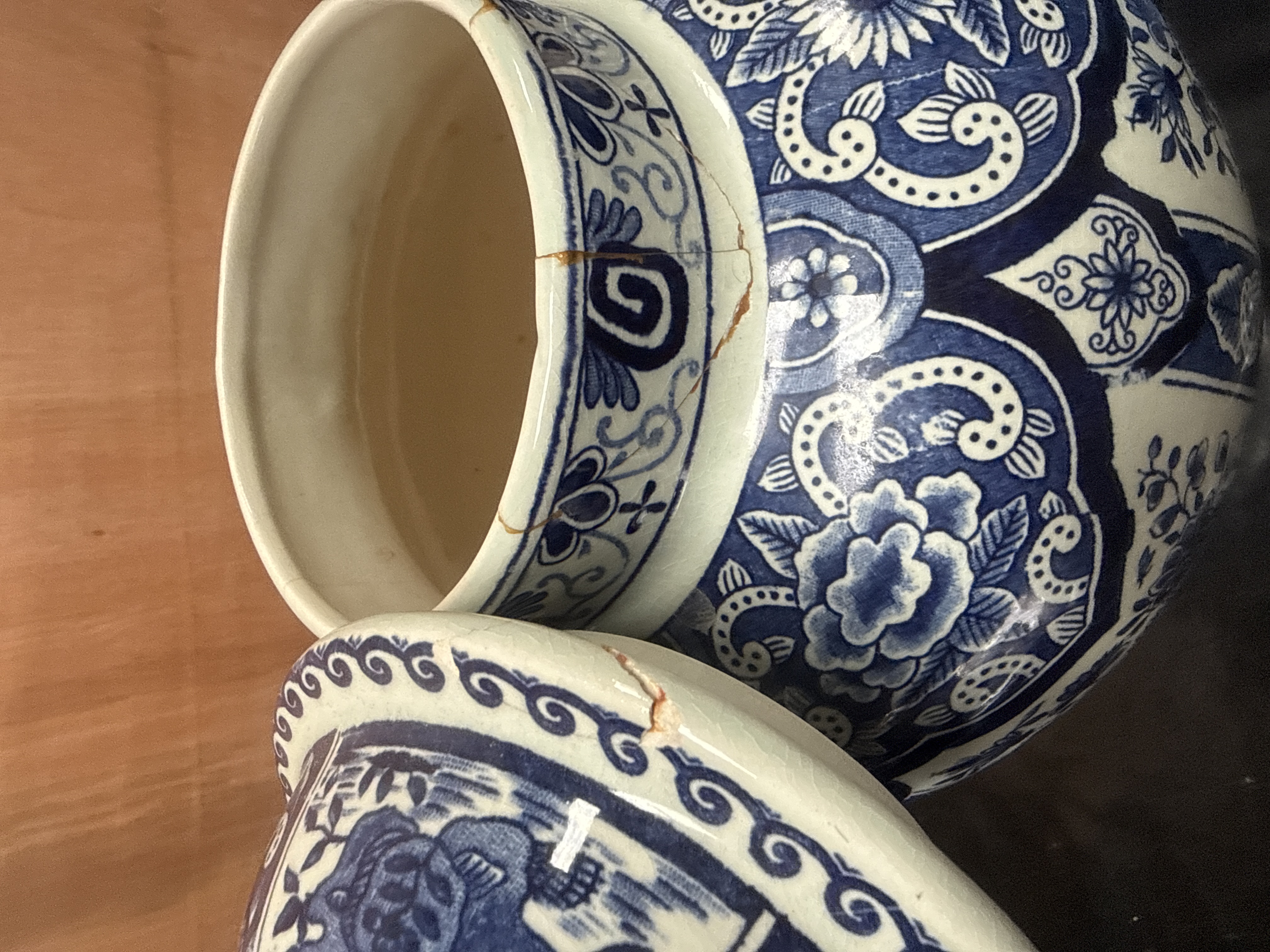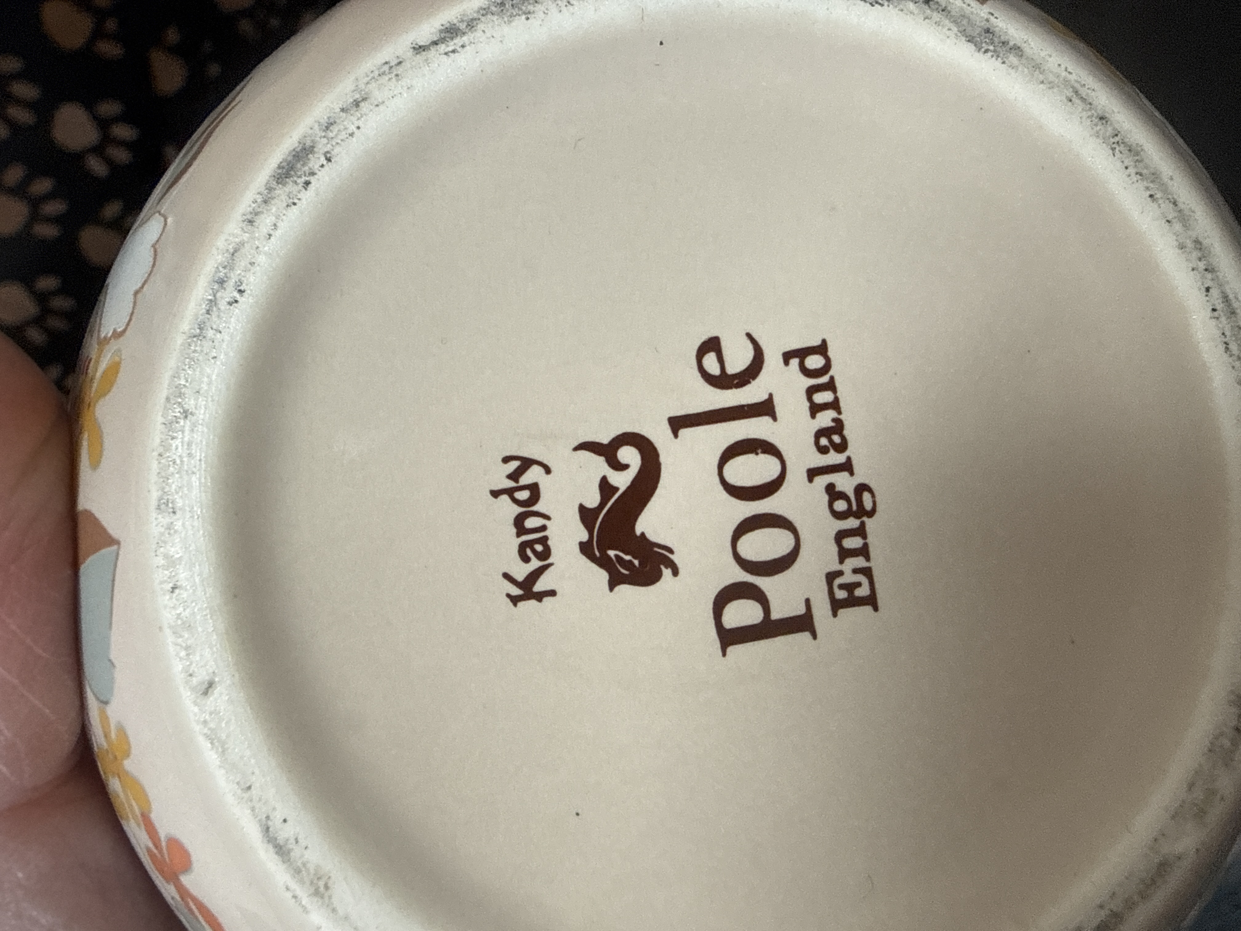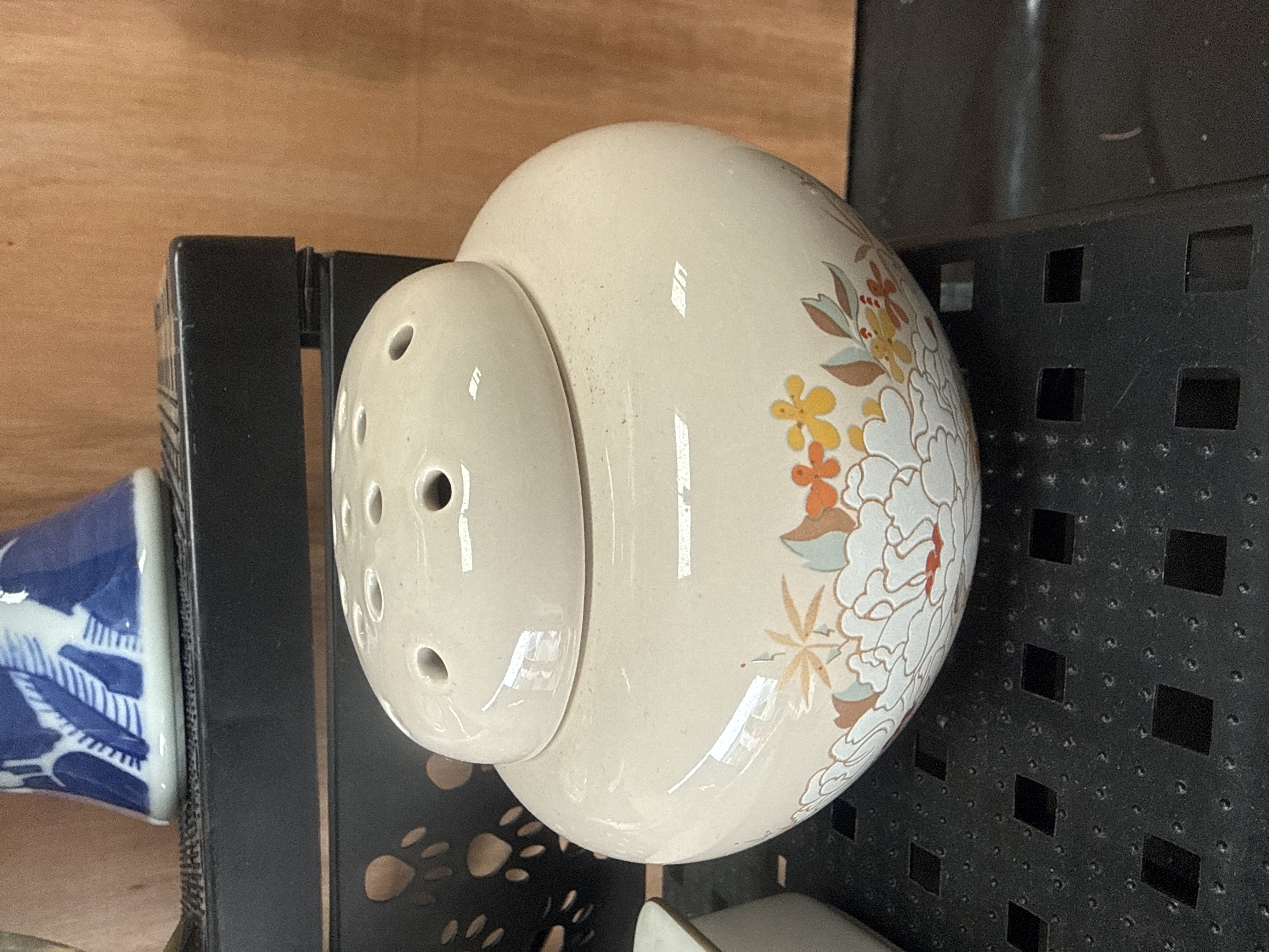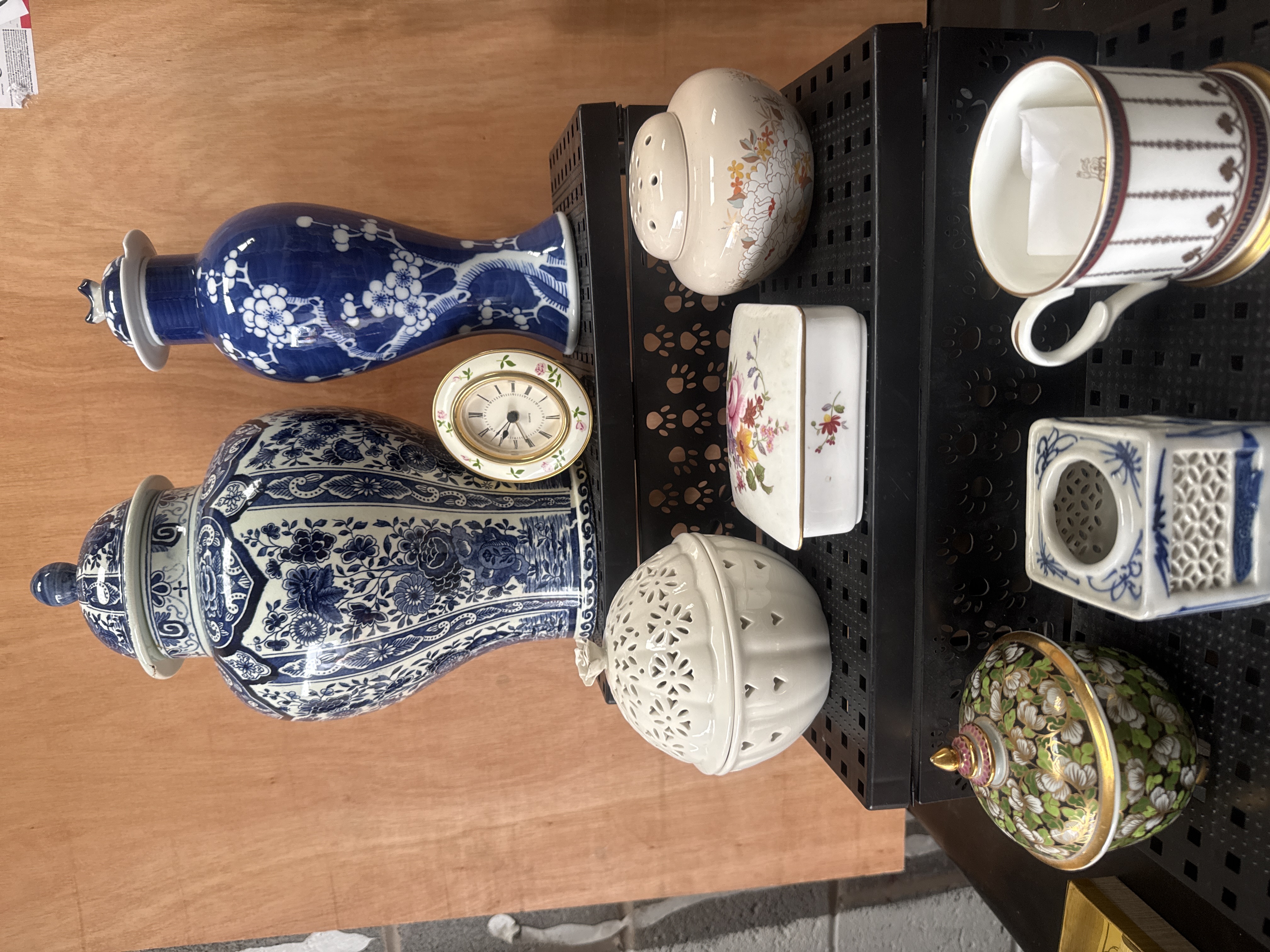 An assortment of ceramic and porcelain decorative objects. The collection includes two large lidded jars with blue and white underglaze decoration featuring floral and scrolling motifs. One jar is decorated with a prunus pattern on a cobalt ground, while the larger jar features dense floral scrolls and patterned borders. The group further includes a small ceramic-encased desk clock with floral transfers, a white pierced porcelain potpourri jar, a rectangular floral trinket box, and a lidded vessel with gold-gilt floral decoration. One cream-colored item with floral patterns is marked on the underside Kandy Poole England with a seahorse logo. The lot also contains a ceramic mug with vertical striping and a small square blue and white pierced vessel.