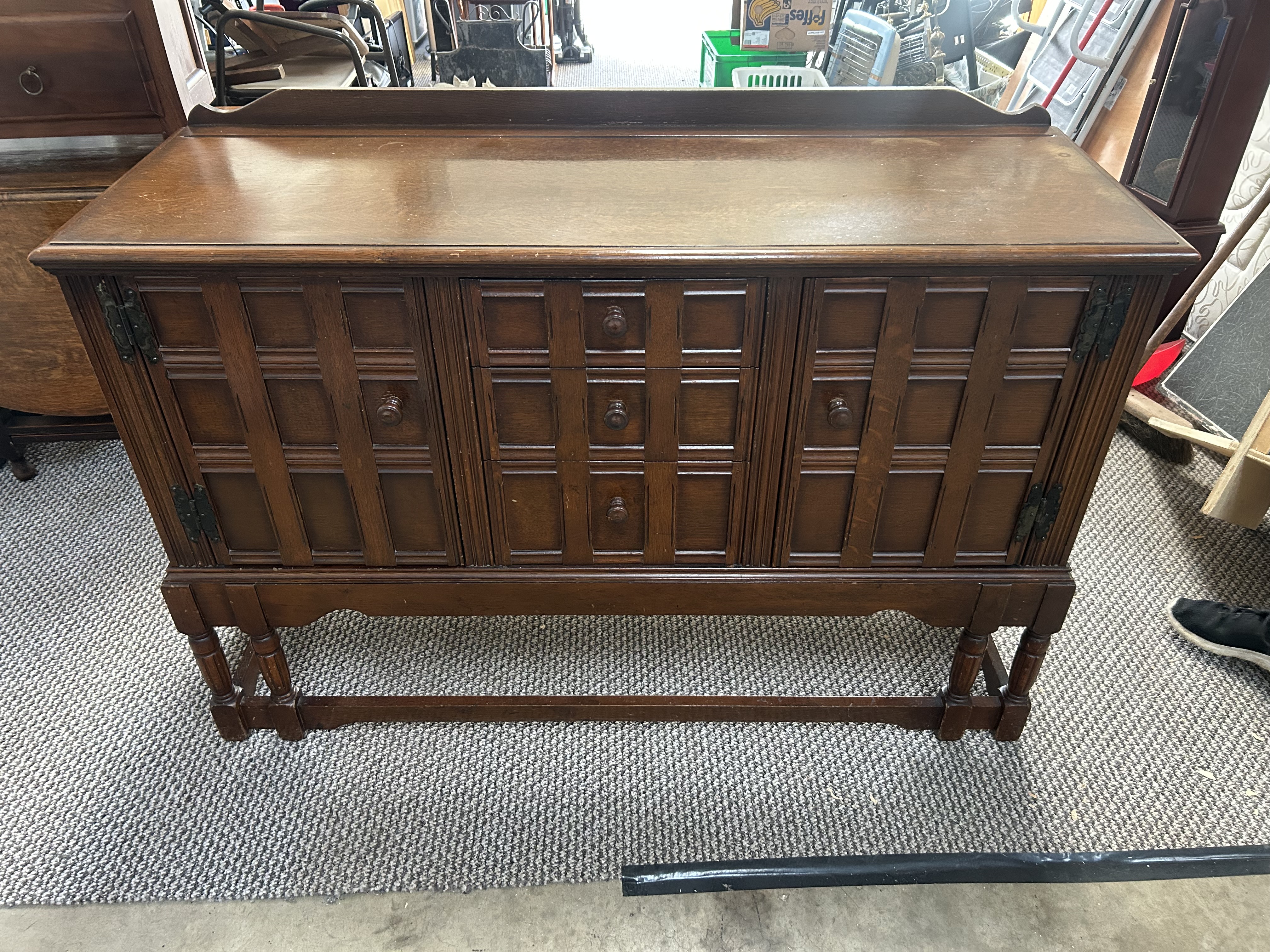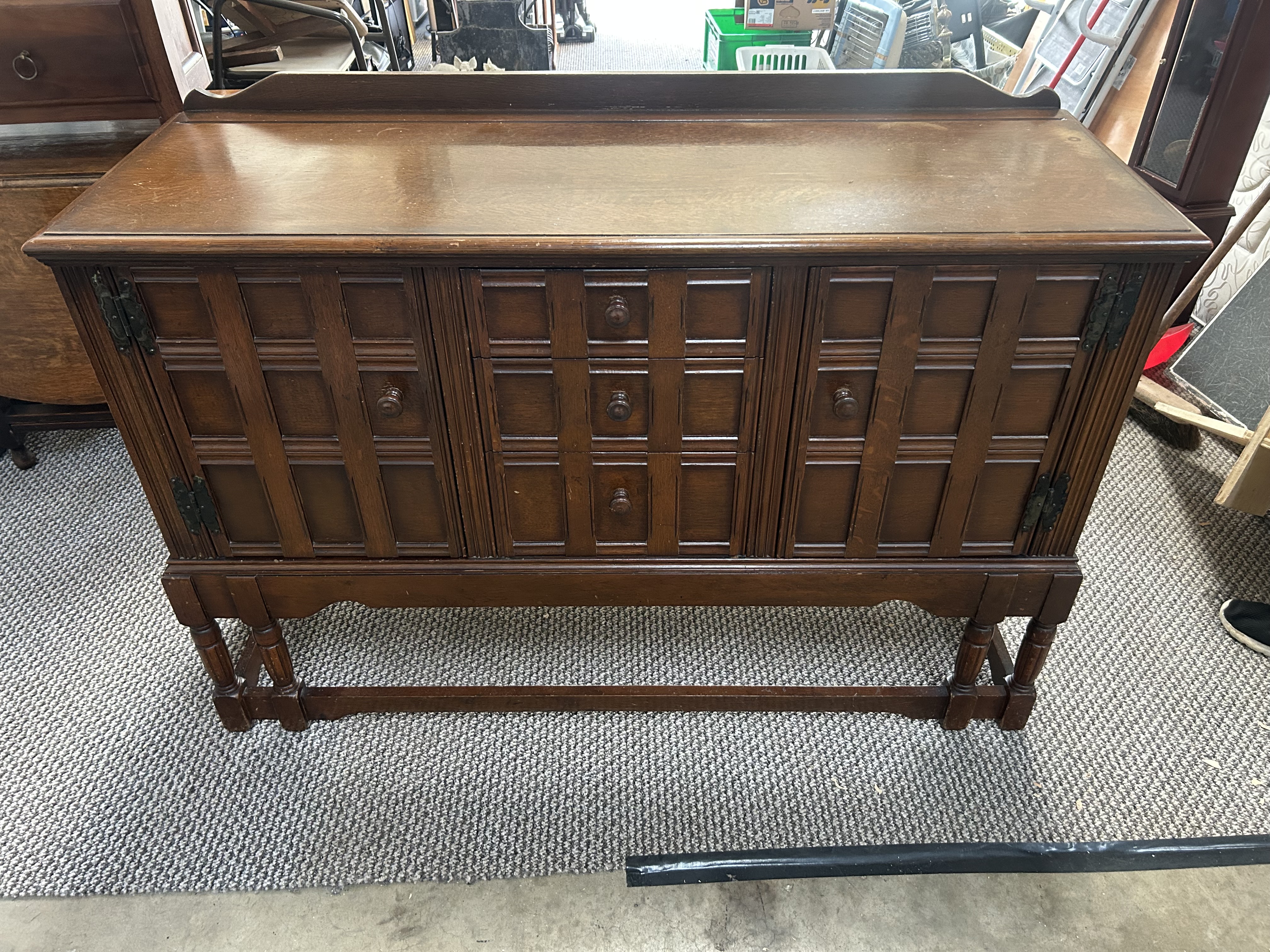 A mid-20th-century oak sideboard designed in the Tudor revival style. The piece is constructed from dark-stained oak and features a rectangular top with a low-profile backsplash. The configuration consists of three centrally stacked drawers flanked by two cupboard doors. The drawer and door fronts are decorated with deeply recessed rectangular panels. The unit is fitted with small circular wooden pull knobs and the doors are mounted on exposed patinated metal hinges. The sideboard is raised on four turned legs joined by a floor-level stretcher and features a scalloped lower apron.