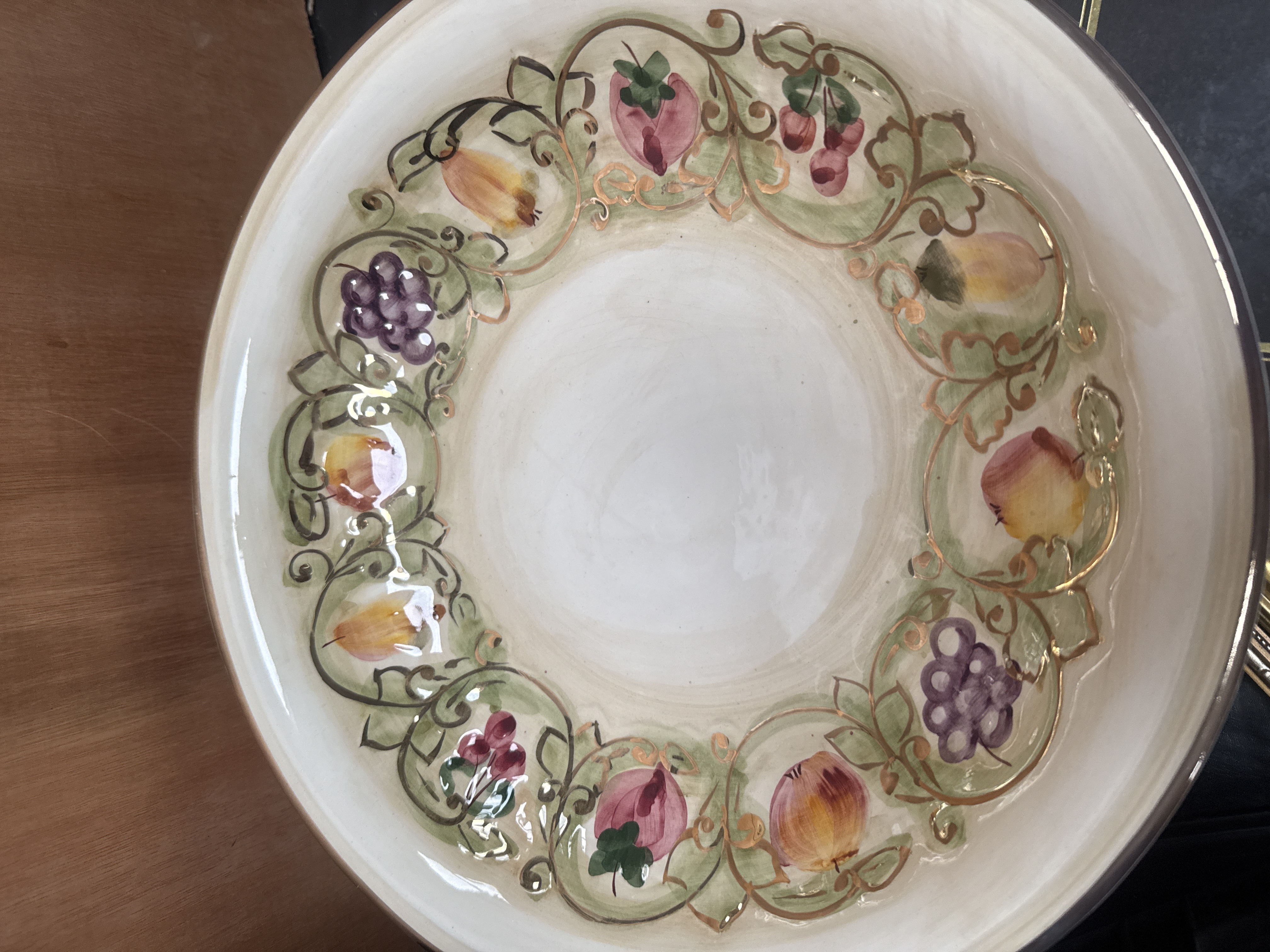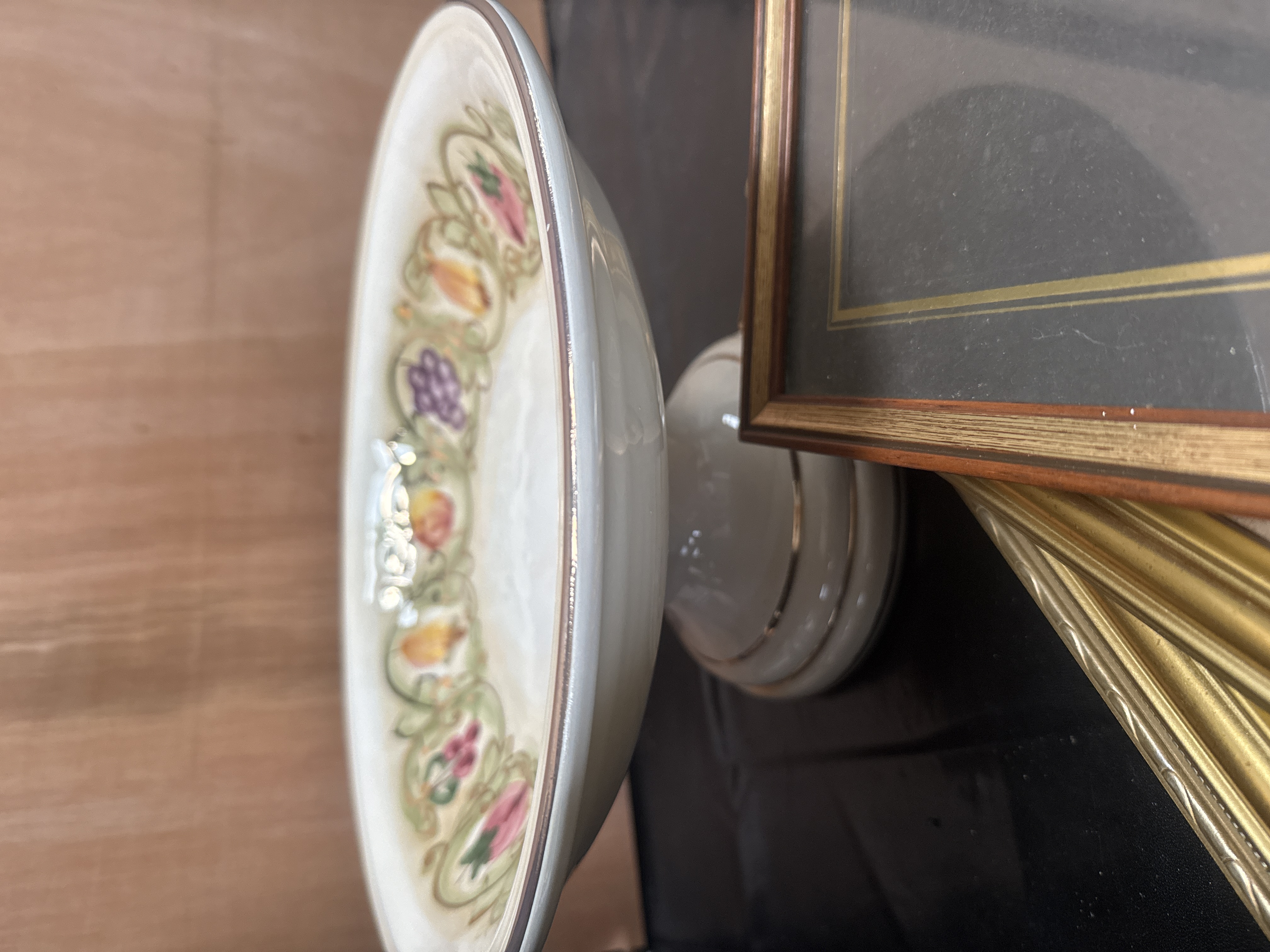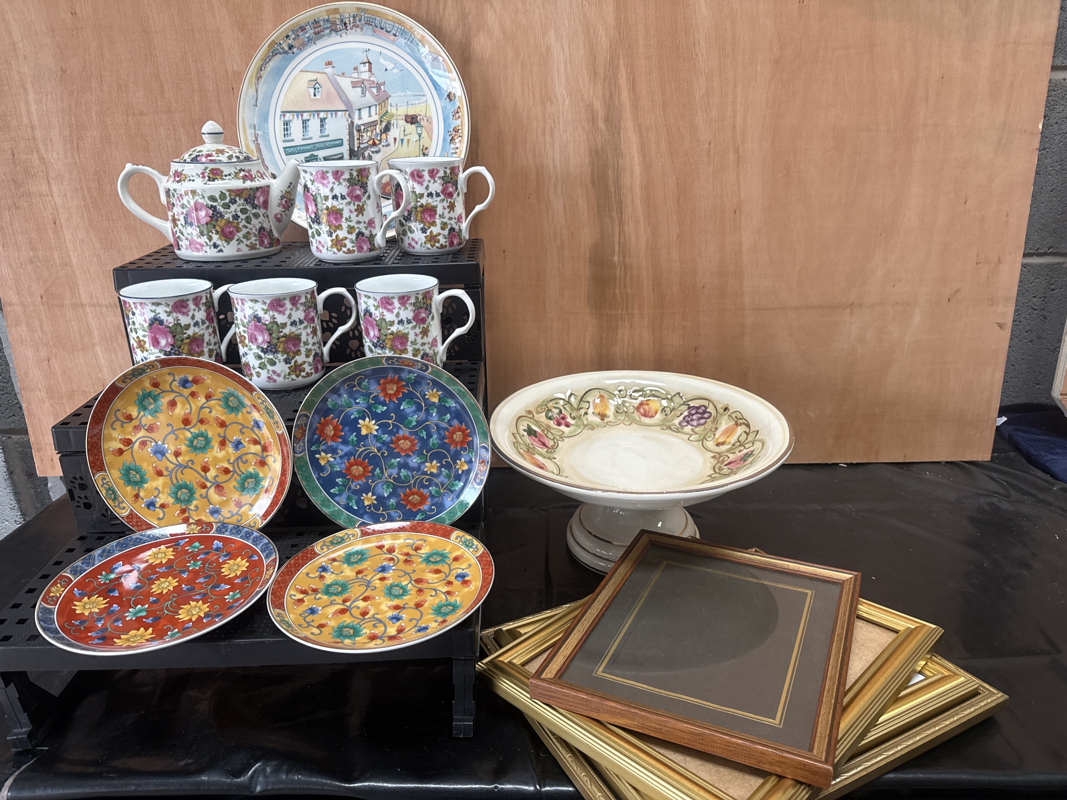 This collection features an assortment of decorative ceramic housewares and picture frames. The assembly includes a footed pedestal bowl with a hand-painted fruit-and-vine border and gilt accents, attributed to Cercapia, Portugal, circa 1970. The ceramic group also contains a teapot and multiple matching mugs decorated with a dense pink floral pattern. A large scenic charger depicts a coastal village with the inscription Sea Front Tea Rooms. Several small plates are finished in a Chinoiserie style with vibrant yellow, blue, and red floral and scrolling vine patterns. The lot is completed by a collection of picture frames, including a wooden frame with a gold-toned inner border and several stacked frames with metallic gold finishes.