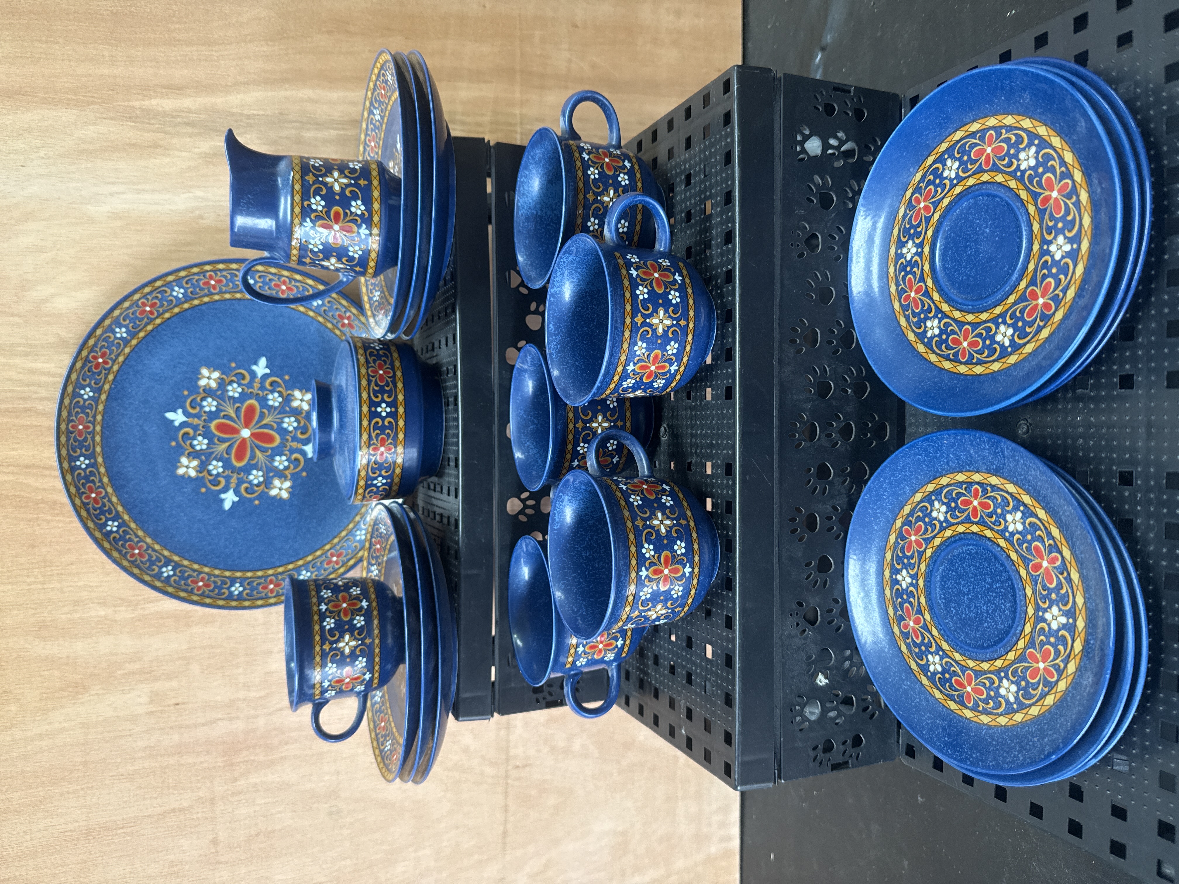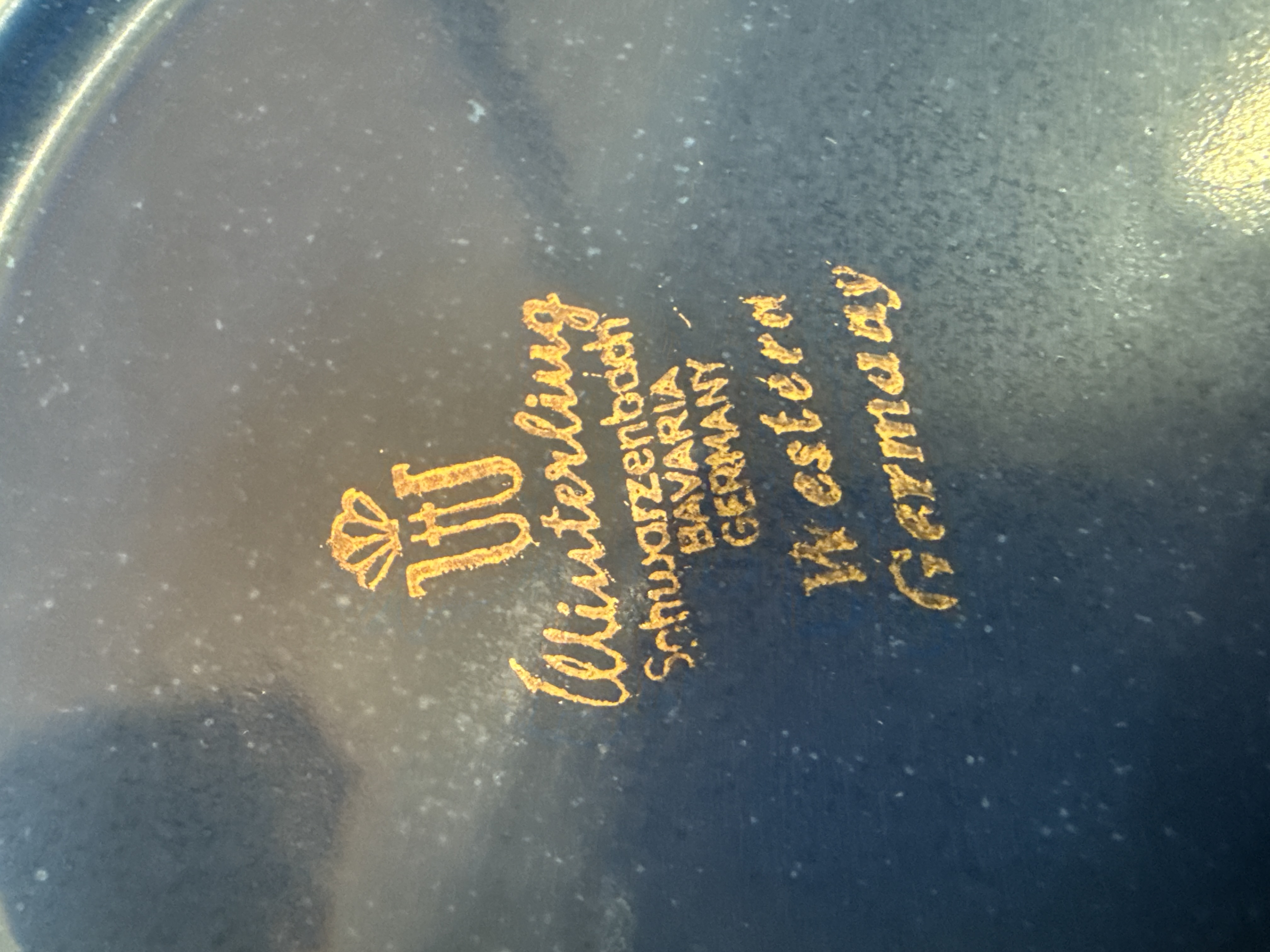 A 21-piece porcelain coffee service manufactured by Winterling in Schwarzenbach, Bavaria, Germany. The set features a deep mottled blue glaze decorated with a stylized folk-style floral and geometric pattern in shades of red, yellow, and white. The collection consists of cups, saucers, a large circular serving plate, a lidded sugar bowl, and a creamer pitcher. Each piece is marked on the underside with a gold-tone backstamp including a crowned W logo and the text Winterling, Schwarzenbach, Bavaria, Germany, Western Germany.
