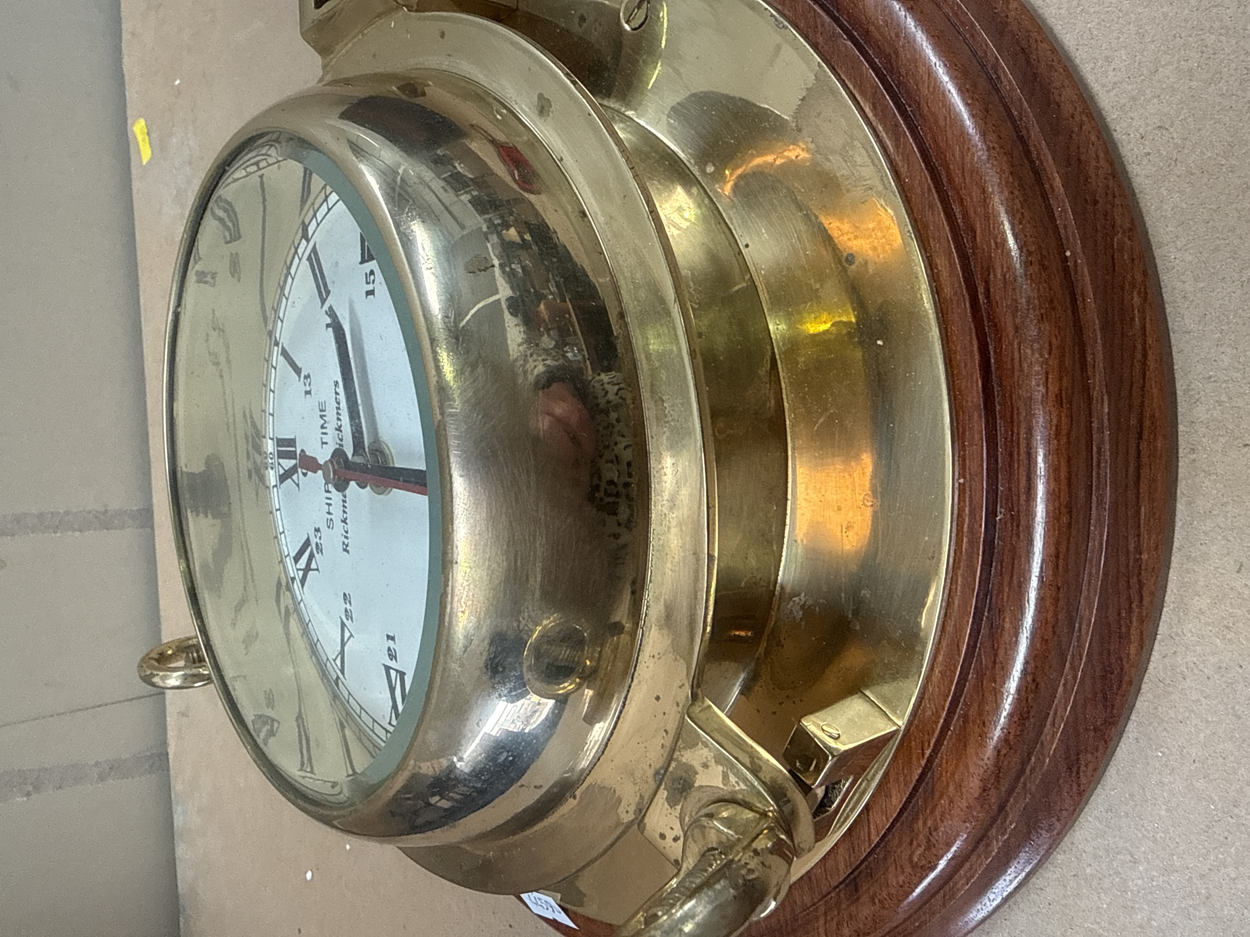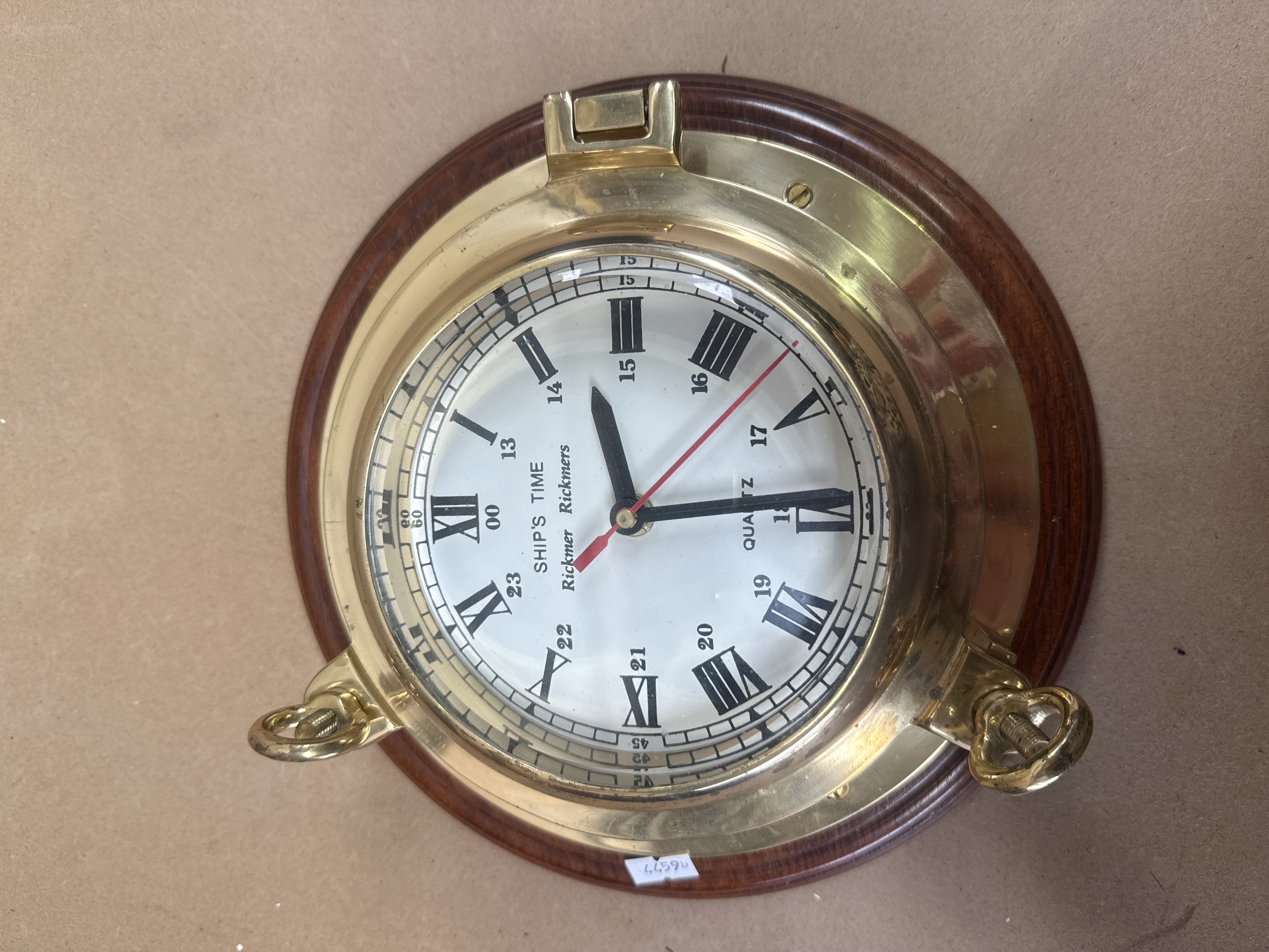 A nautical-themed quartz wall clock by Nagina International. The piece features a polished brass porthole-style housing mounted on a circular dark-stained wooden plaque. The white dial is printed with black Roman numerals for the primary hours and an inner ring of Arabic numerals for a 24-hour scale. The dial is inscribed with SHIP’S TIME, Rickmer Rickmers, and QUARTZ. It is equipped with three hands: black hour and minute hands and a red seconds hand. The hinged porthole frame is secured by two brass wingnut fasteners.