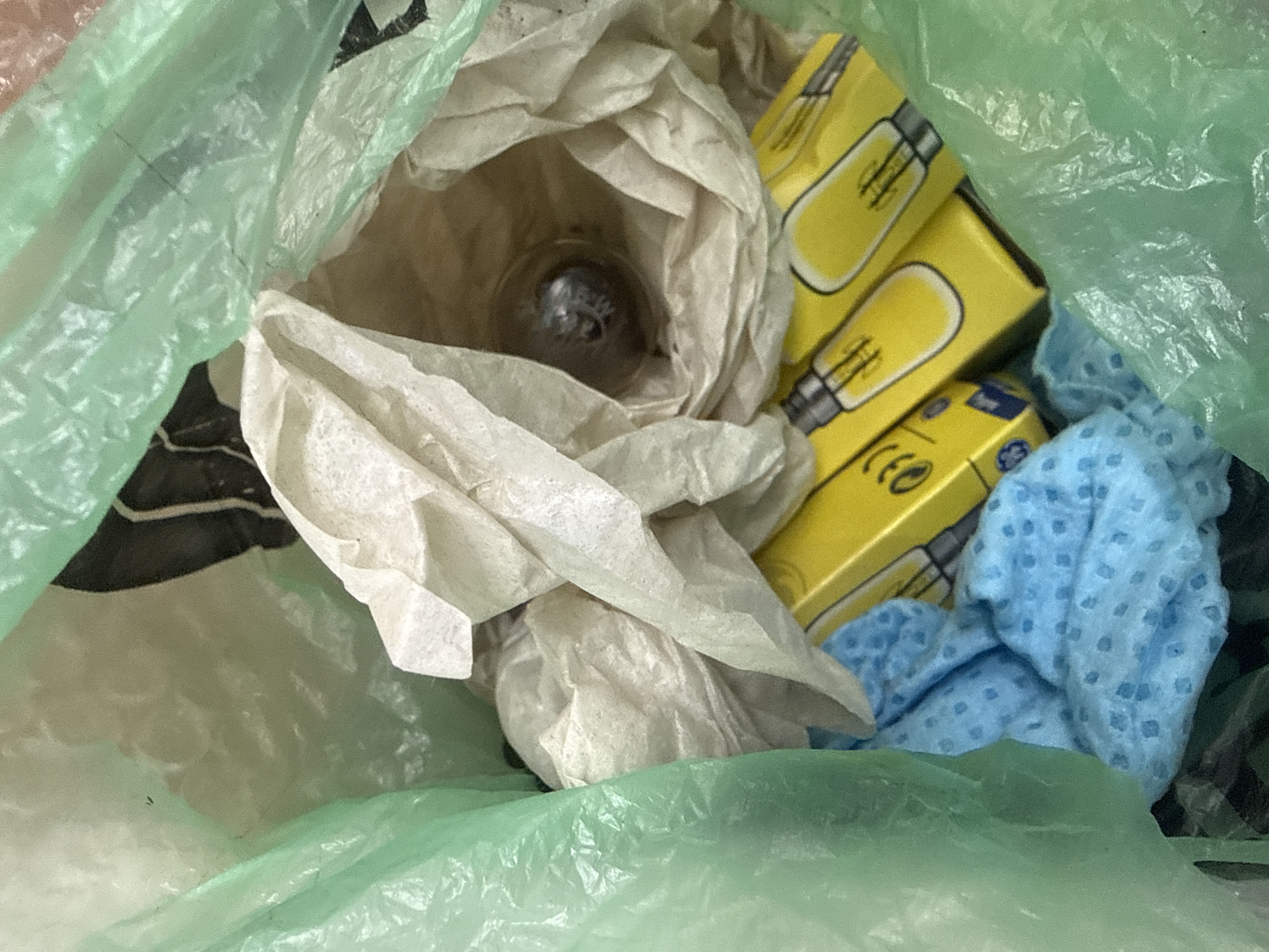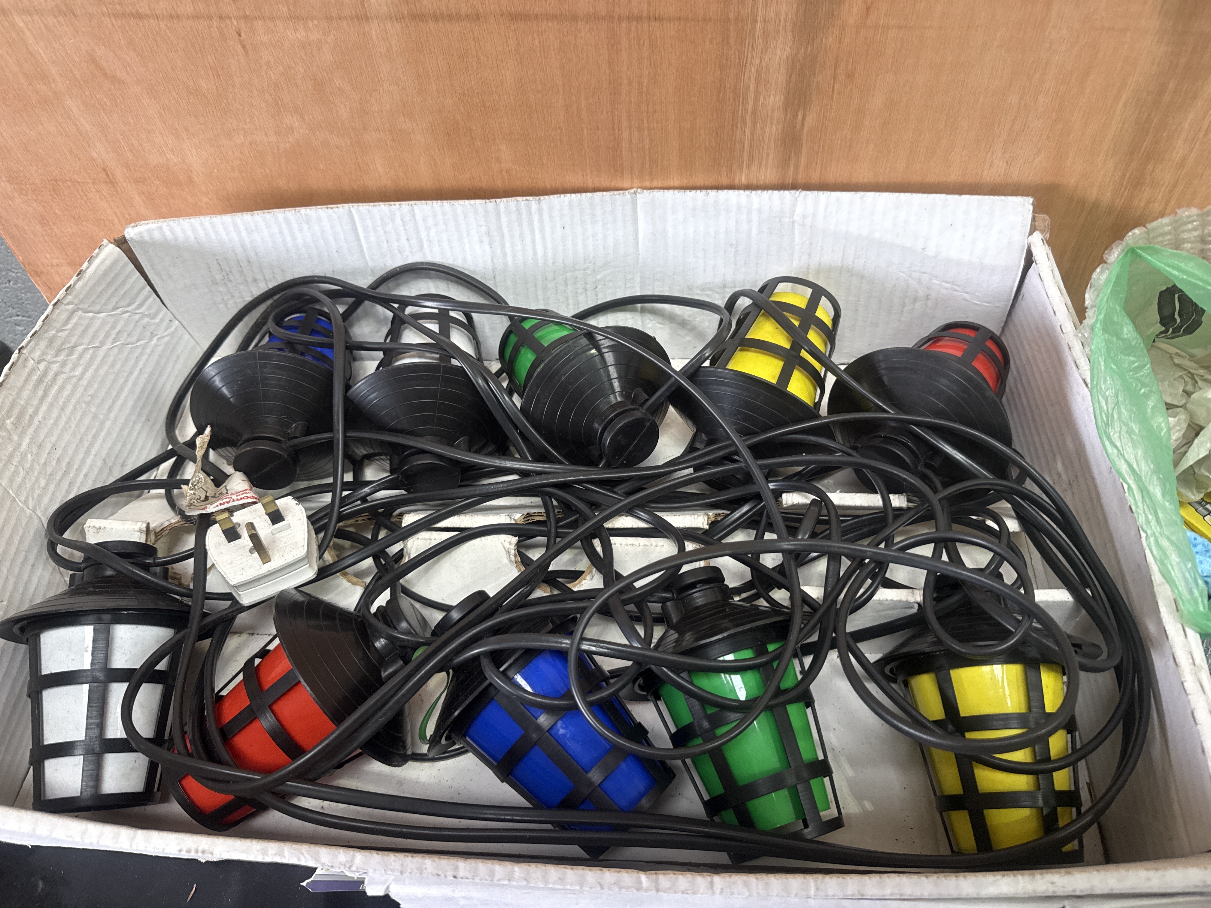 A set of outdoor lantern-style festoon lights featuring multicolored plastic shades in red, green, blue, yellow, and white. Each shade is housed within a black plastic cage. The lights are connected by a length of black electrical cabling and fitted with a UK three-pin plug labeled Portland. The lot includes several spare incandescent light bulbs, including GE brand bulbs in original yellow cardboard packaging marked with the CE logo. The items are presented in a cardboard box and a green plastic bag.