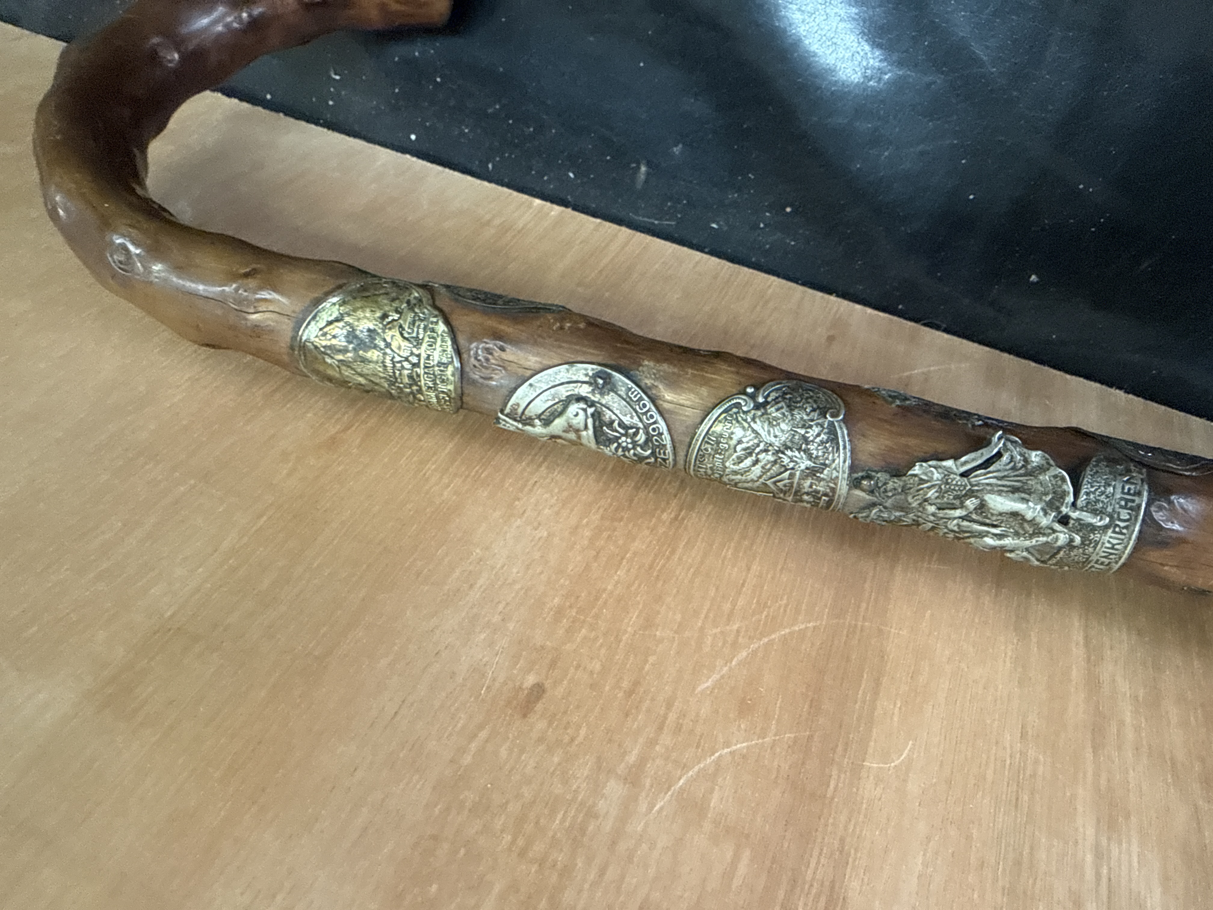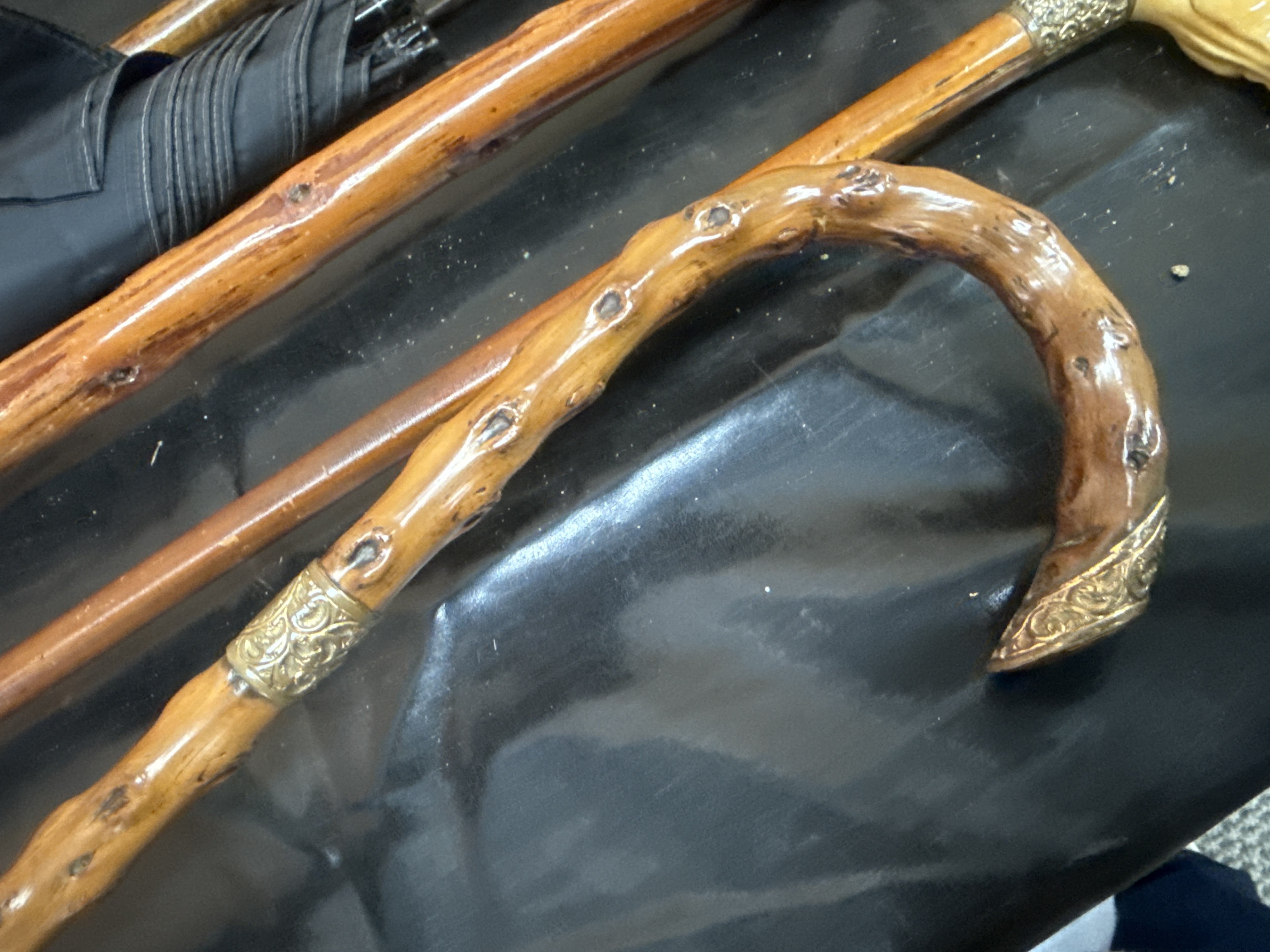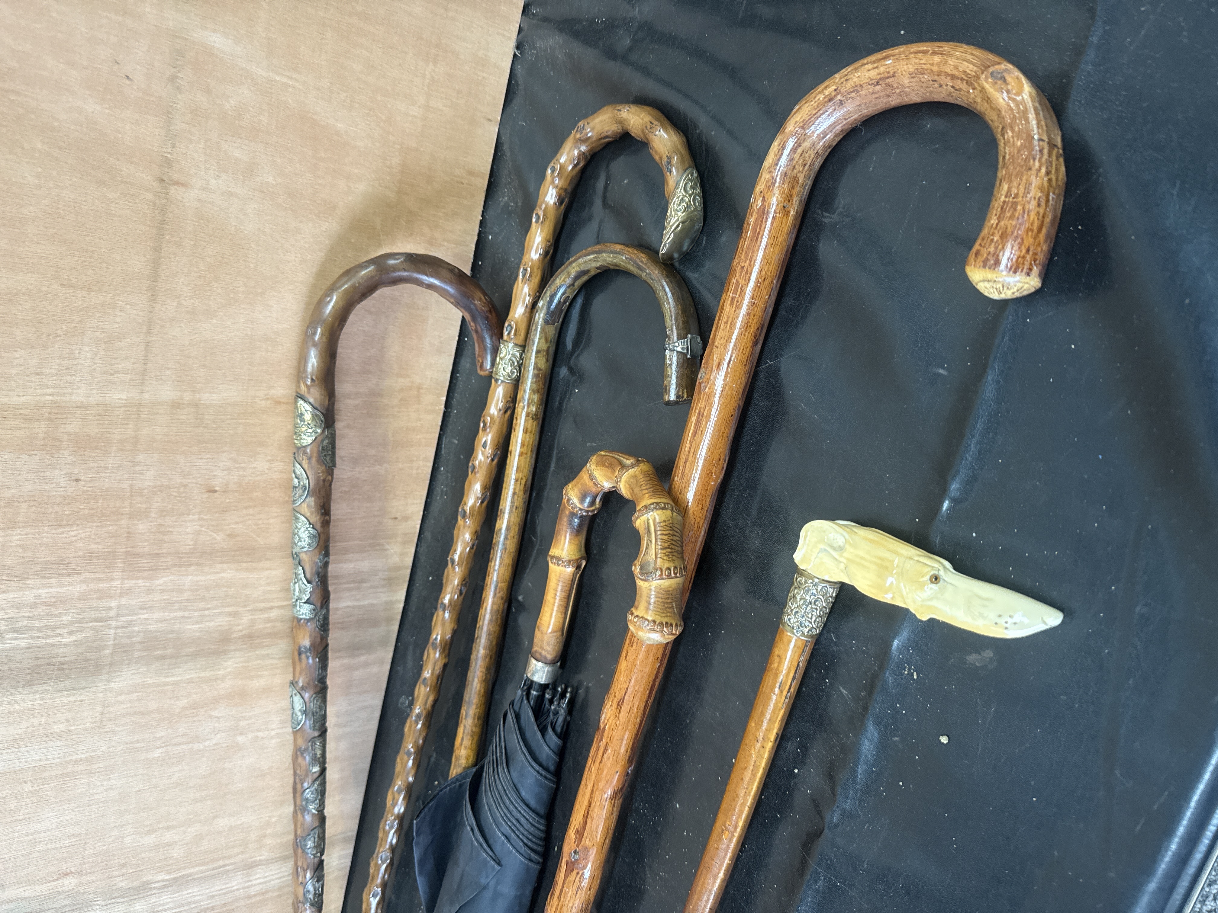 This collection consists of five walking sticks and one umbrella, showcasing various materials and decorative elements. One wooden staff is embellished with several German silver-tone souvenir badges, known as Stocknägel, identifying alpine locations including Zugspitze 2966m and Garmisch-Partenkirchen. A notable cane features a handle carved in the form of a duck head, likely bone or ivory, mounted on an embossed metal ferrule with inset eyes. The assembly also includes an umbrella with a segmented bamboo-style handle and multiple canes with curved wooden grips, one of which is fitted with a small rectangular white metal plaque. The shafts are constructed from various hardwoods and bamboo, showing vintage characteristics consistent with the Victorian style identified in market comparisons.
