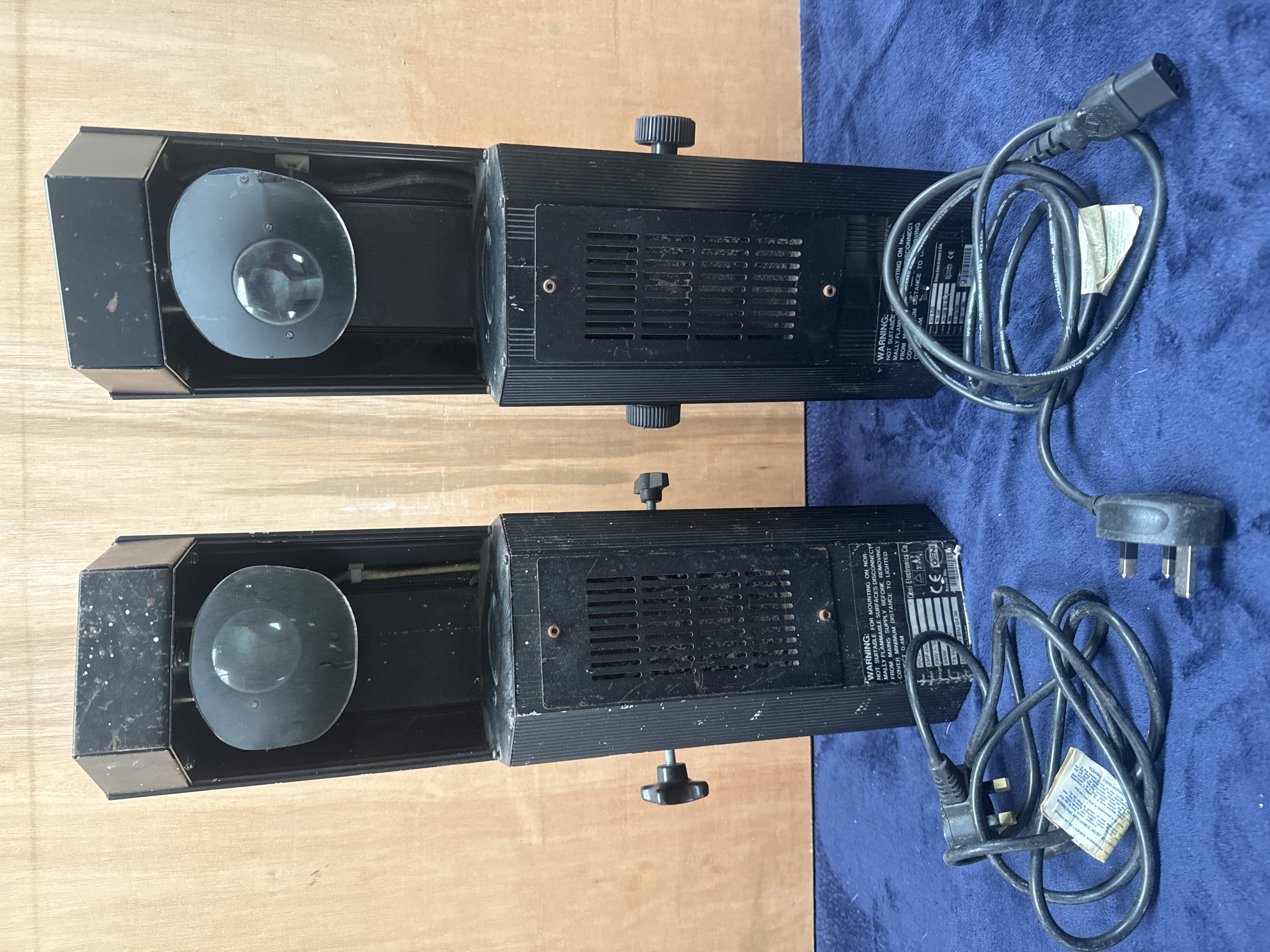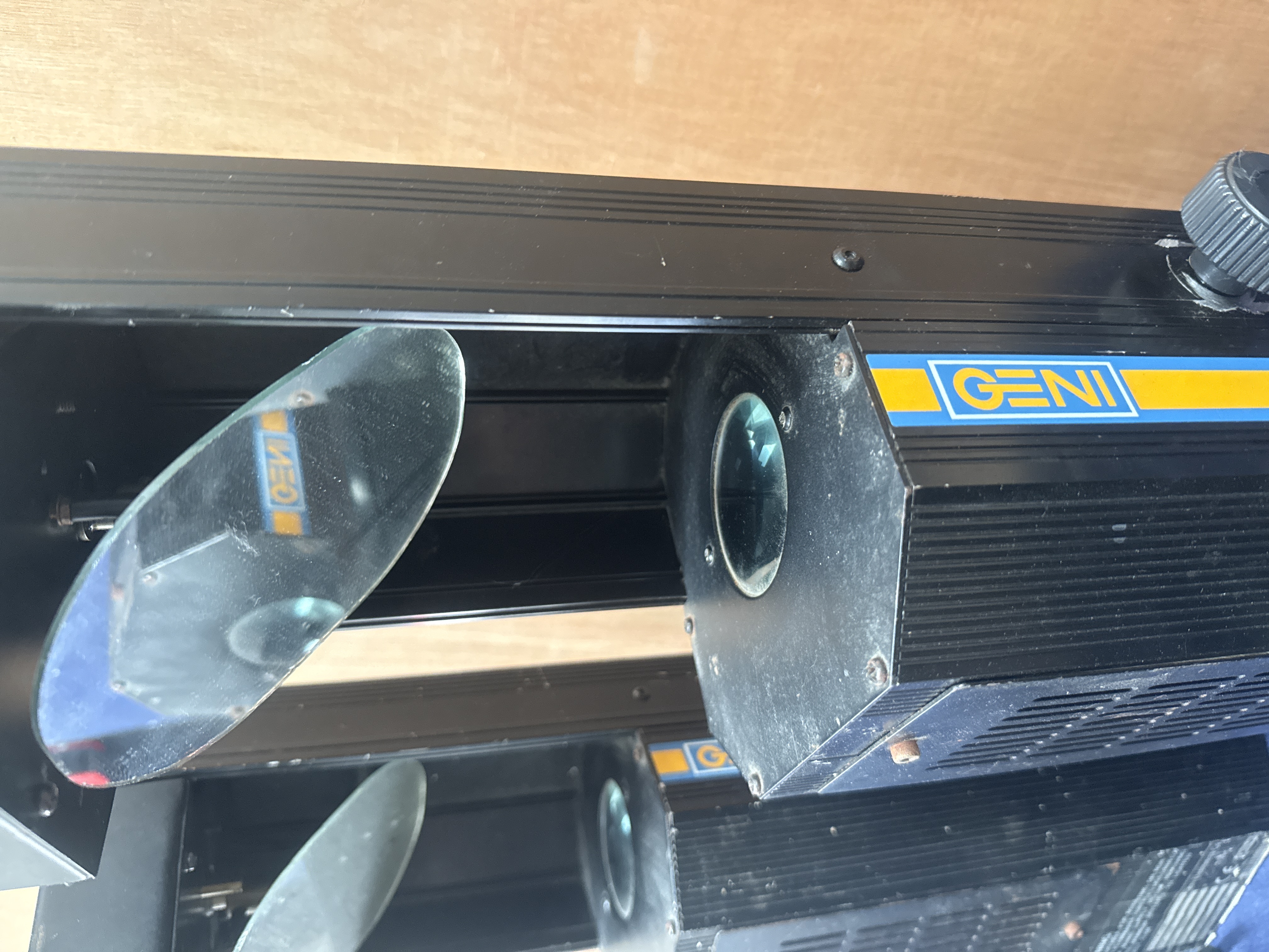 A pair of professional stage lighting units manufactured by Geni Electronics Co. Each unit features a black-finished rectangular metal housing measuring 20.5 inches in length. The construction includes integrated glass lenses and adjustable oval mirrors designed for light projection. The exterior of each unit is fitted with manual adjustment knobs and bears the GENI brand logo in blue and yellow. Manufacturer labels are present on the rear, providing technical specifications and safety warnings in English. Each unit is equipped with a power cable terminated with a standard UK three-pin plug.