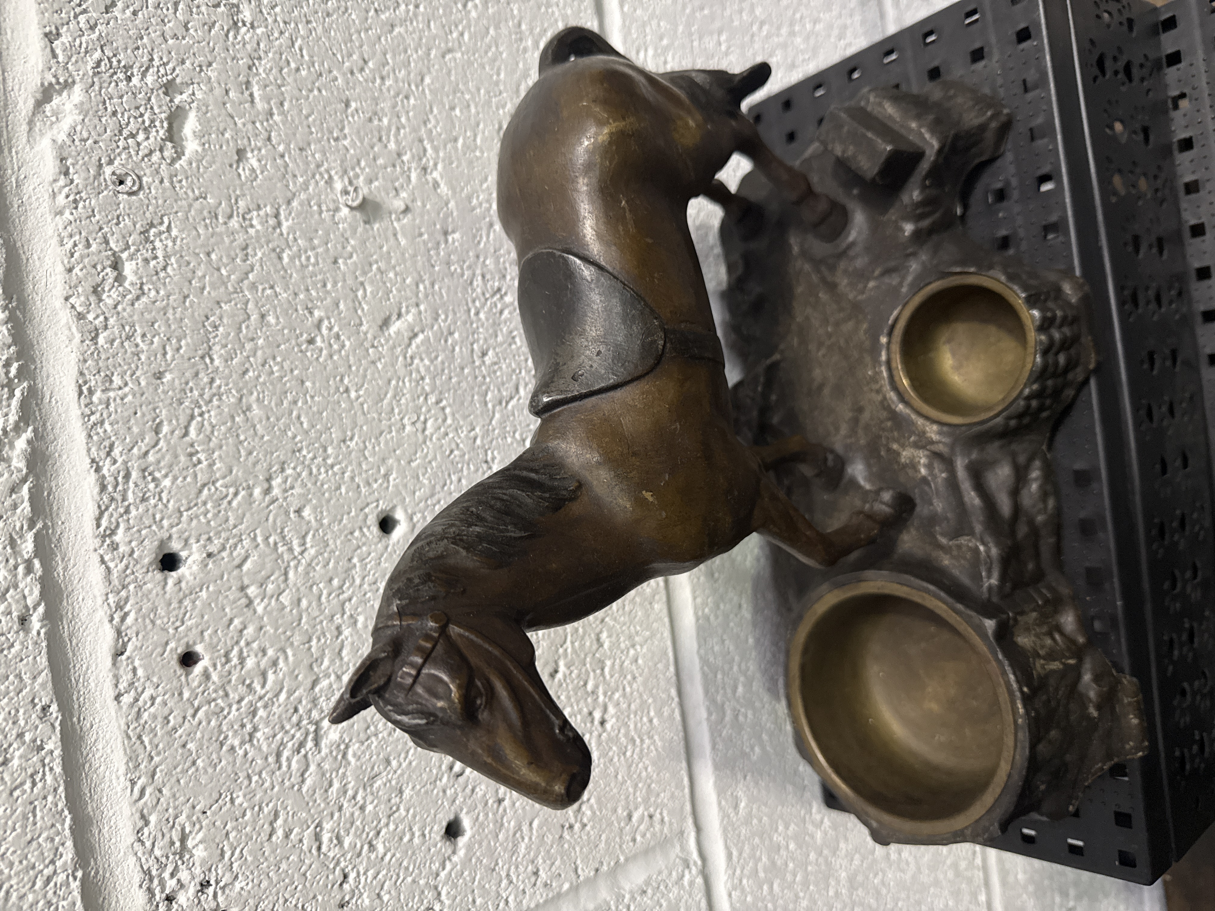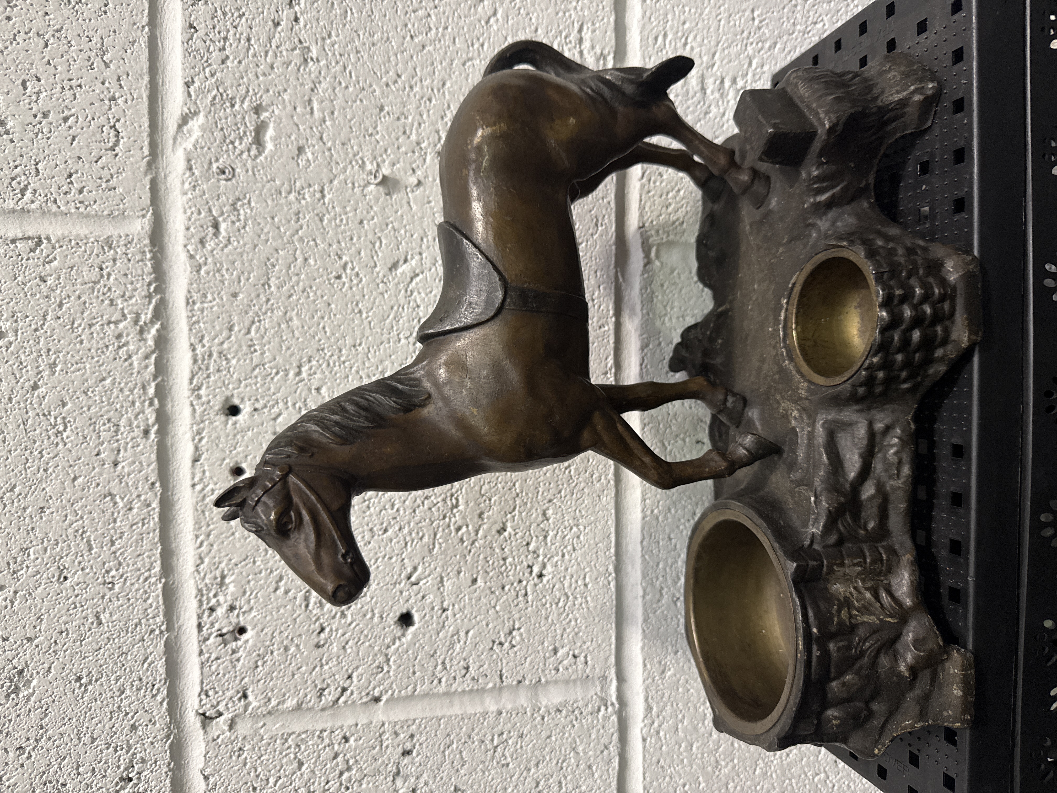 A late 19th or early 20th-century figural cast metal inkstand featuring a saddled and bridled horse standing upon a naturalistic rock-form base. The piece is finished in a dark brown bronze-toned patina. The base incorporates two circular inkwell receptacles. A partial mark reading OVER is present on the lower edge. The form and construction are similar to equestrian desk accessories produced by Kronheim and Oldenbusch.