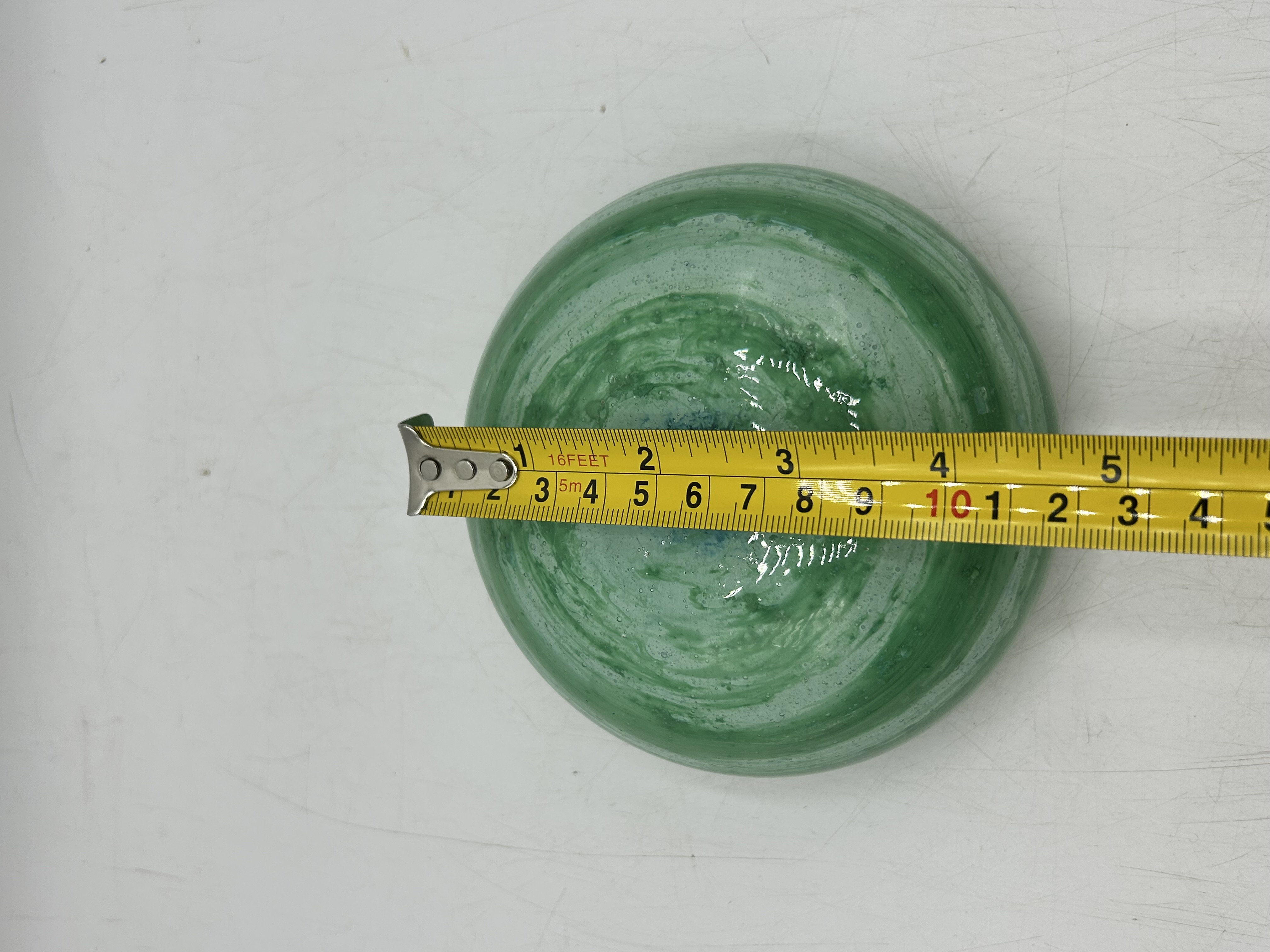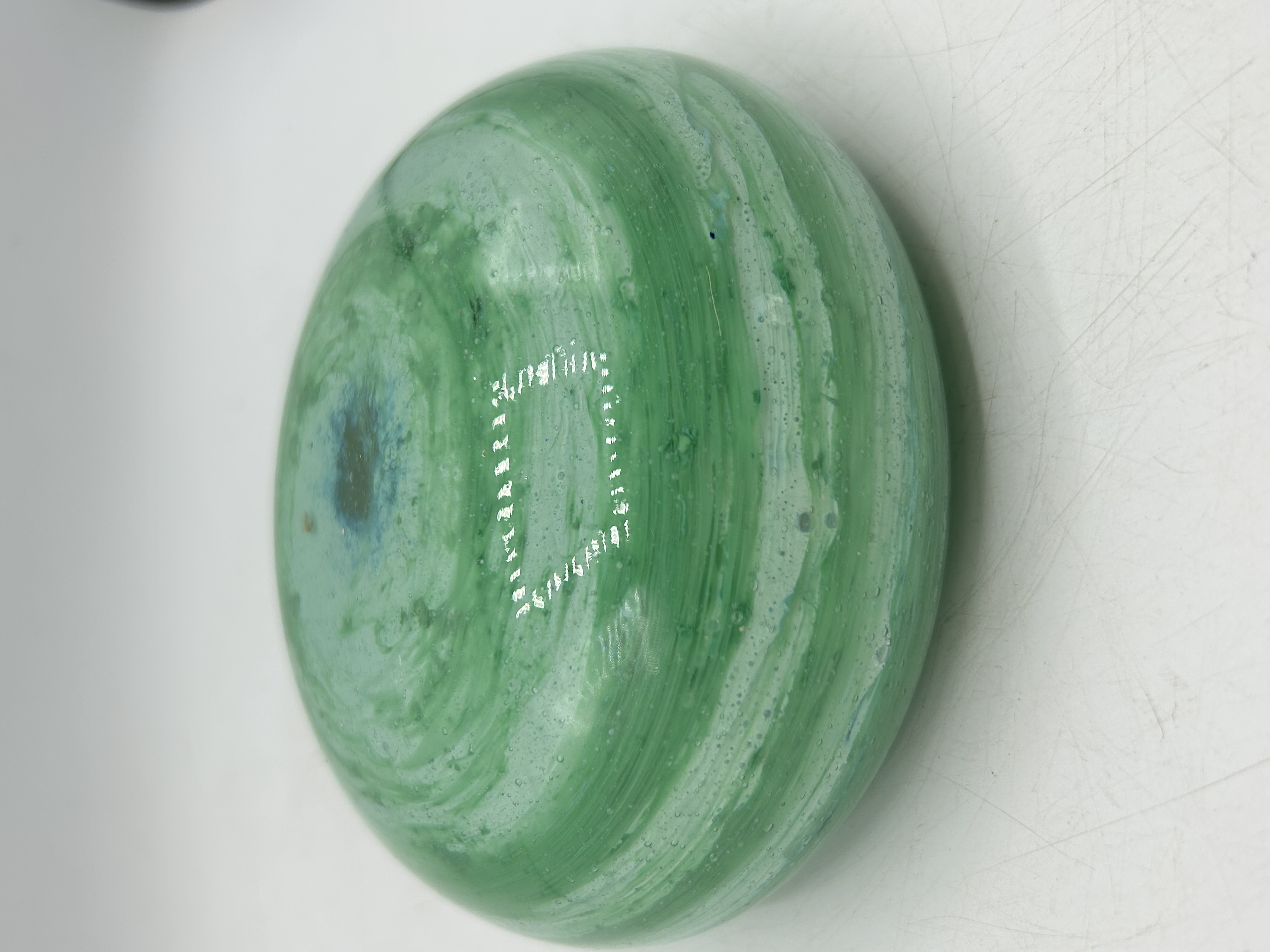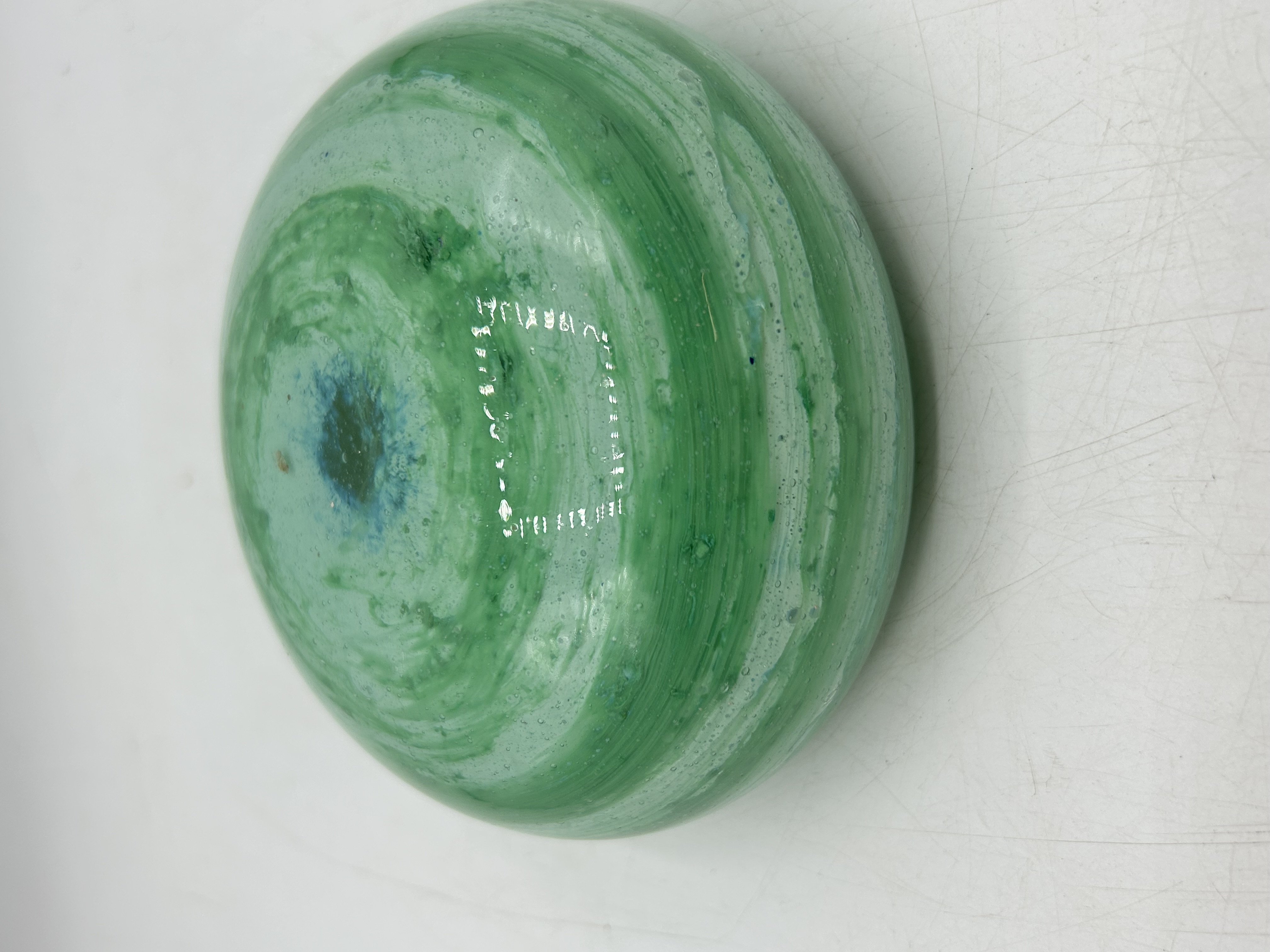 A Kerry Glass art glass paperweight of domed circular form. The piece features a marbled pattern of varying shades of green and white swirls with a seeded texture of internal air bubbles throughout the body. The underside displays a dark blue or green central inclusion at the pontil site and an etched rectangular maker’s mark.