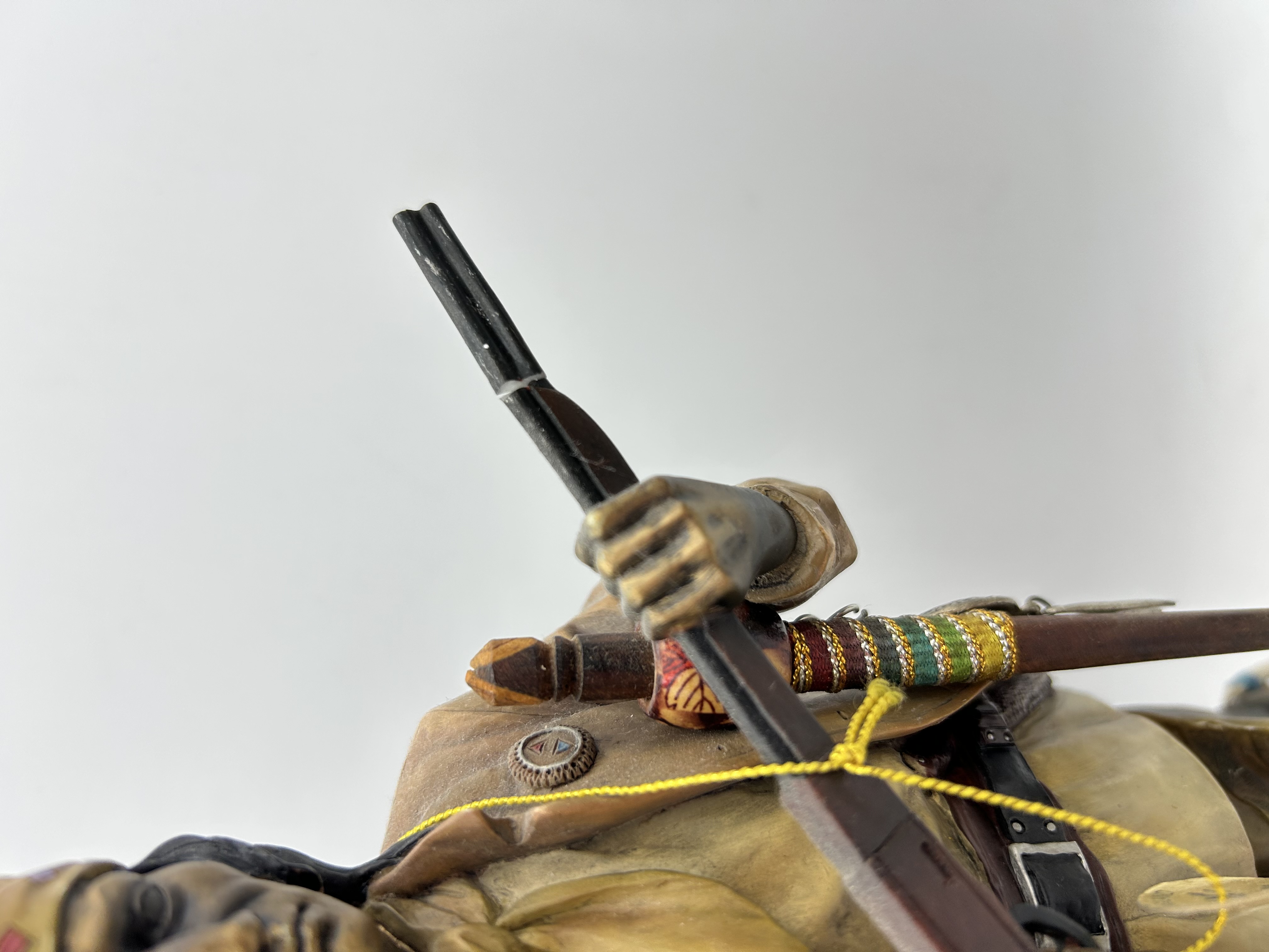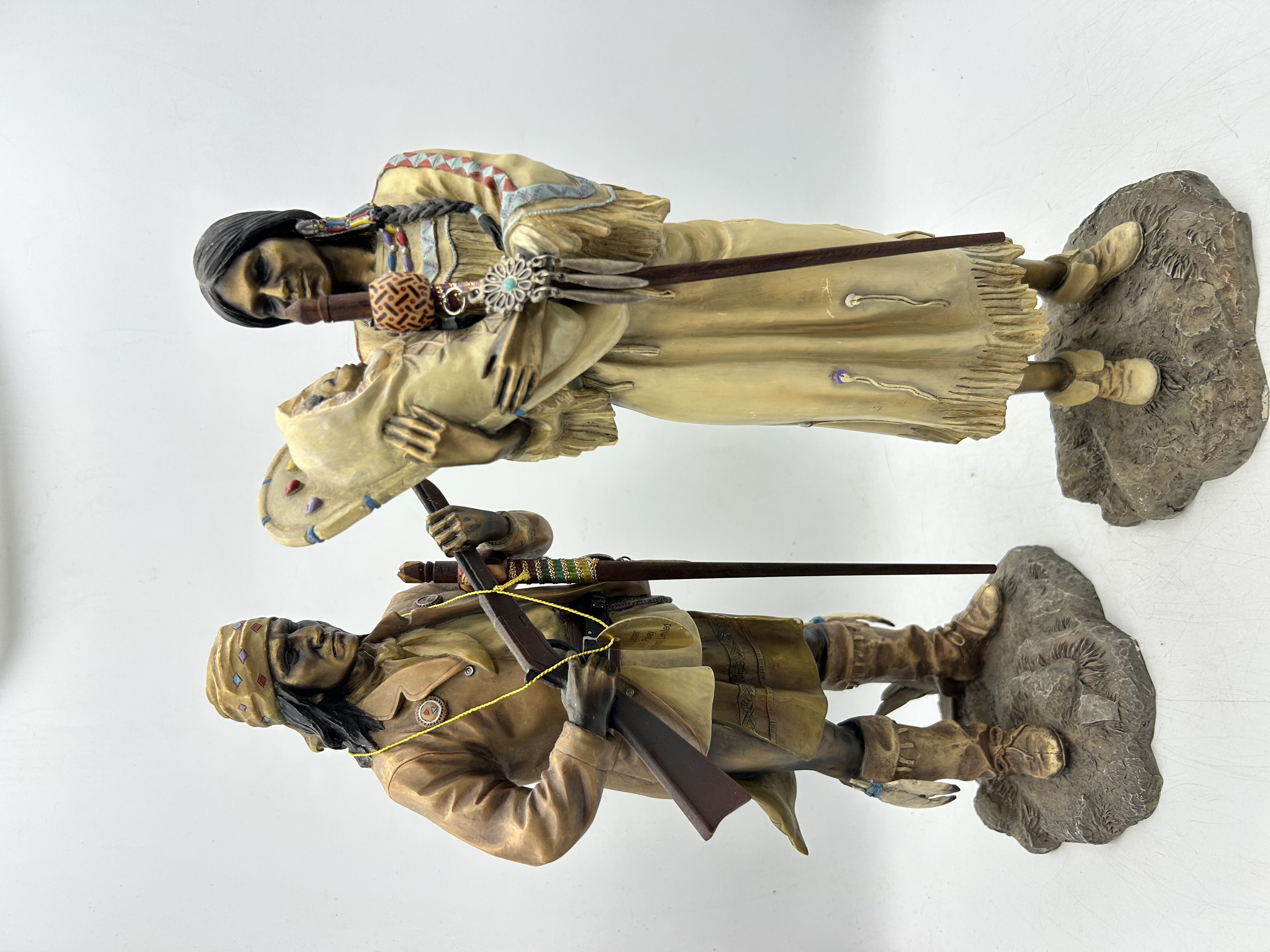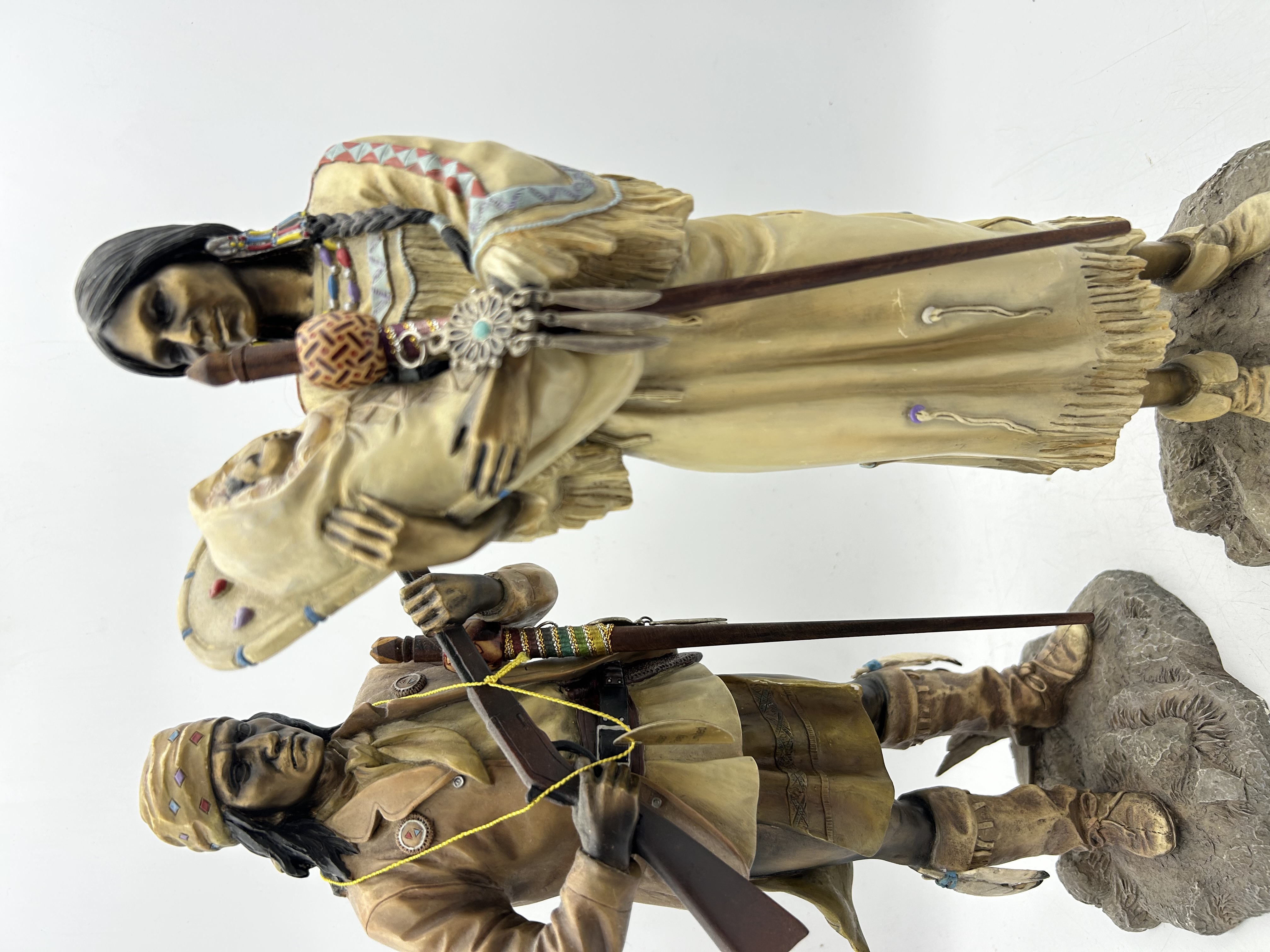 Touch of Class Majestic Tradition Native American figurines. This pair of contemporary sculptures is constructed from a hand-painted composite resin material. One figurine depicts a woman in a fringed buckskin dress carrying a cradleboard and a staff. The second figurine depicts a man in buckskin attire and a headband holding a rifle. Both subjects feature detailed polychrome accents and are set upon integrated, rocky-textured bases. The male figure includes a manufacturer’s tag and a yellow cord wrapped around the torso.