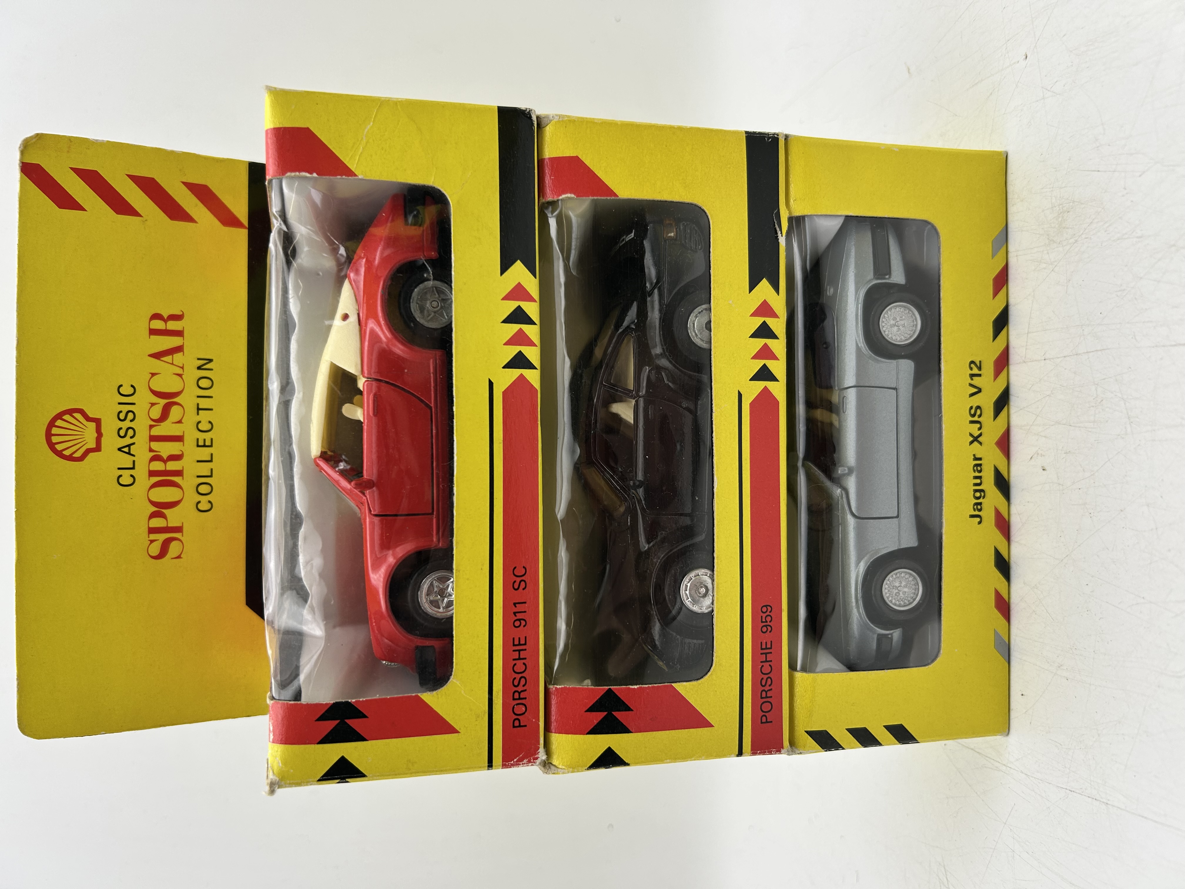 A trio of 1:43 scale die-cast model cars from the Shell Classic Sportscar Collection, manufactured by Maisto. The group comprises a red Porsche 911 SC, a black Porsche 959, and a silver Jaguar XJS V12. Each model is constructed from die-cast metal with plastic components and includes interior detailing visible through the windows. The vehicles are presented in their original yellow and red window display boxes, which bear the Shell brand logo and the specific vehicle model name. These models were produced as part of a promotional series circa 1991.