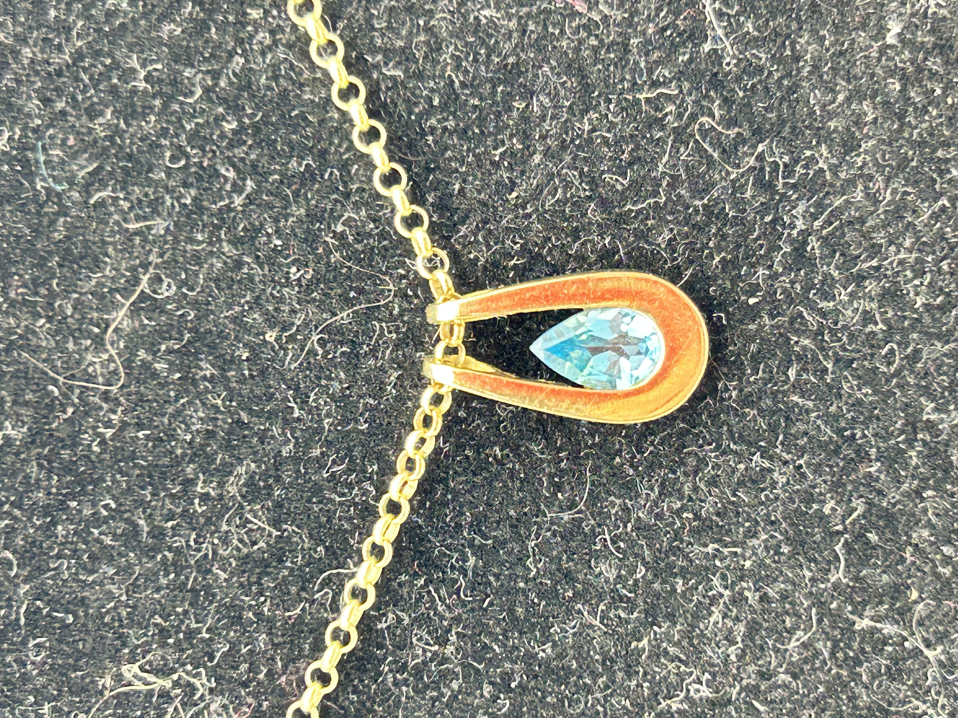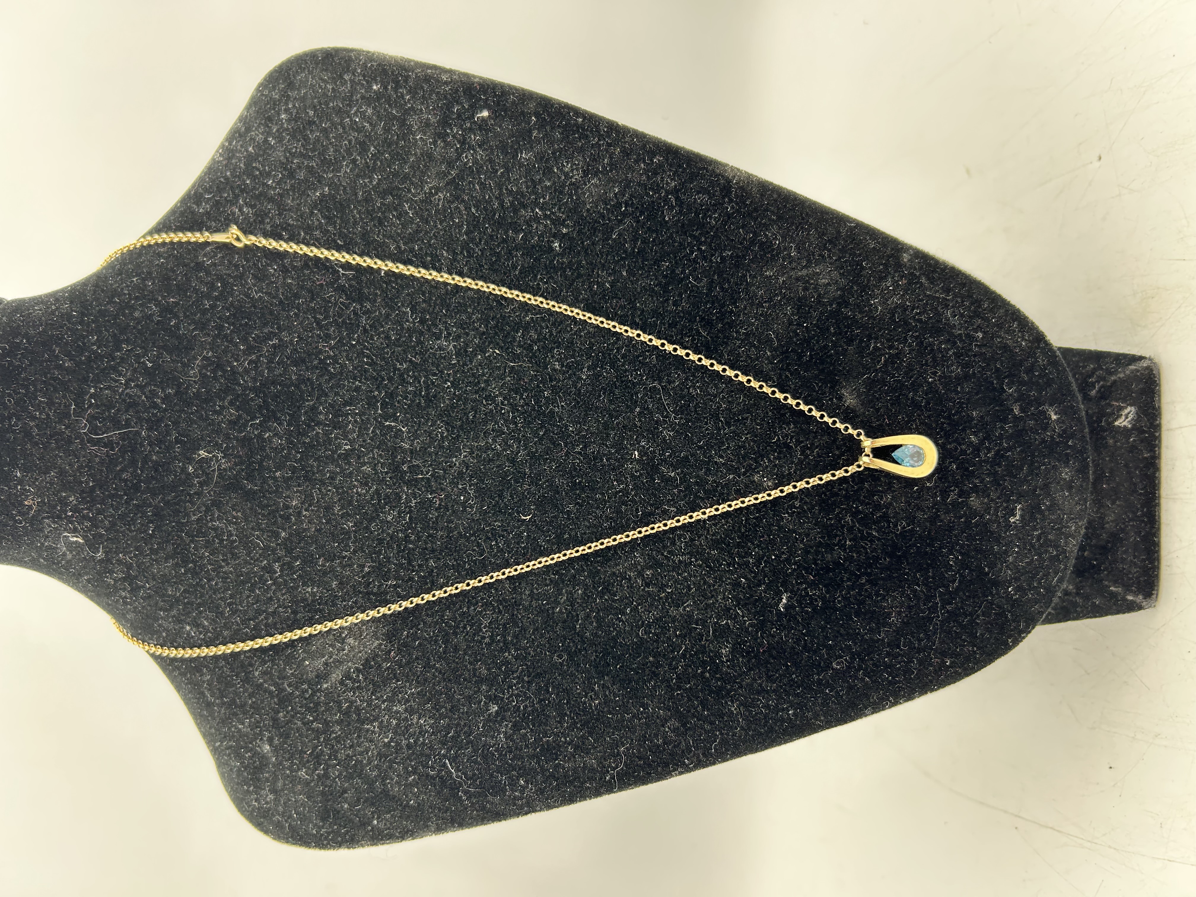 A 9ct yellow gold necklace featuring a horseshoe-style pendant. The pendant frame houses a single faceted teardrop-shaped light blue topaz. The pendant is suspended from a delicate cable-link chain.