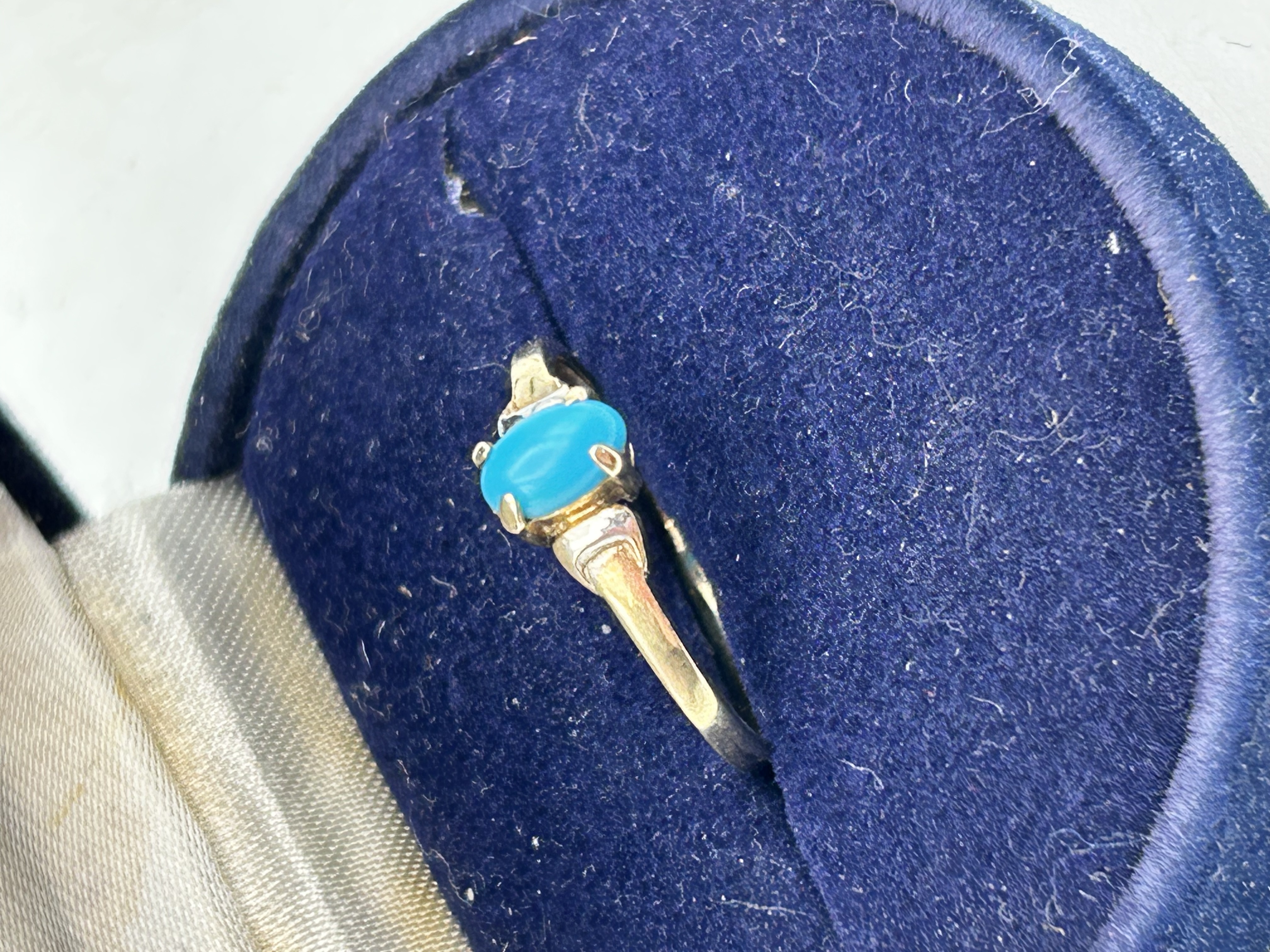 A 9ct yellow gold ring featuring a central oval turquoise cabochon. The gemstone is held in a four-prong setting and is flanked on either side by small, colourless accent stones. The ring has a simple, polished band that tapers slightly towards the head. It is presented in a blue velvet-lined display box. No hallmarks or maker’s marks are clearly discernible.