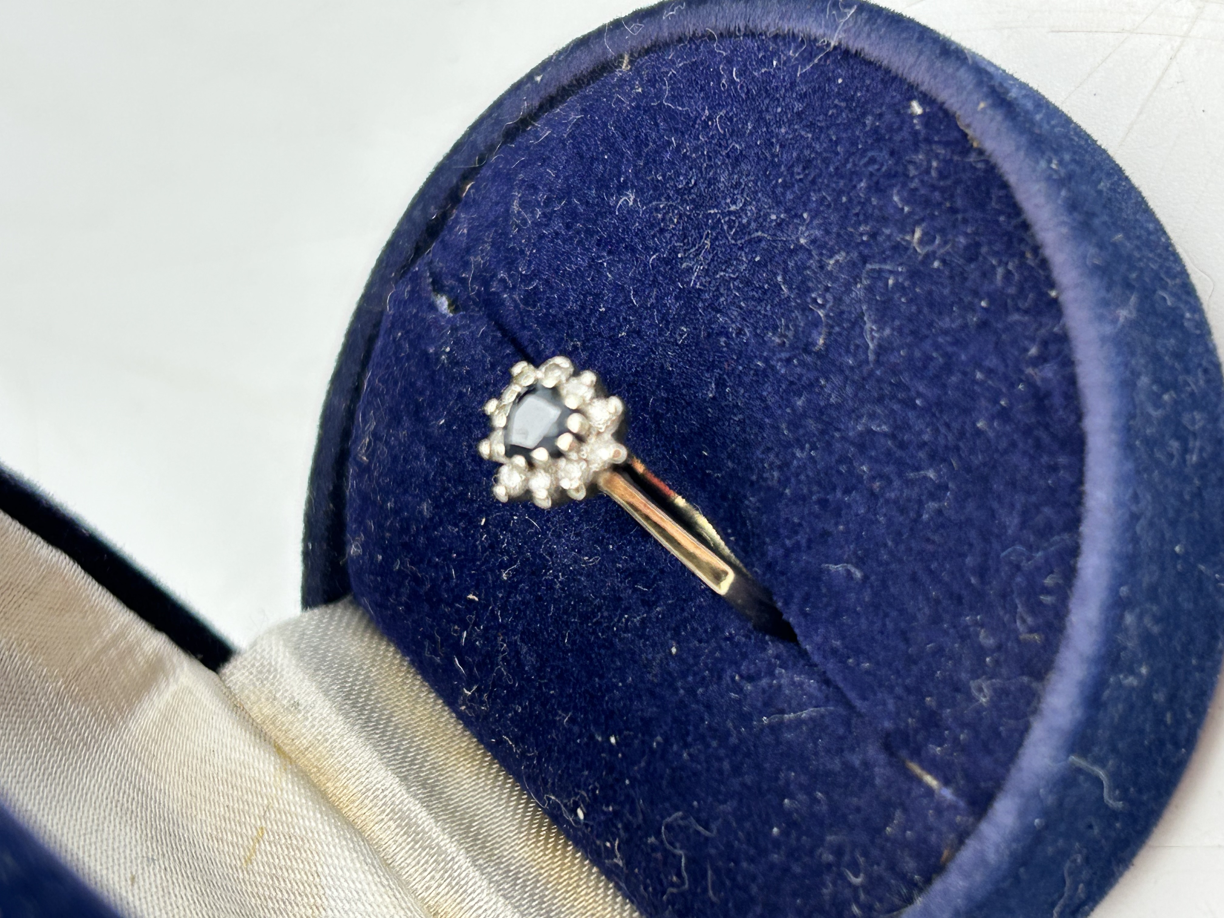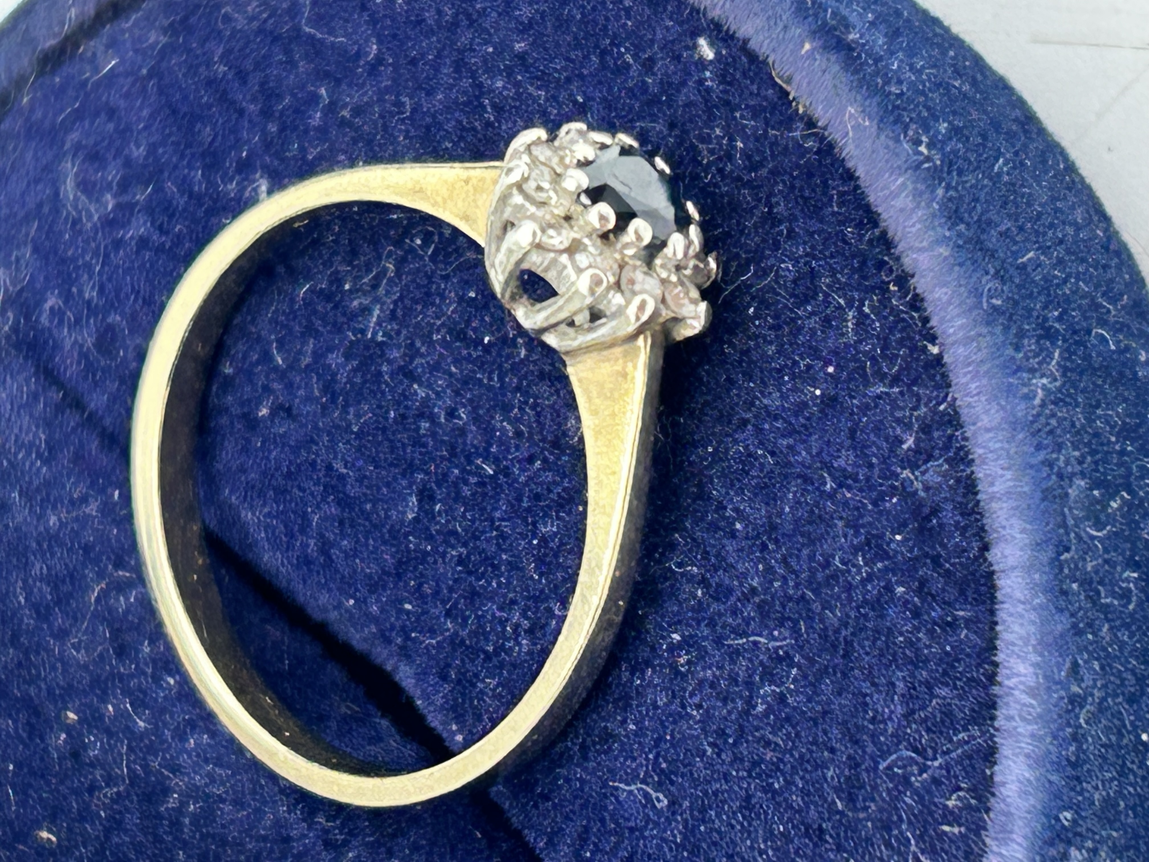 A 9ct yellow gold cluster ring featuring a central oval-cut dark blue sapphire. The central stone is held within a white metal claw setting and is surrounded by a halo of small round-cut clear accent stones, likely diamonds. The ring features a plain, polished 9ct yellow gold band. An illegible mark is present on the interior of the shank. The item is presented in a blue velvet-lined jewellery box.