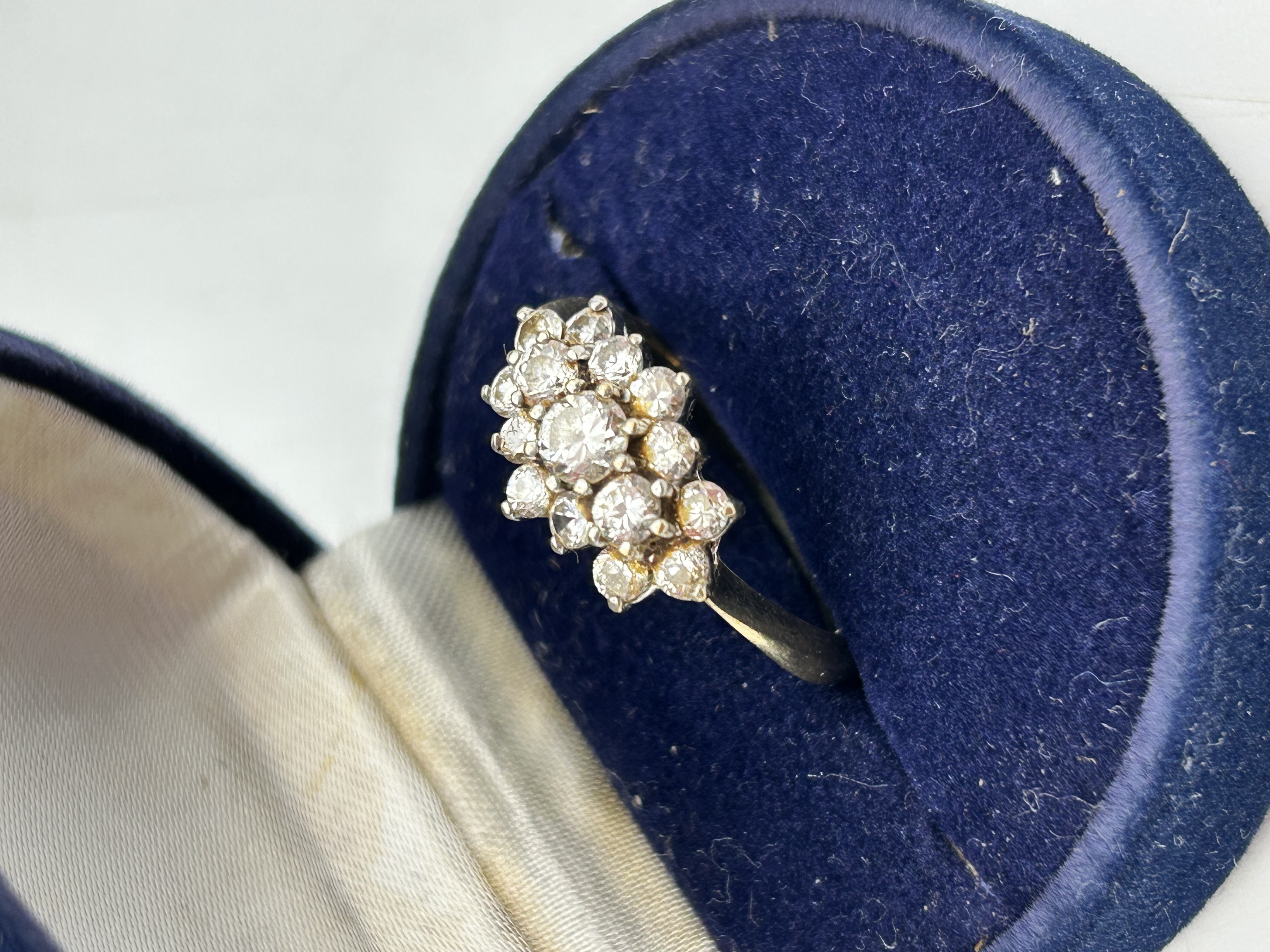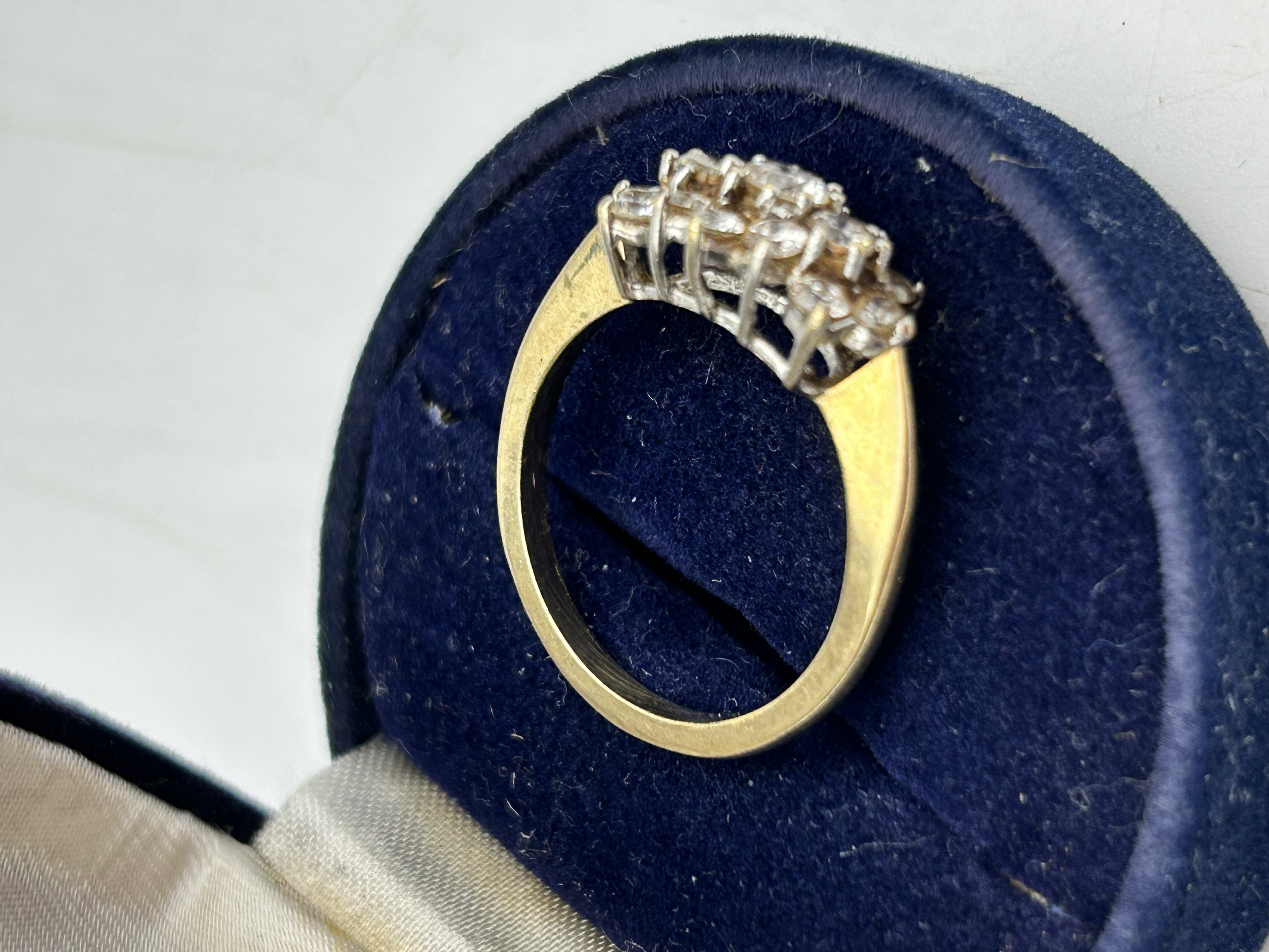 A 9ct yellow gold and white metal diamond cluster ring. The head features a tiered arrangement of round brilliant-cut diamonds claw-set in white metal prongs. The cluster is mounted on a plain 9ct yellow gold band. The item is presented in a blue velvet and cream satin-lined jewellery box. No visible hallmarks or maker’s marks are present.