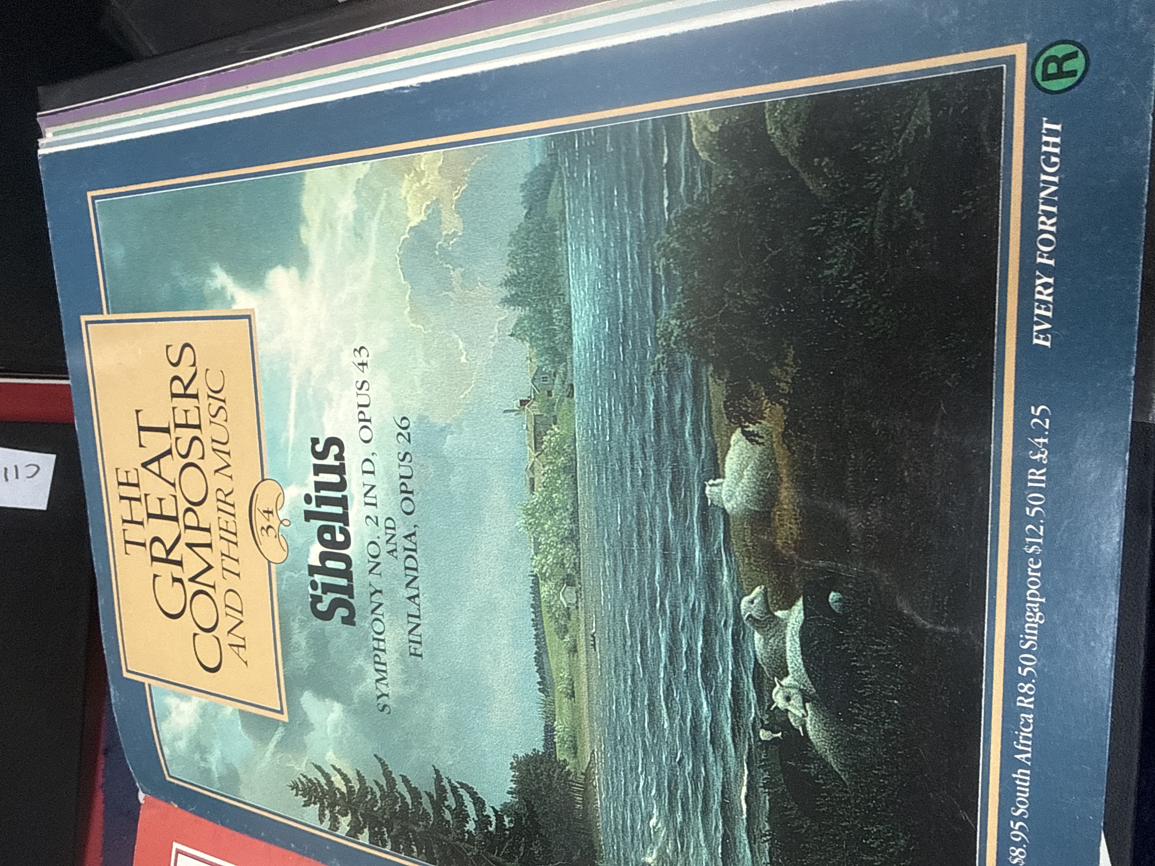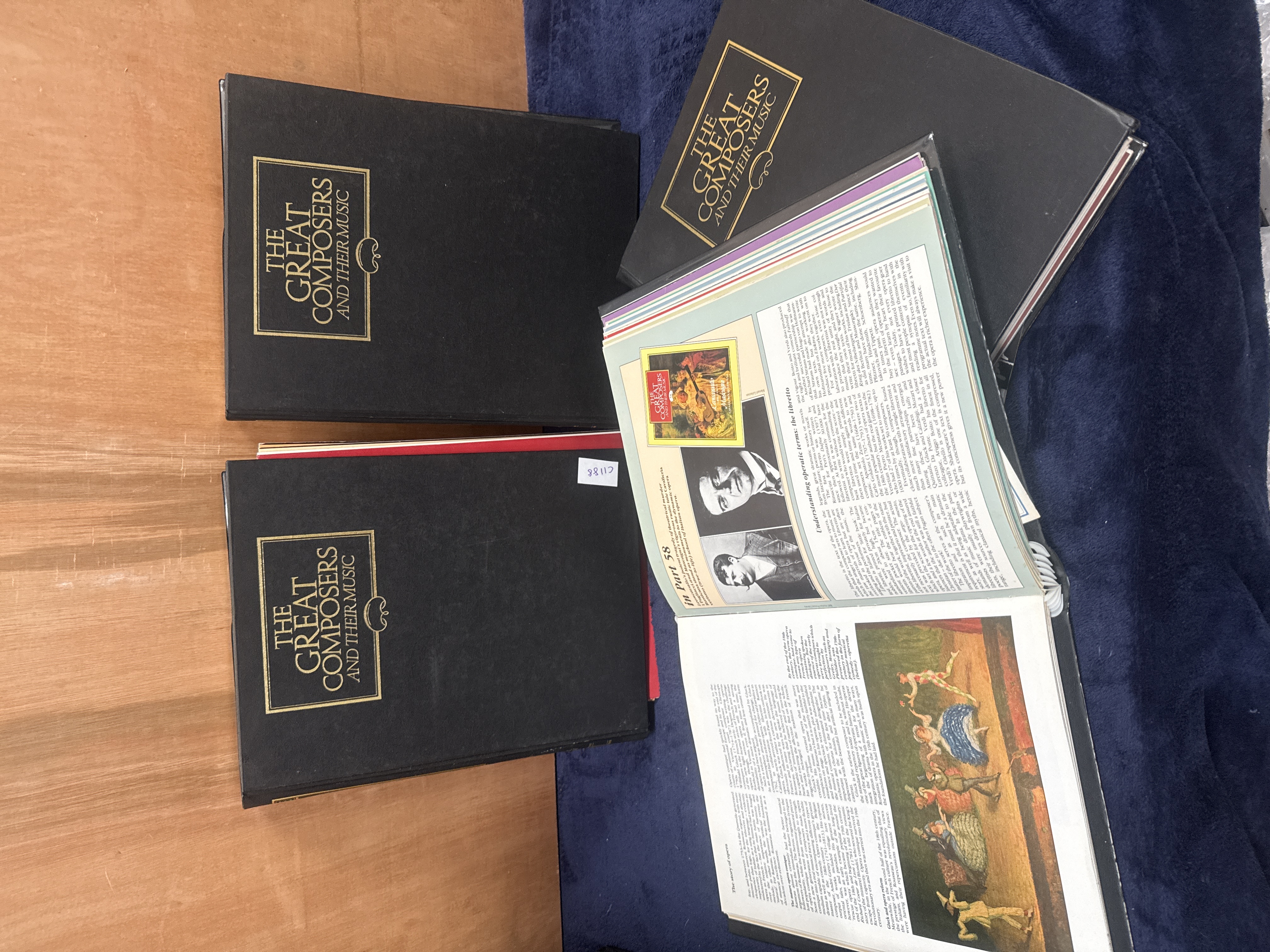 A collection of four binders from the educational partwork series titled The Great Composers and Their Music. The binders are constructed from a black textured material featuring gold-stamped title lettering to the front covers. These volumes contain various softcover illustrated booklets providing biographical details, musical analyses, and historical context for classical composers. Visible editions within the collection include Beethoven (Symphony No. 5 in C Minor, Opus 67), Sibelius (Symphony No. 2 in D, Opus 43 and Finlandia, Opus 26), and a themed issue titled A Celebration of Christmas. The publications display international pricing in several currencies including British Pounds, South African Rand, and Singapore Dollars.