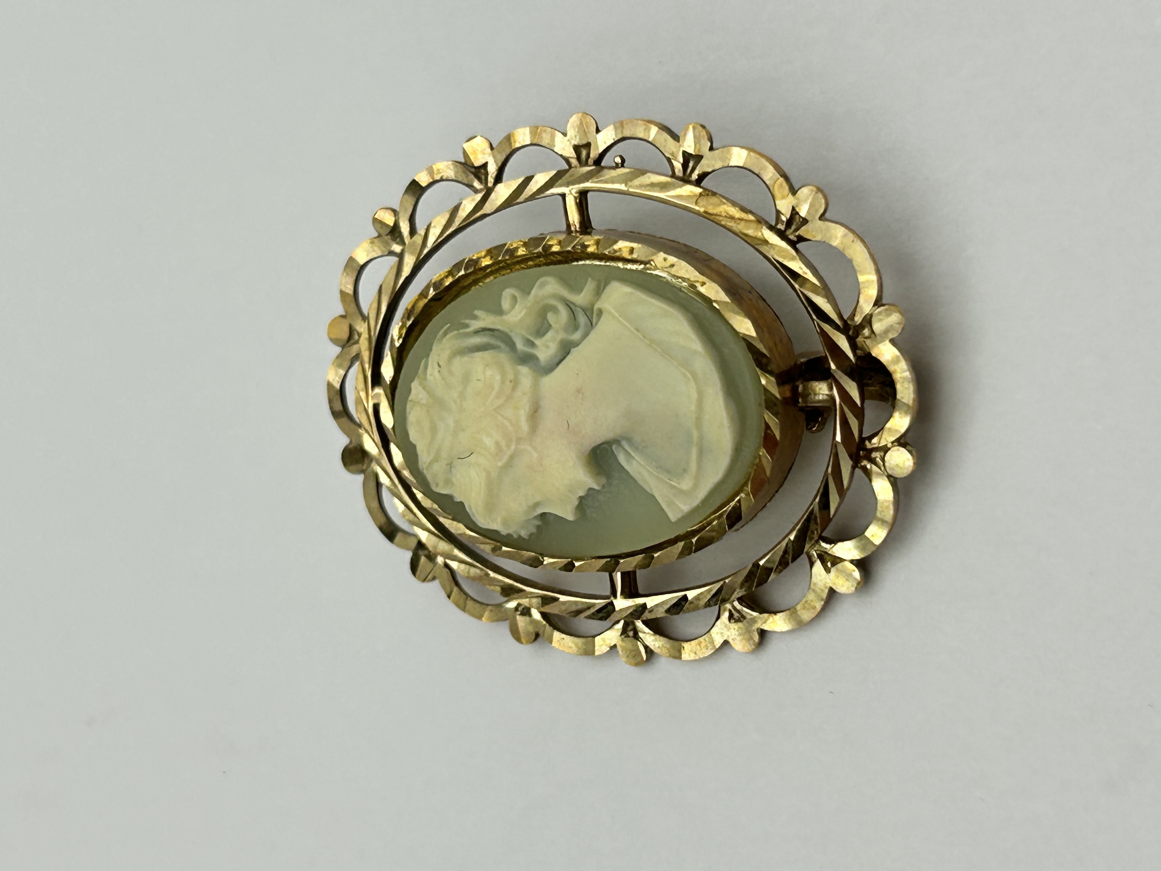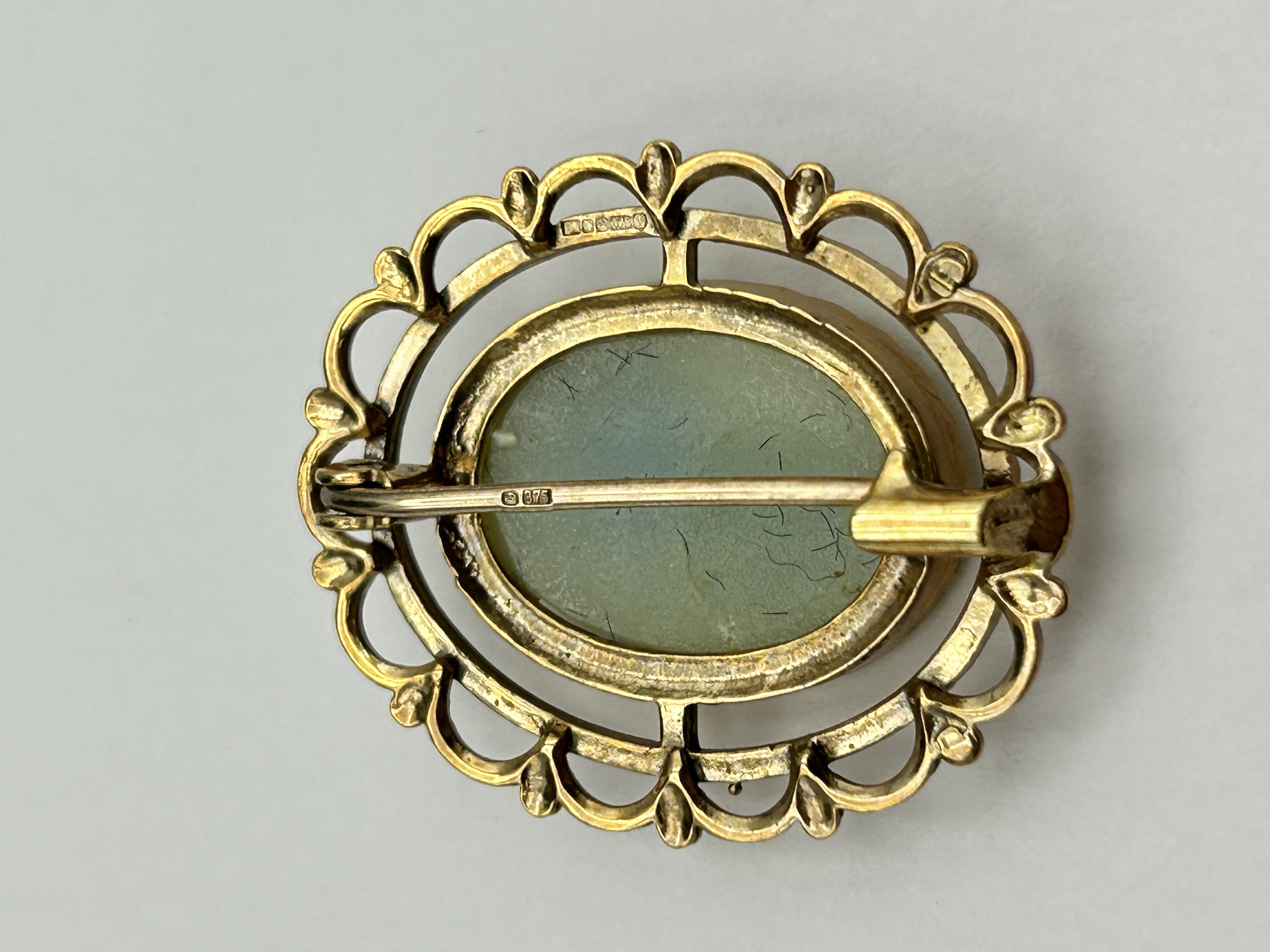 A hardstone cameo brooch featuring a classical-style female profile carved in relief from a light green and white hardstone. The central oval cameo is set within a 9ct gold bezel, surrounded by a decorative openwork frame with scalloped edges and textured diagonal supports. The reverse of the frame and the pin are stamped with hallmarks including a 375 mark, signifying 9-carat gold. This brooch, weighing 4g, is secured with a traditional pin and C-clasp fastening.