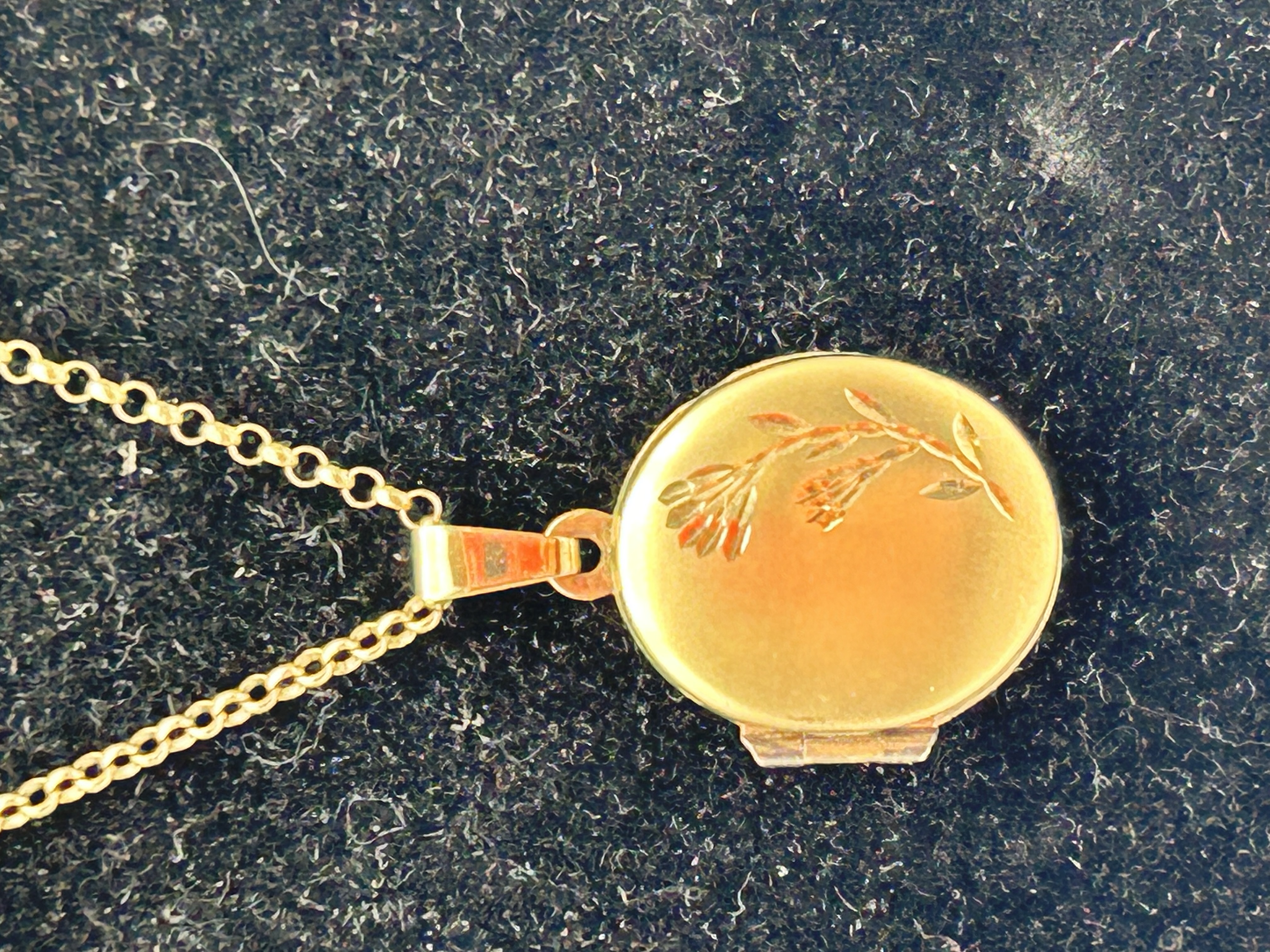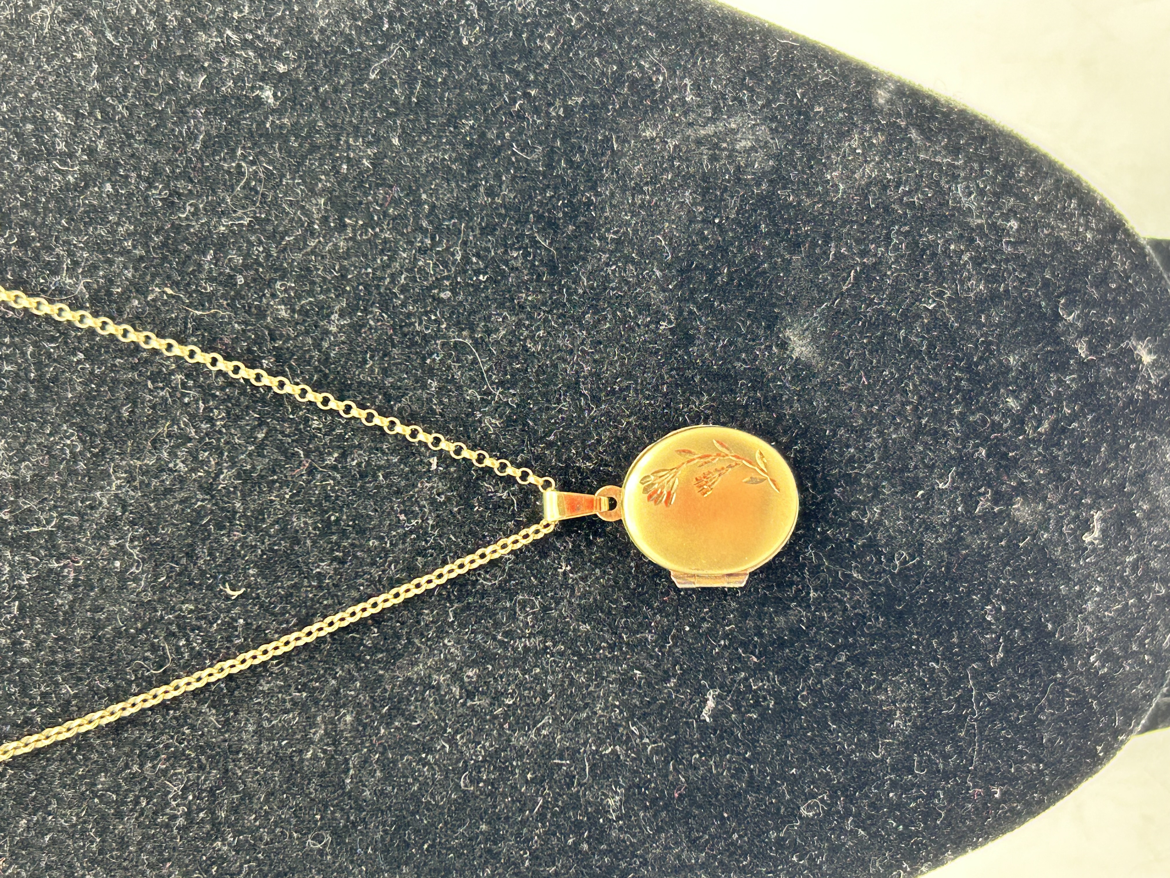 A 9ct yellow gold locket necklace featuring a circular pendant. The front face of the locket is decorated with an engraved botanical sprig design. The locket is hinged and suspended from a rectangular bale on a matching fine link chain. The construction is consistent with vintage-inspired jewellery styles.