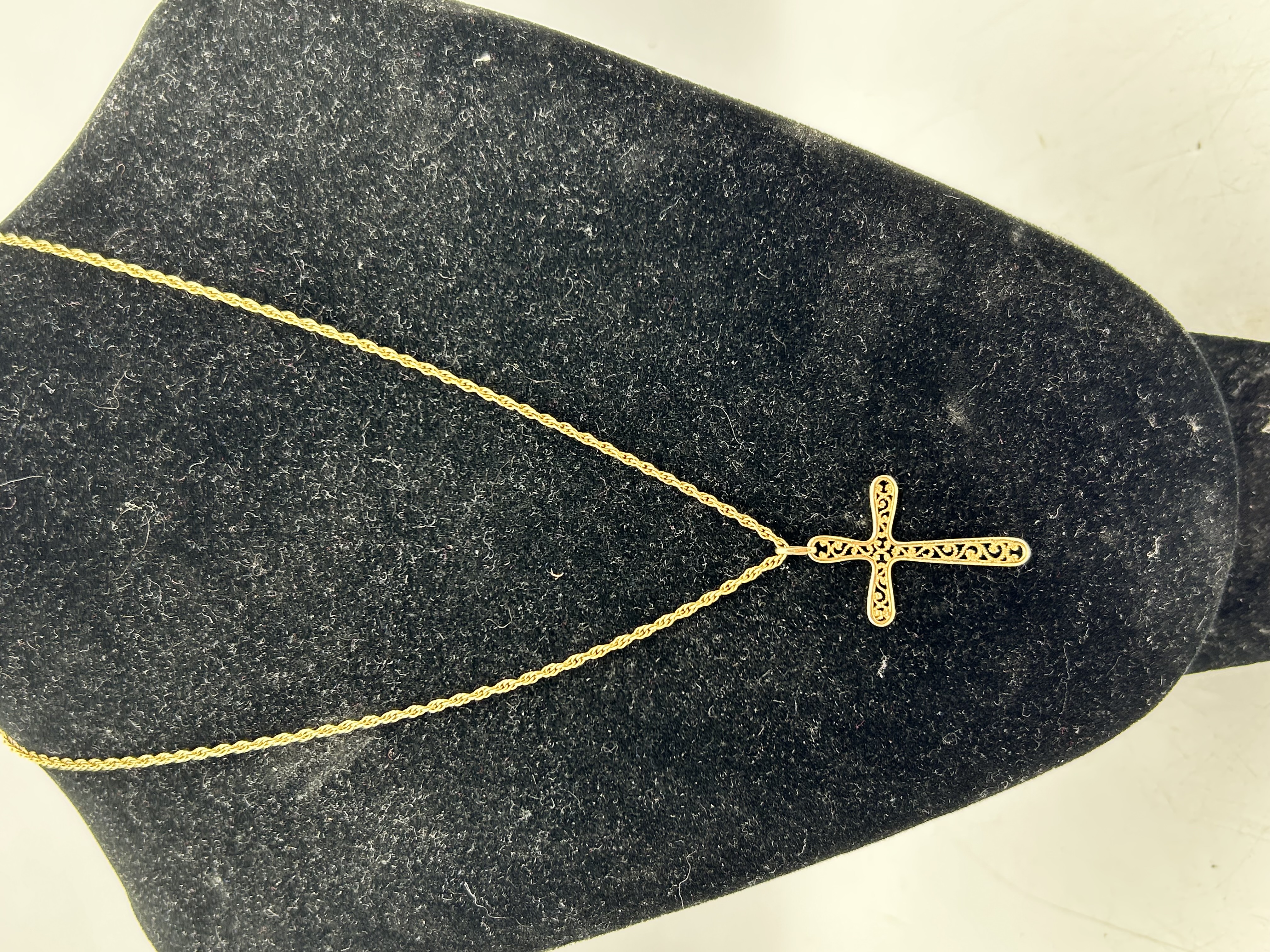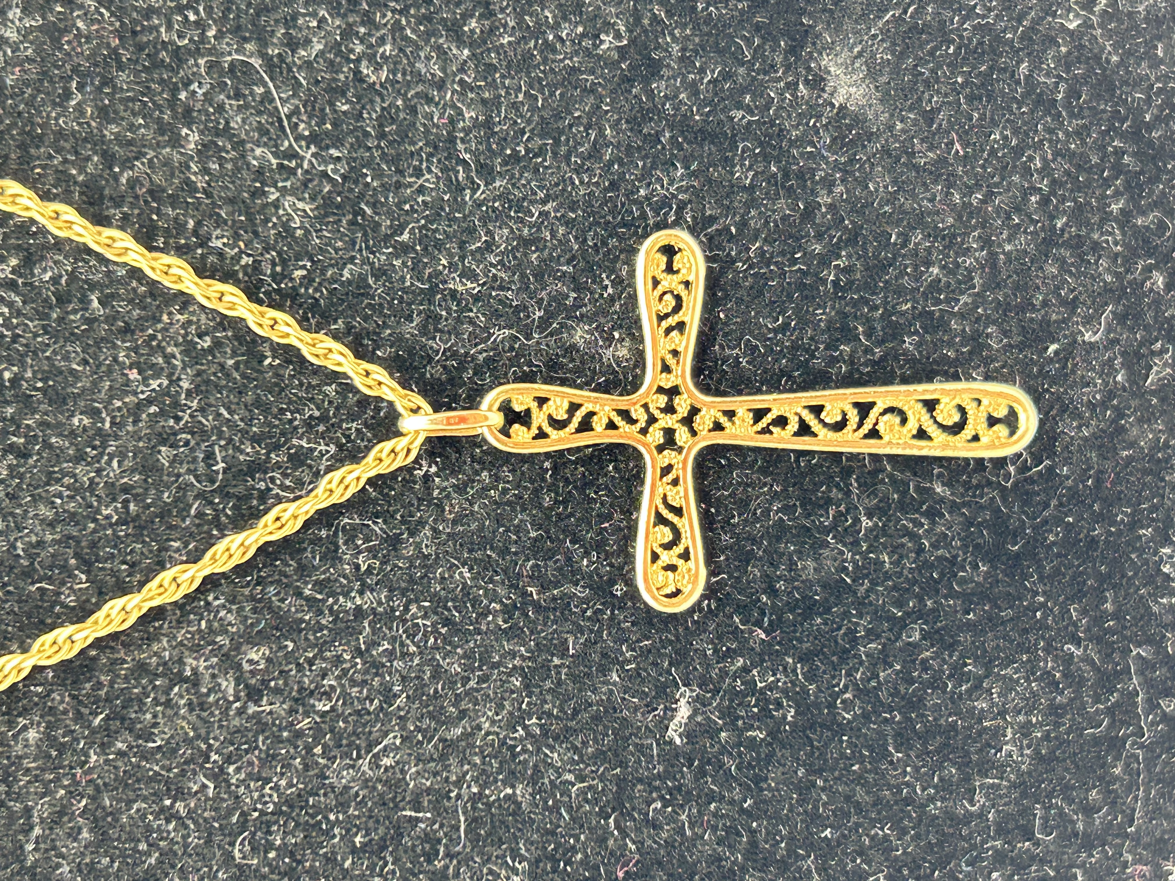 A 9ct yellow gold necklace featuring a Latin cross pendant. The pendant is designed with an intricate openwork filigree and scroll pattern within a polished border. The item is suspended from a matching fine rope-style chain. A hallmark is present on the bail.