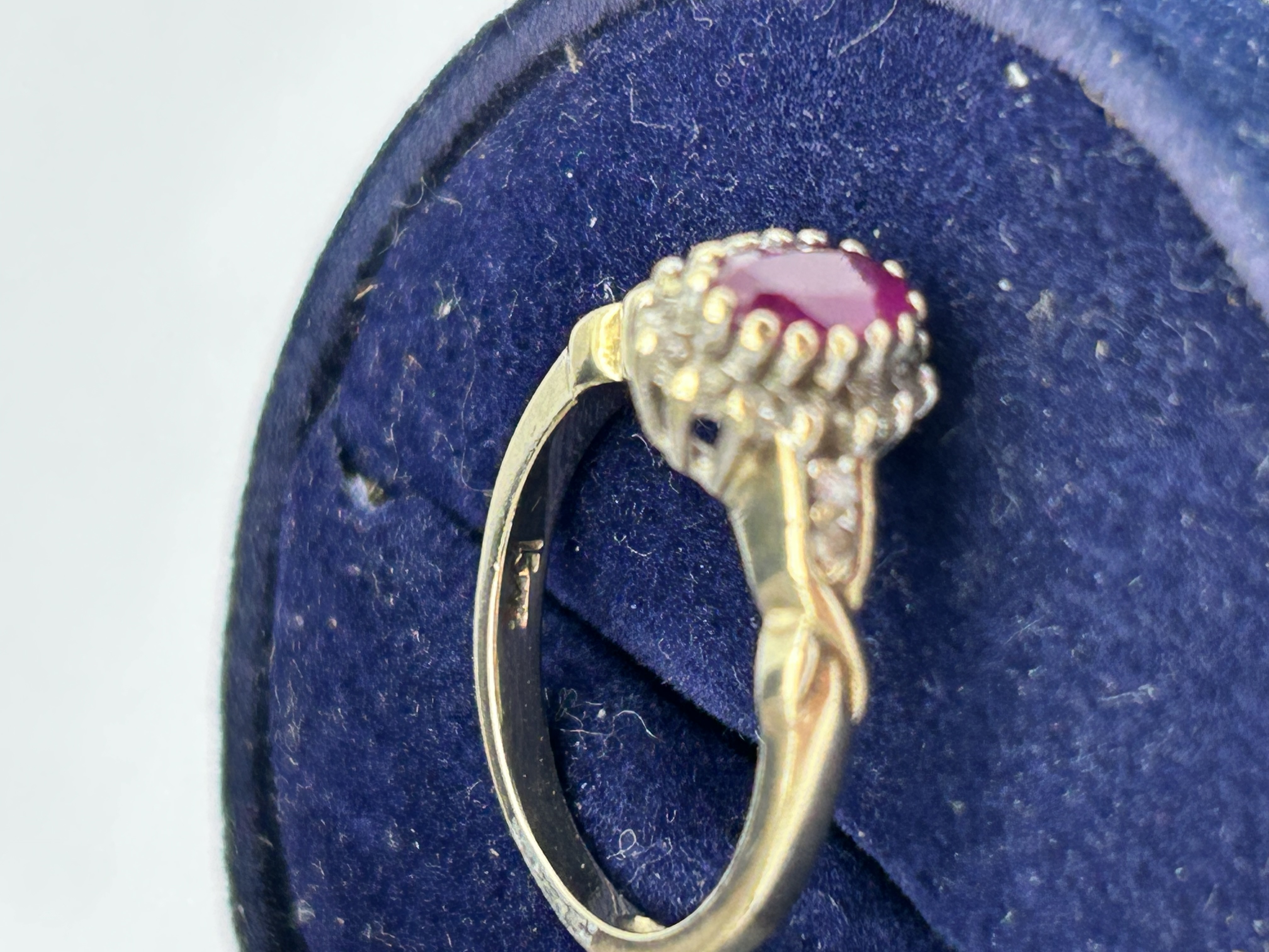 A ruby and diamond halo ring. The piece features a central prong-set oval-cut ruby surrounded by a cluster of round-cut diamonds. The 9ct yellow gold band is designed with a twisted motif at the shoulders, which are further accented by small round-cut diamonds. The interior of the shank is stamped with a hallmark.