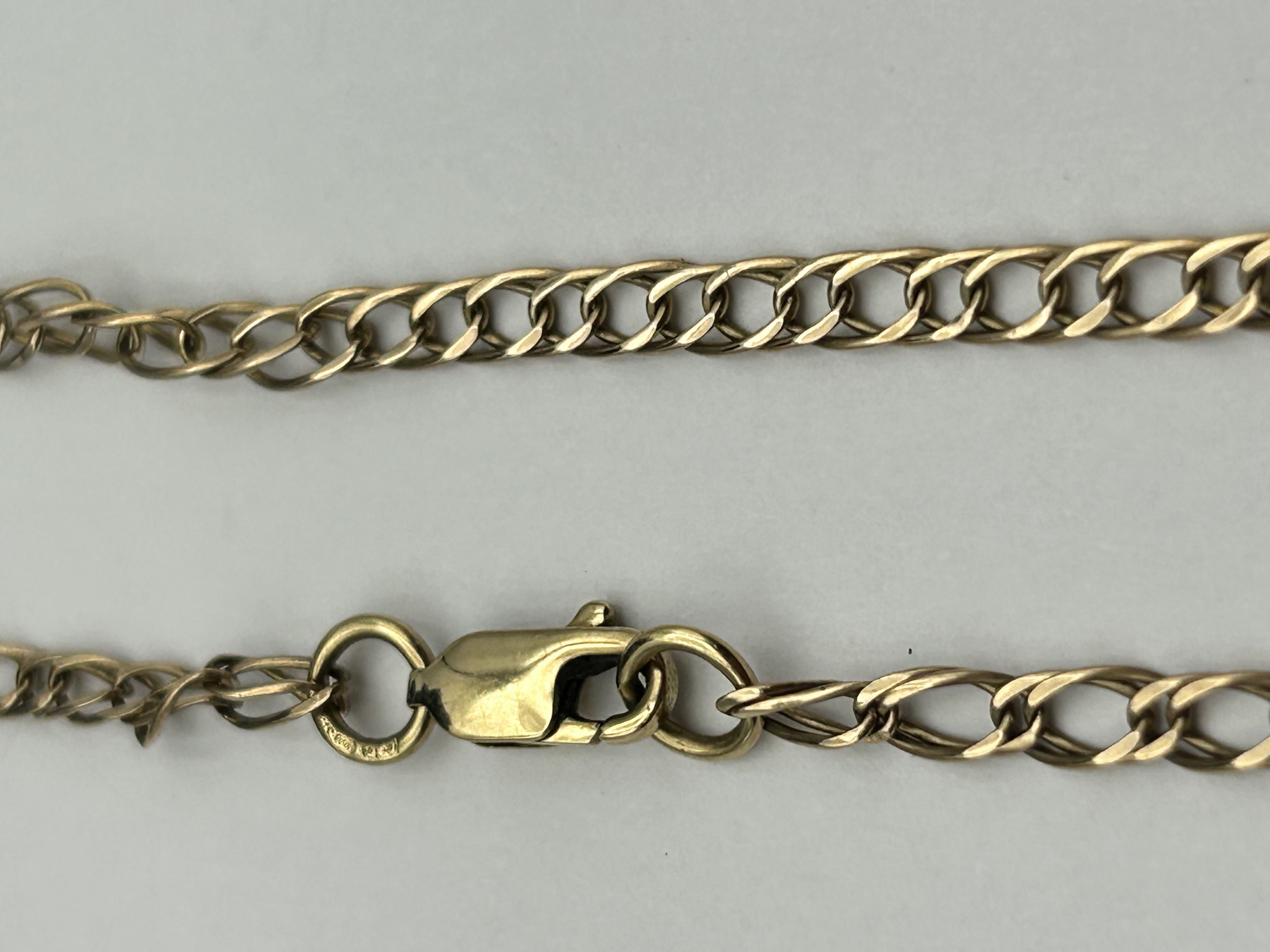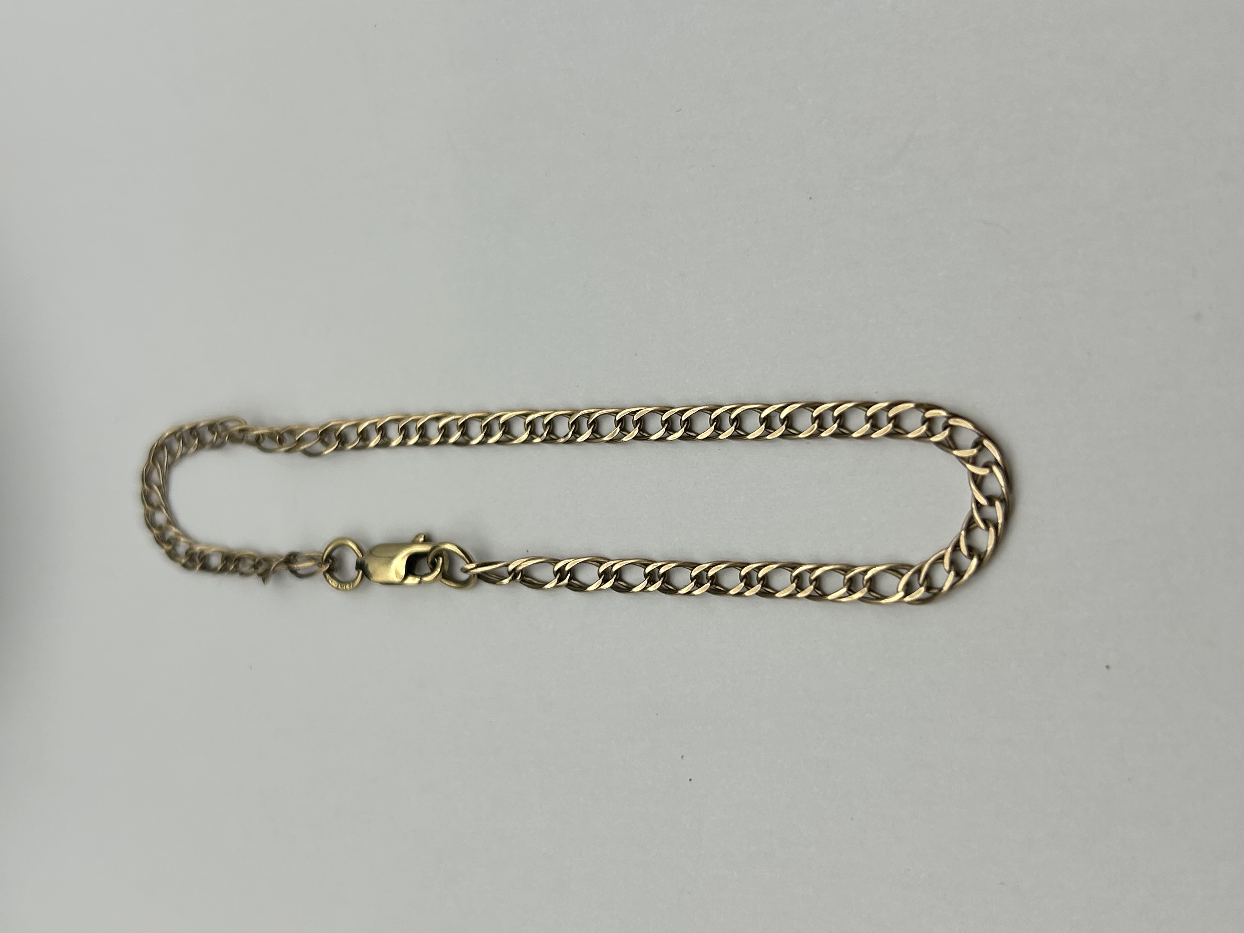 A 9ct gold bracelet featuring a double curb-link design with a polished finish. The piece is constructed with woven links and is secured by a lobster claw clasp and a jump ring. The jump ring bears small, partially legible hallmarks.