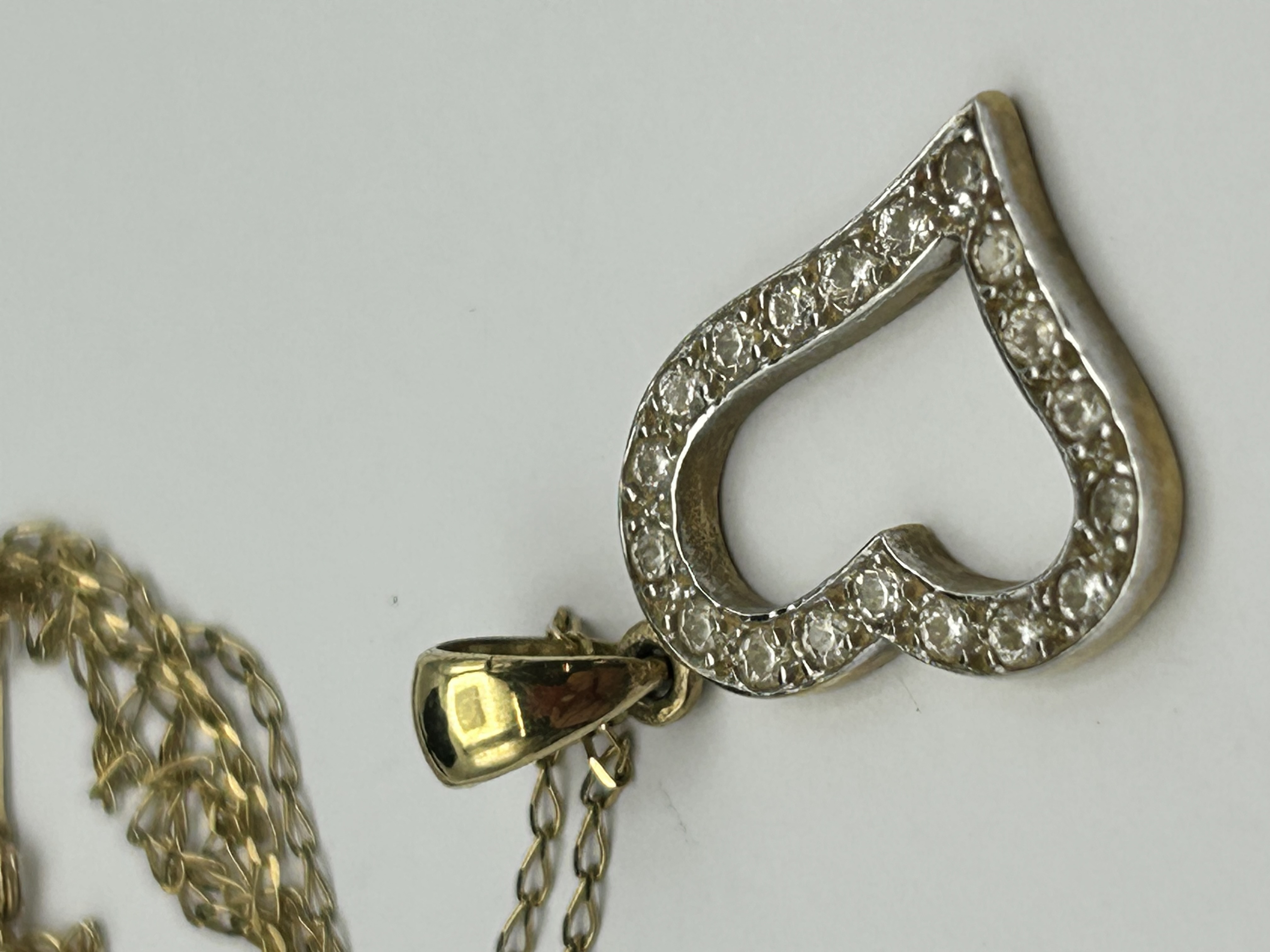 A contemporary 9ct yellow gold and diamond heart pendant necklace. The open-heart pendant is constructed with a 9ct yellow gold reverse and a white metal face, which is channel-set with several round faceted diamonds. The pendant is suspended from a fine-link 9ct yellow gold chain via a polished bail.