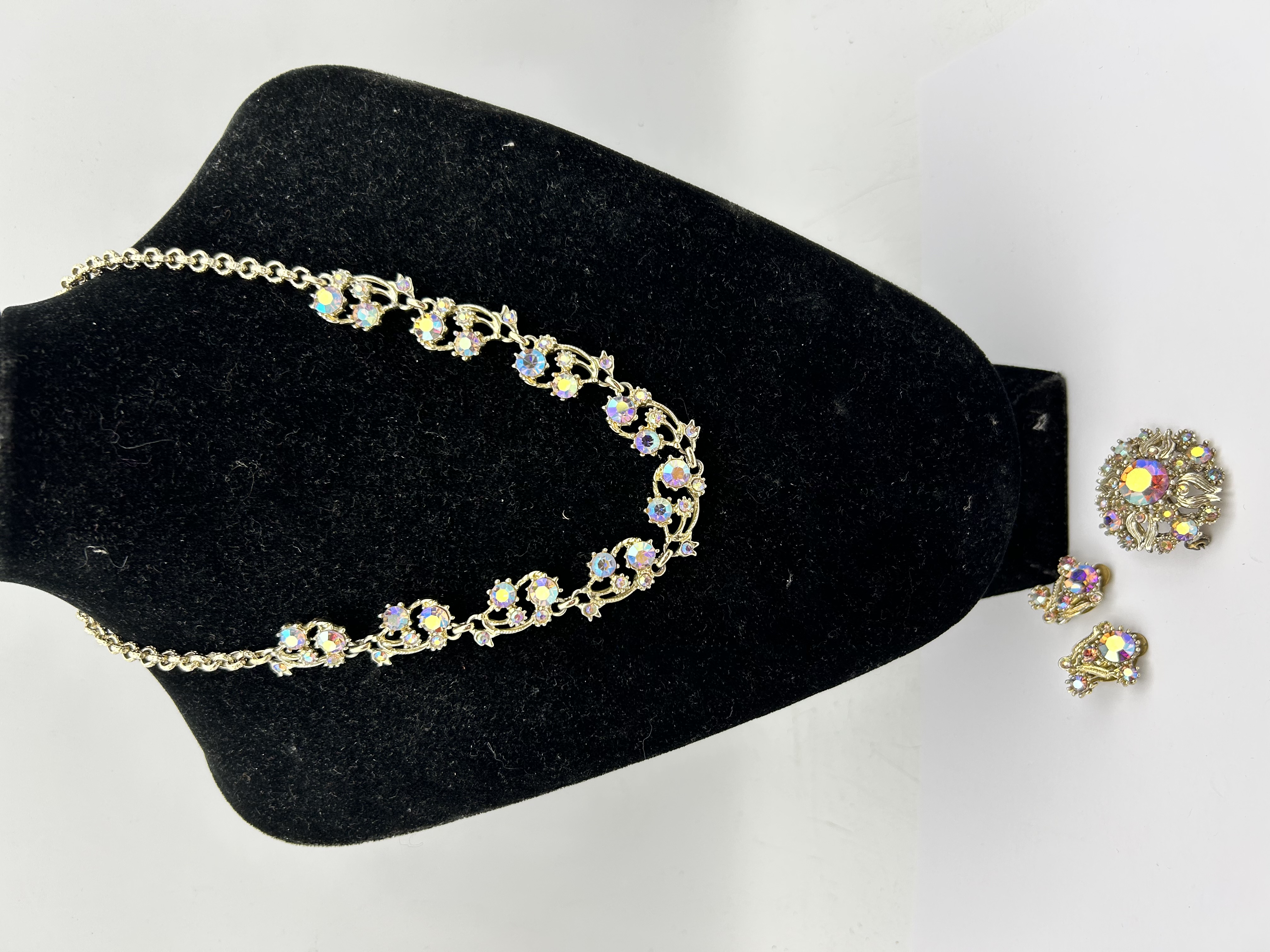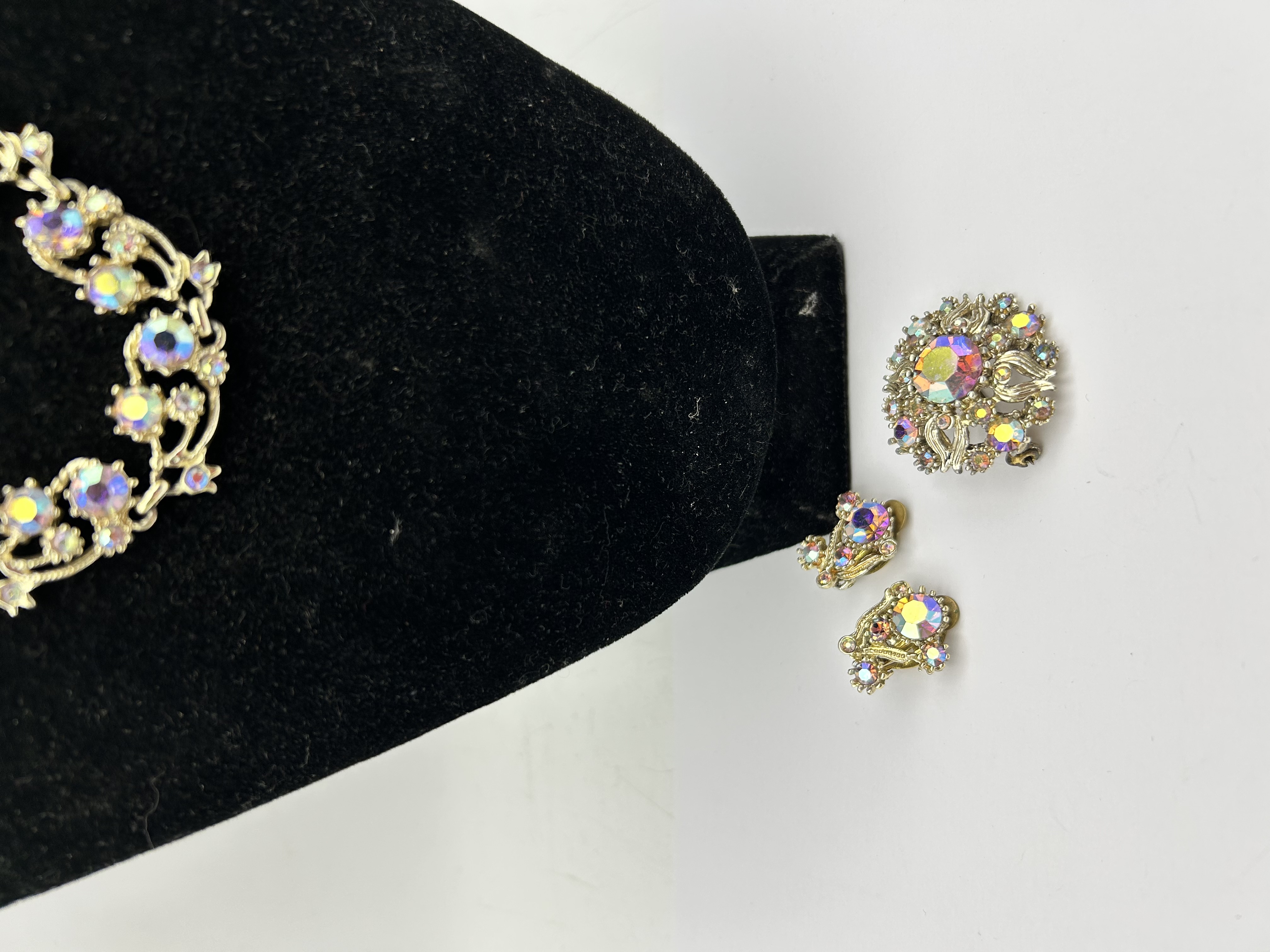A mid-century costume jewellery set comprising a necklace, a brooch, and earrings. The pieces are constructed from gold-tone metal and feature matching decorative floral and foliate motifs accented with iridescent aurora borealis rhinestones. The necklace is designed as a choker consisting of a series of linked, scrolling decorative elements. The circular brooch and clip-on earrings follow a coordinating ornate design.
