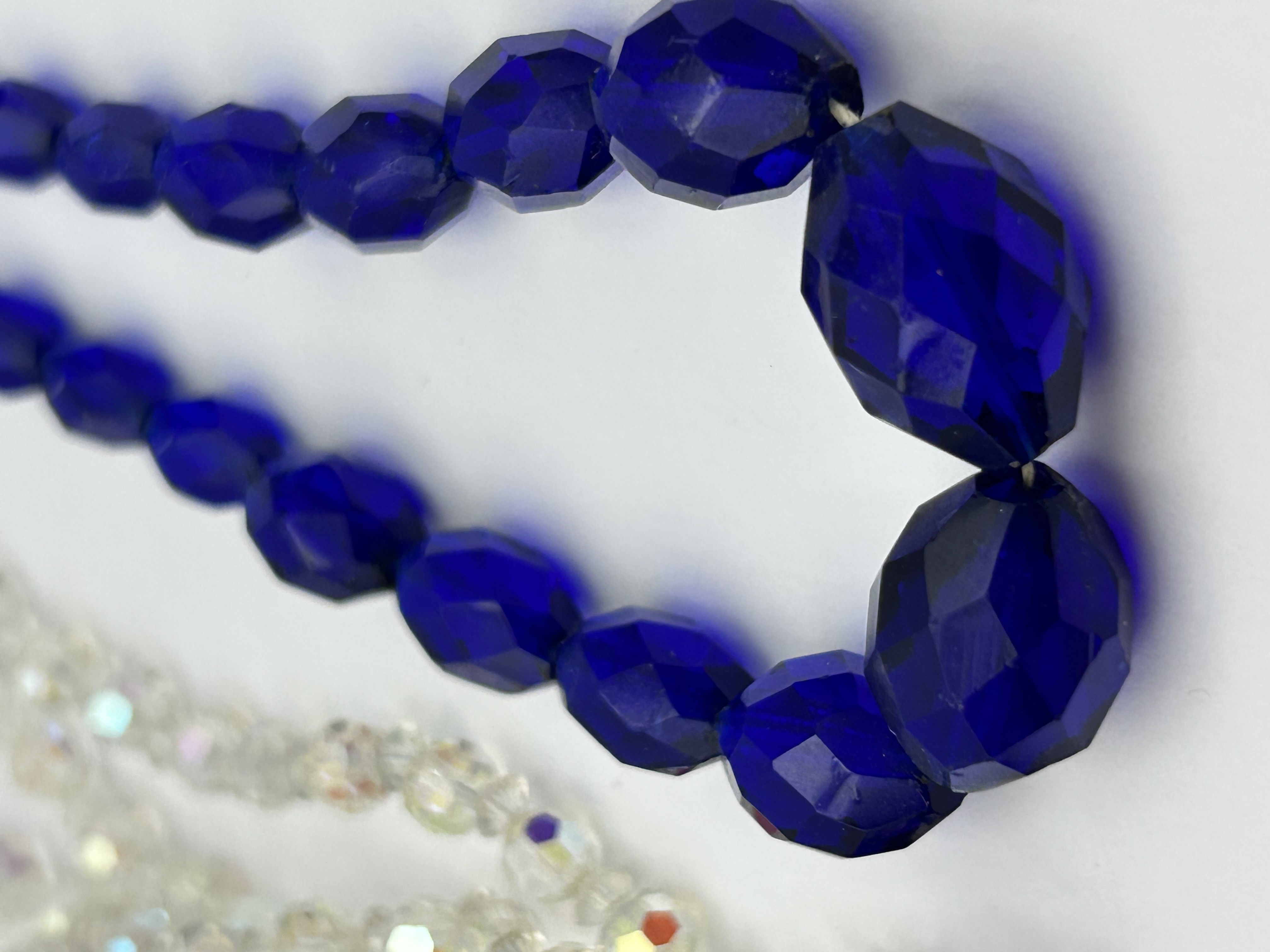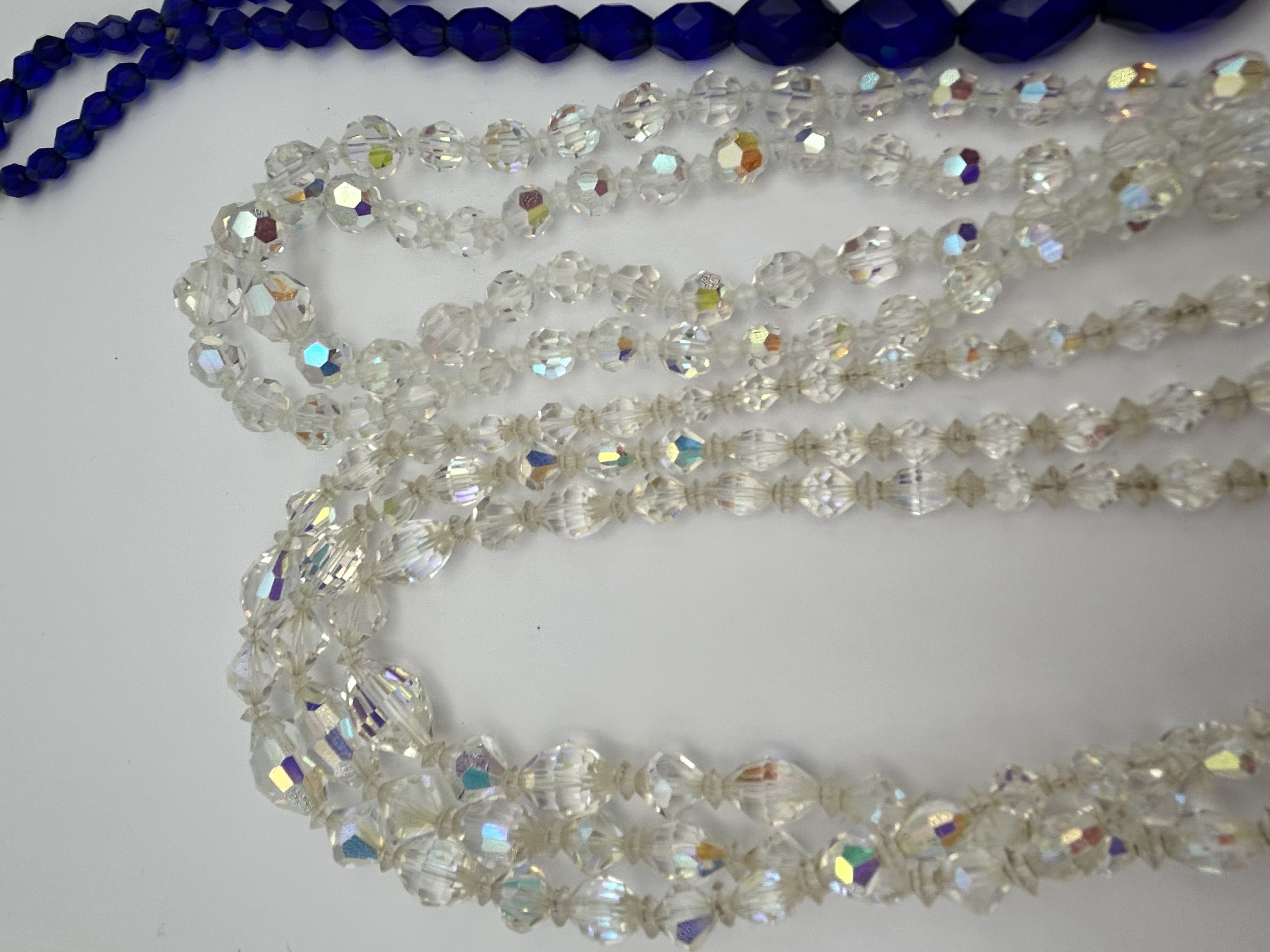 A collection of vintage costume jewellery necklaces comprising a single-strand necklace and several multi-strand necklaces. The single-strand necklace is composed of graduated, faceted cobalt blue glass beads, with the largest faceted beads positioned at the centre. The multi-strand necklaces are constructed from faceted clear glass beads featuring an iridescent aurora borealis finish. These pieces are secured with decorative metal box clasps embellished with aurora borealis rhinestones, with one clasp featuring a larger central stone. The designs exhibit mid-20th-century styling.