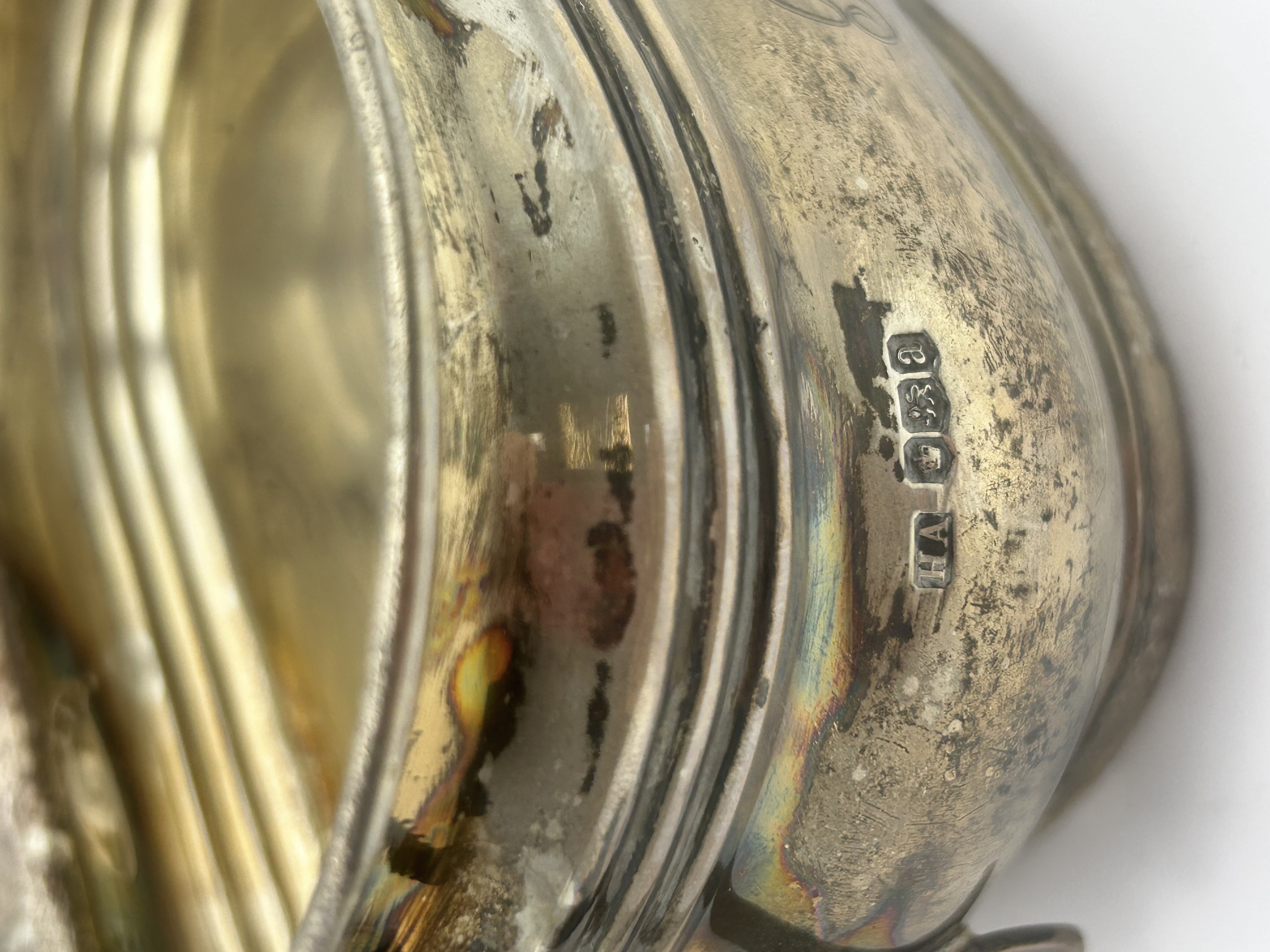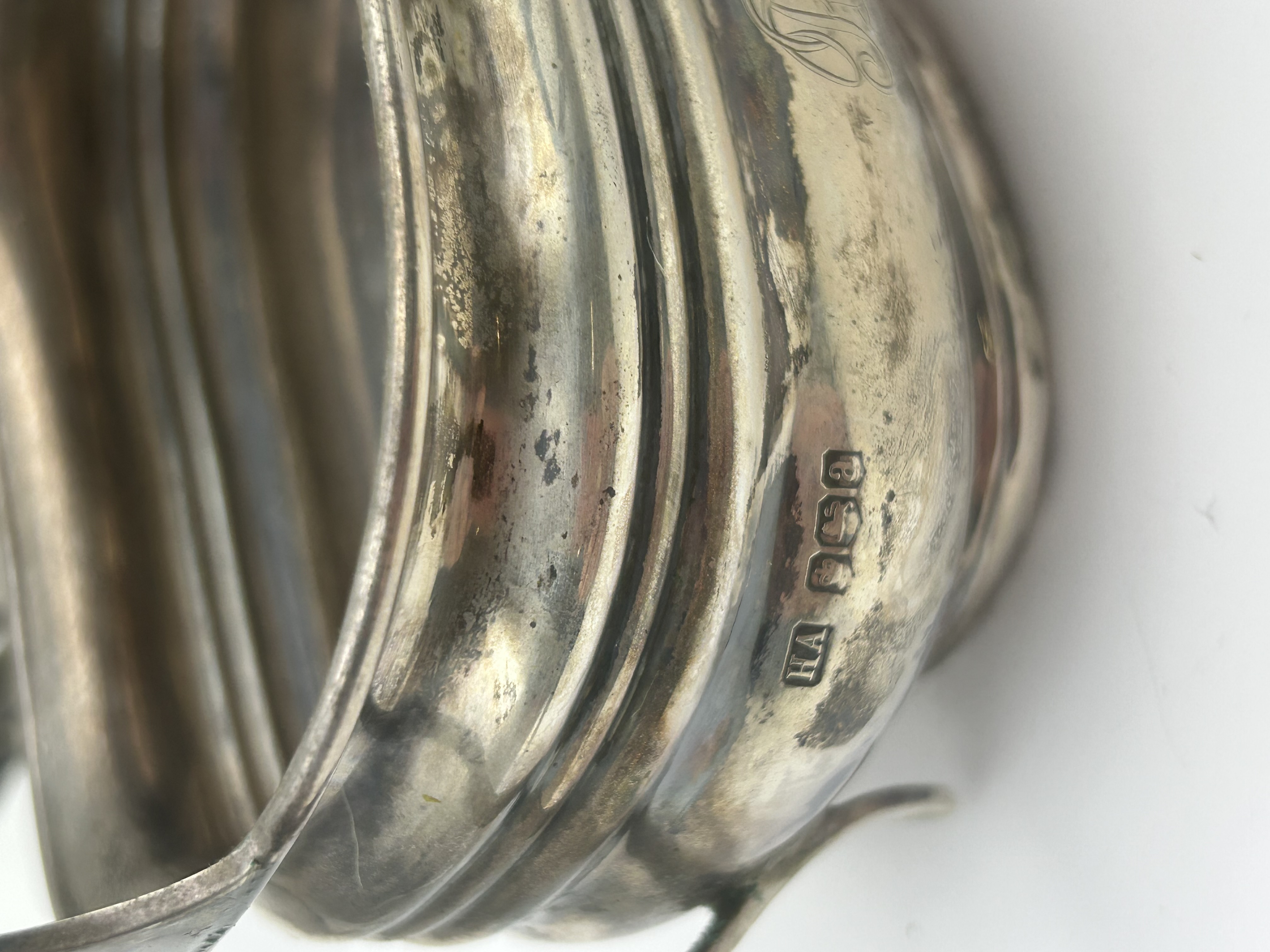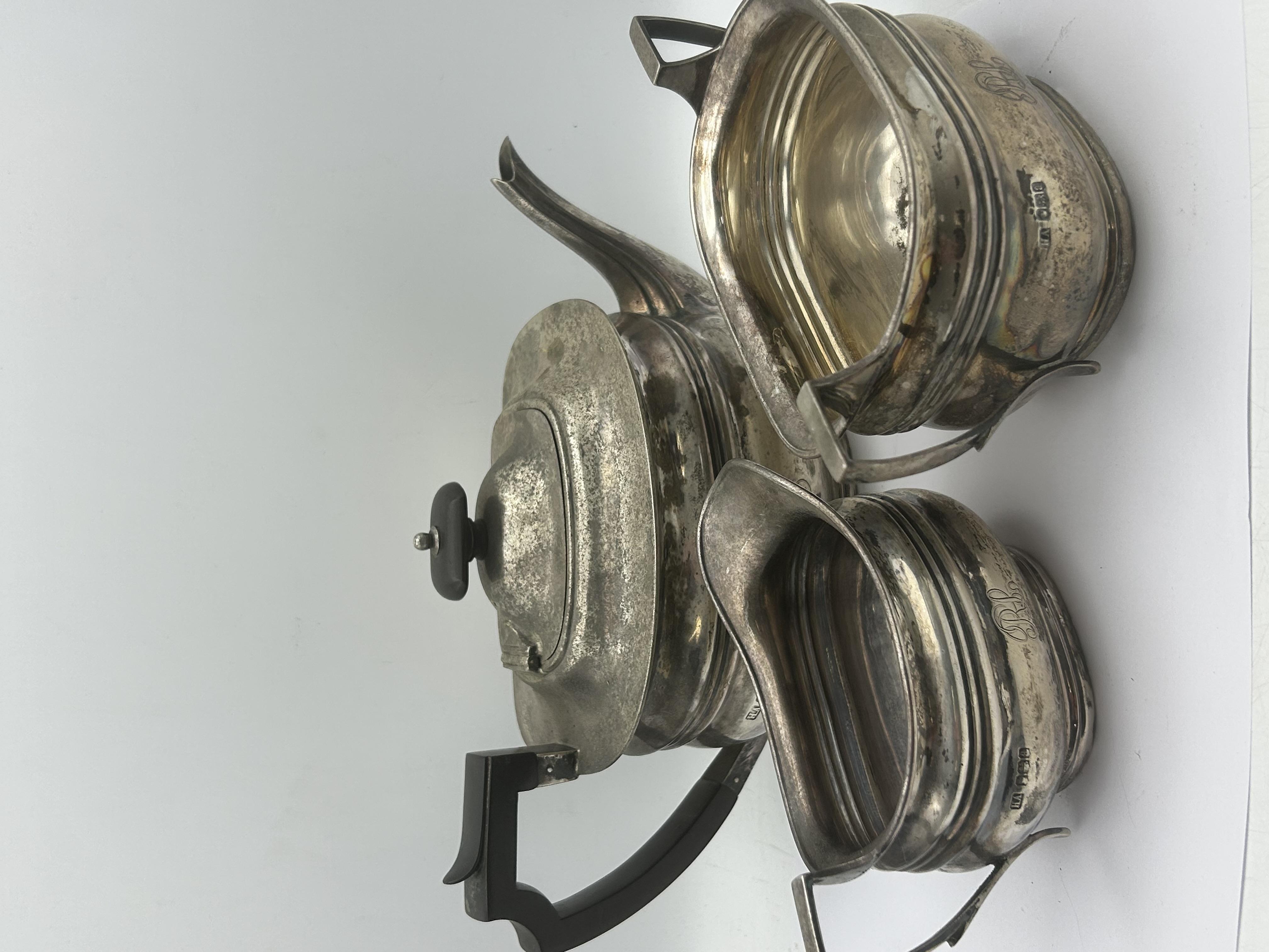 A trio of sterling silver holloware pieces by Atkin Brothers, comprising a teapot, a two-handled sugar bowl, and a cream pitcher. Each piece is constructed with a lobed or gadrooned lower body and features an engraved script monogram. The teapot is fitted with an angular dark-toned handle and a matching circular finial on the hinged lid. Visible hallmarks on each piece include the maker mark HA for Atkin Brothers, the Sheffield crown assay mark, the lion passant for sterling silver, and the date letter a, dating the set to 1918.