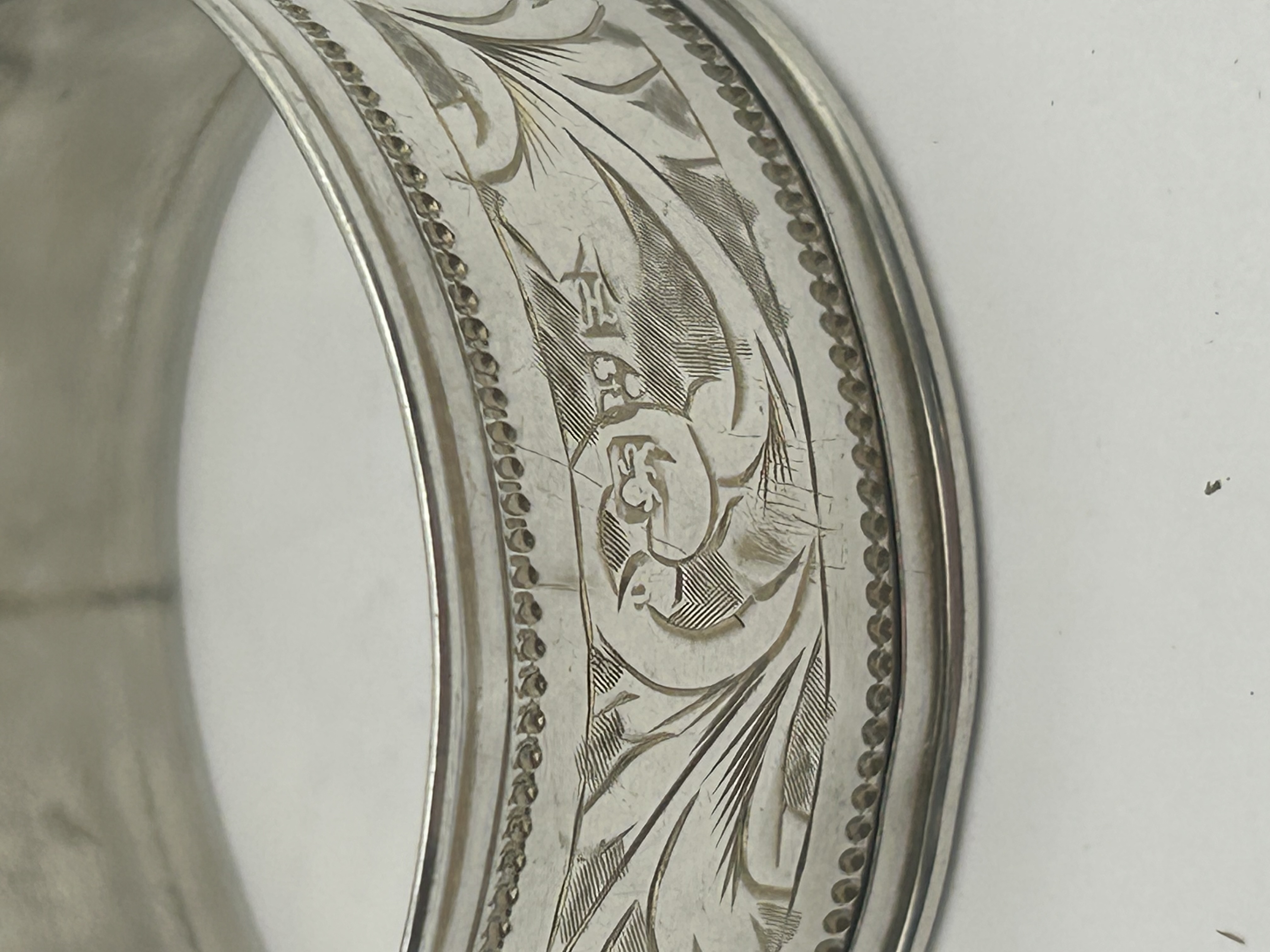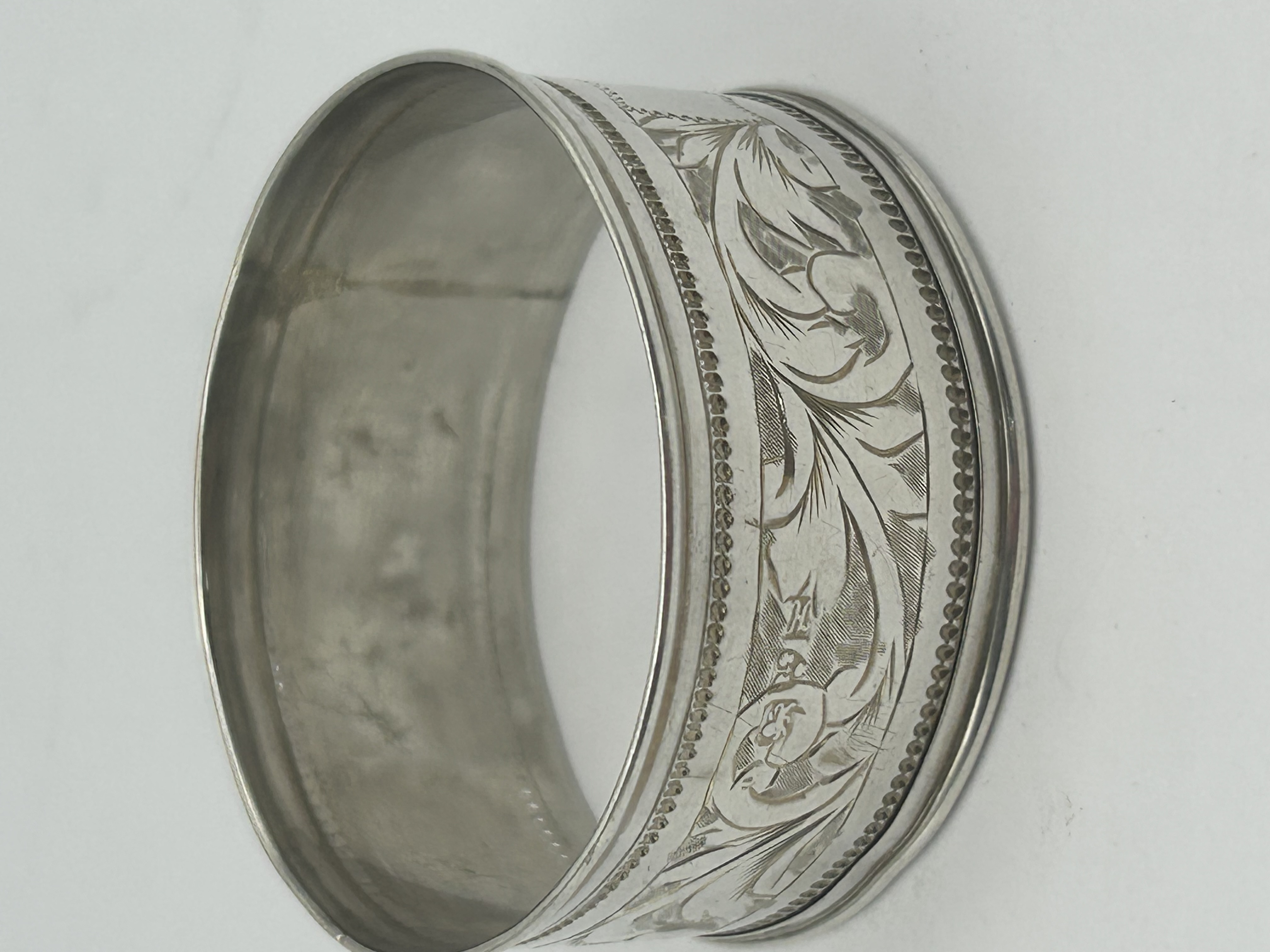 A sterling silver napkin ring featuring bright-cut engraved floral and scrolling foliate motifs. The cylindrical band is finished with beaded borders to the rims and includes a central stylized monogram, appearing to read HL. The interior exhibits a visible seam from construction.