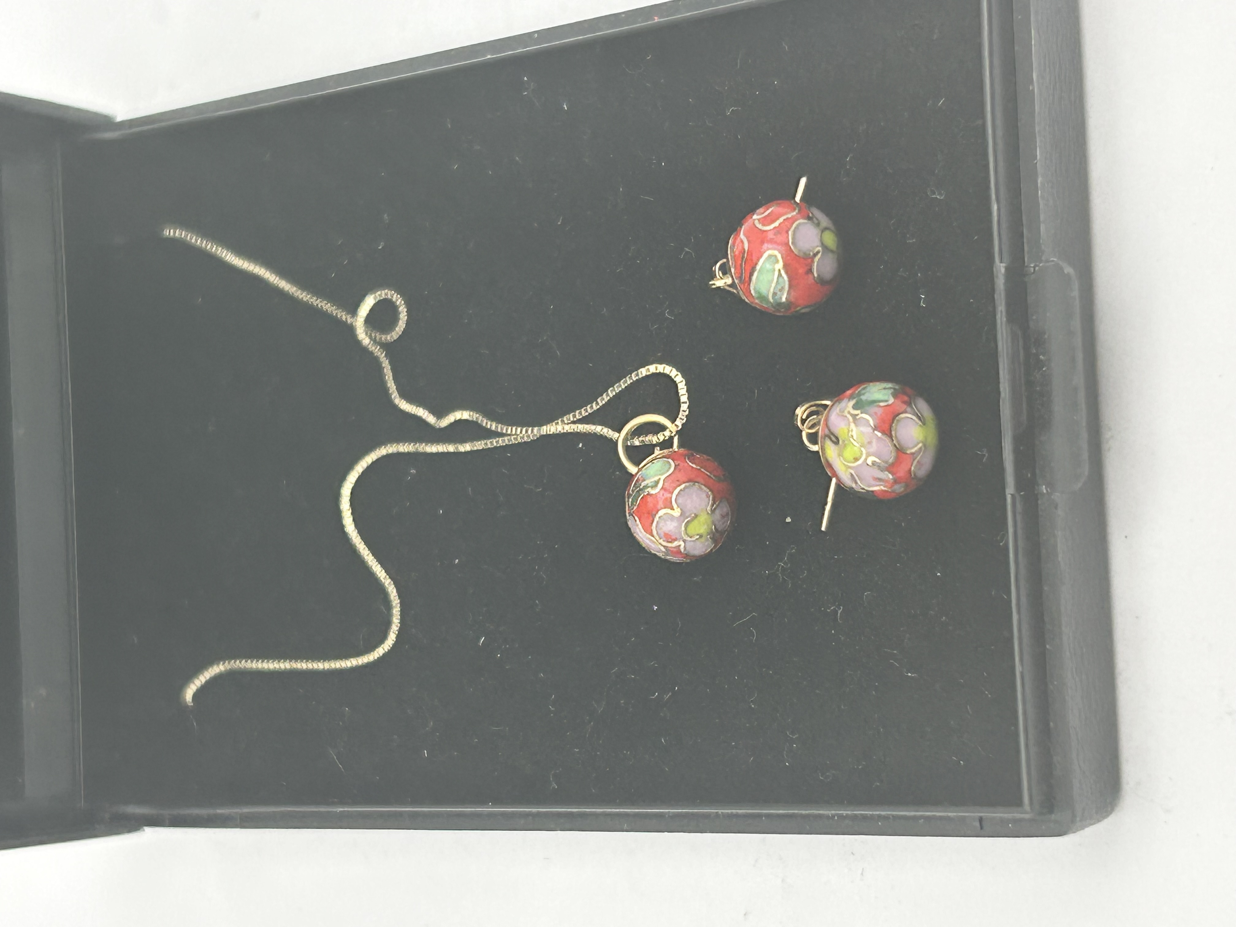 A trio of jewellery items consisting of a pendant necklace and a matching pair of earrings. The suite features spherical Venetian lampwork glass beads, identified as the wedding cake pattern, characterised by a vibrant red ground decorated with applied floral motifs in pink, green, and white. The metal components, including the fine box-link chain and earring mounts, are 9ct gold. The items are housed in a black-lined presentation case.