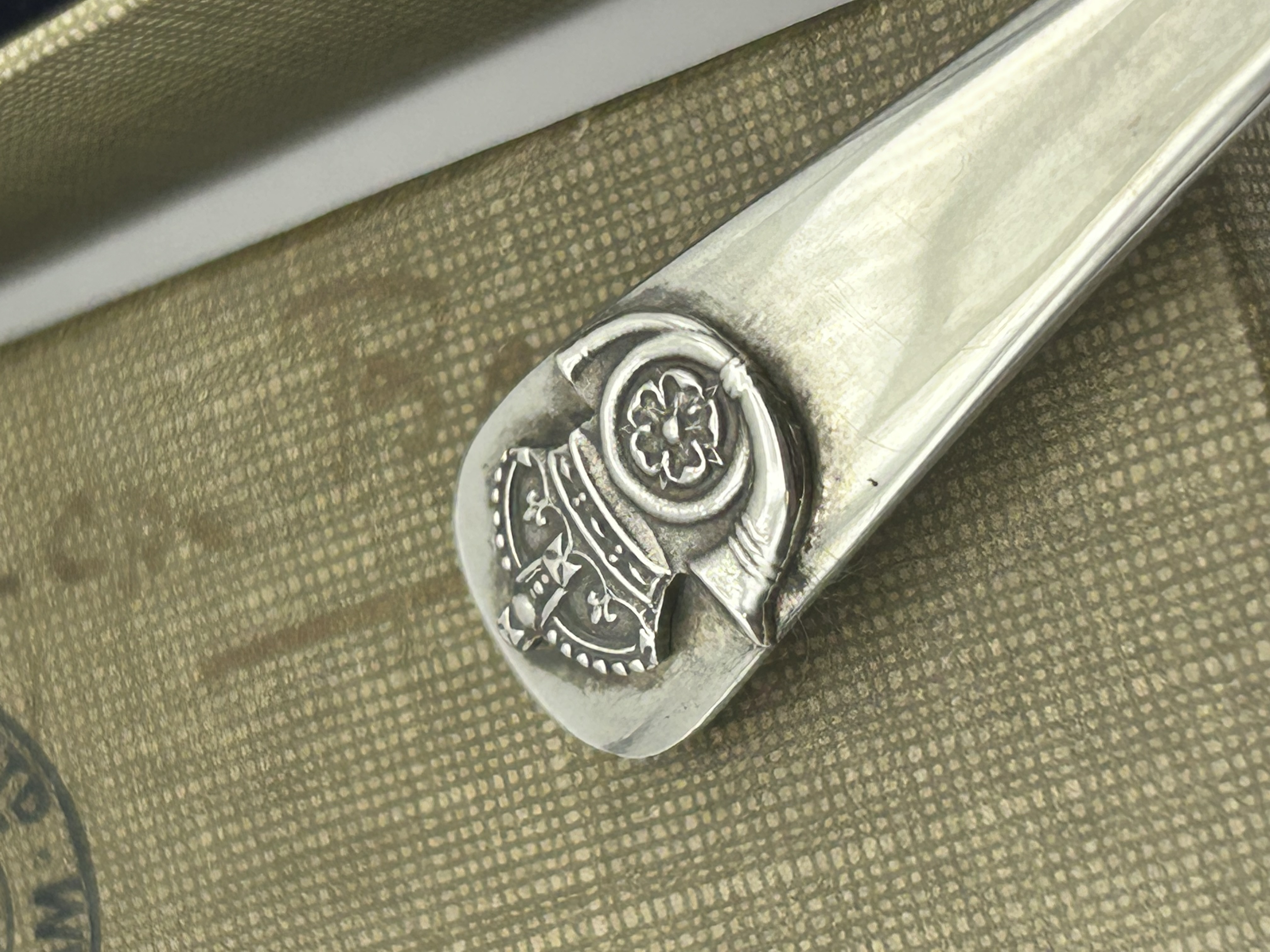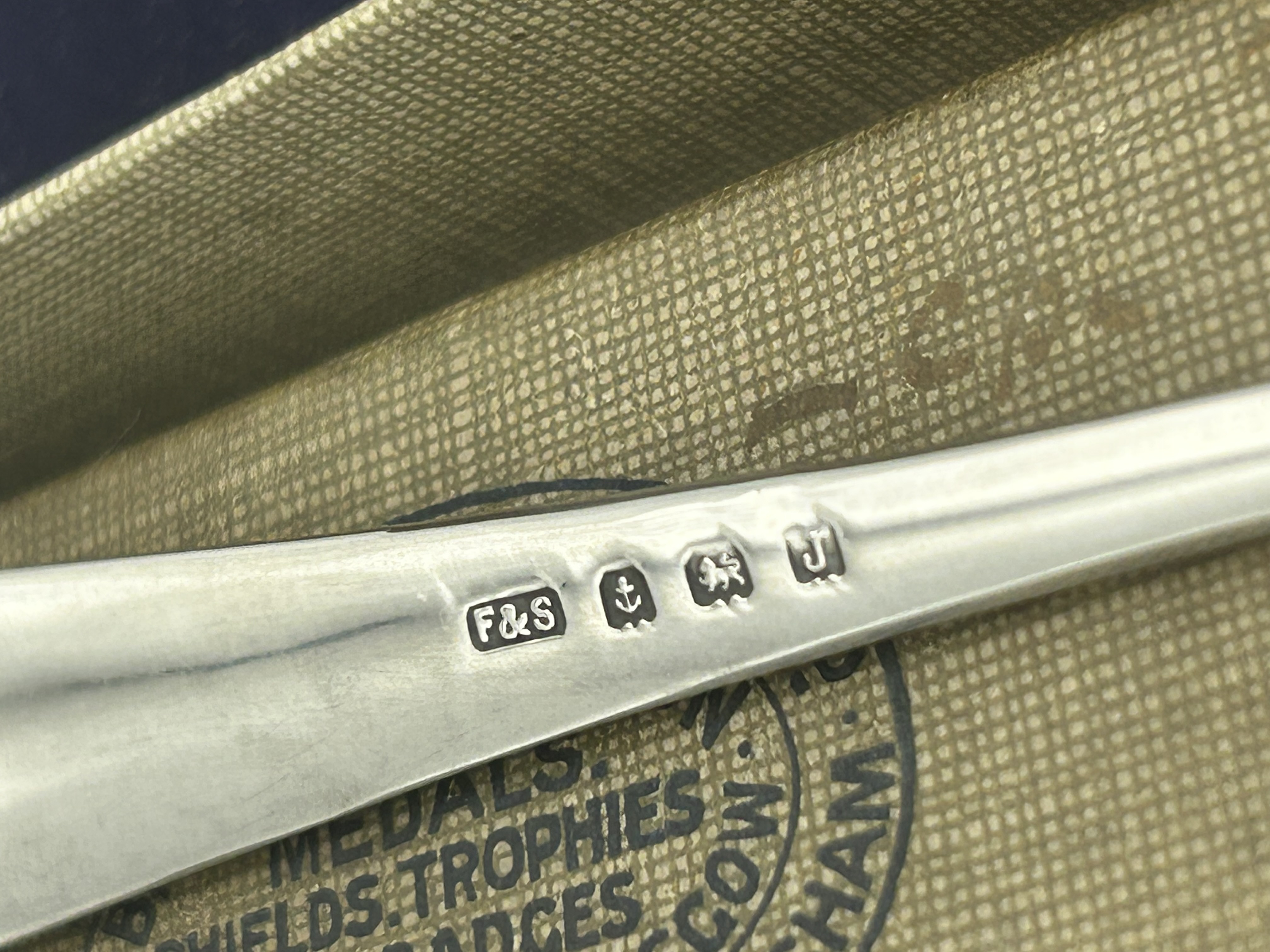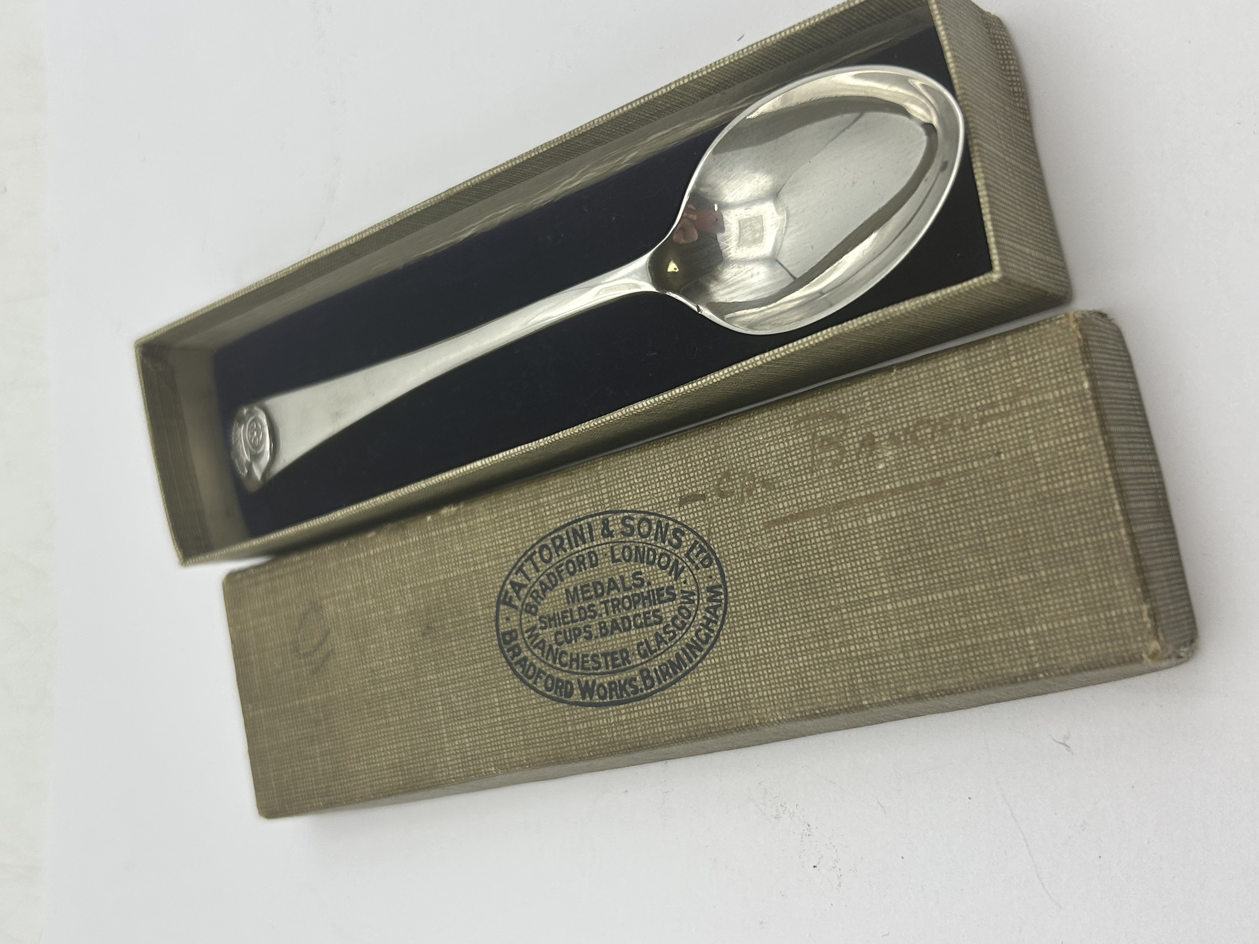 A George V sterling silver presentation spoon manufactured by Fattorini and Sons Ltd. The handle terminal features a relief-moulded badge for the King’s Own Yorkshire Light Infantry (KOYLI), depicting a crown positioned above a bugle horn with a central Yorkshire rose. The reverse of the handle bears the maker’s mark F&S alongside Birmingham hallmarks including the anchor, lion passant, and date letter J for 1933. The spoon is housed in its original gold-toned, textured presentation box, which contains a retailer’s stamp for Fattorini and Sons on the interior lid.