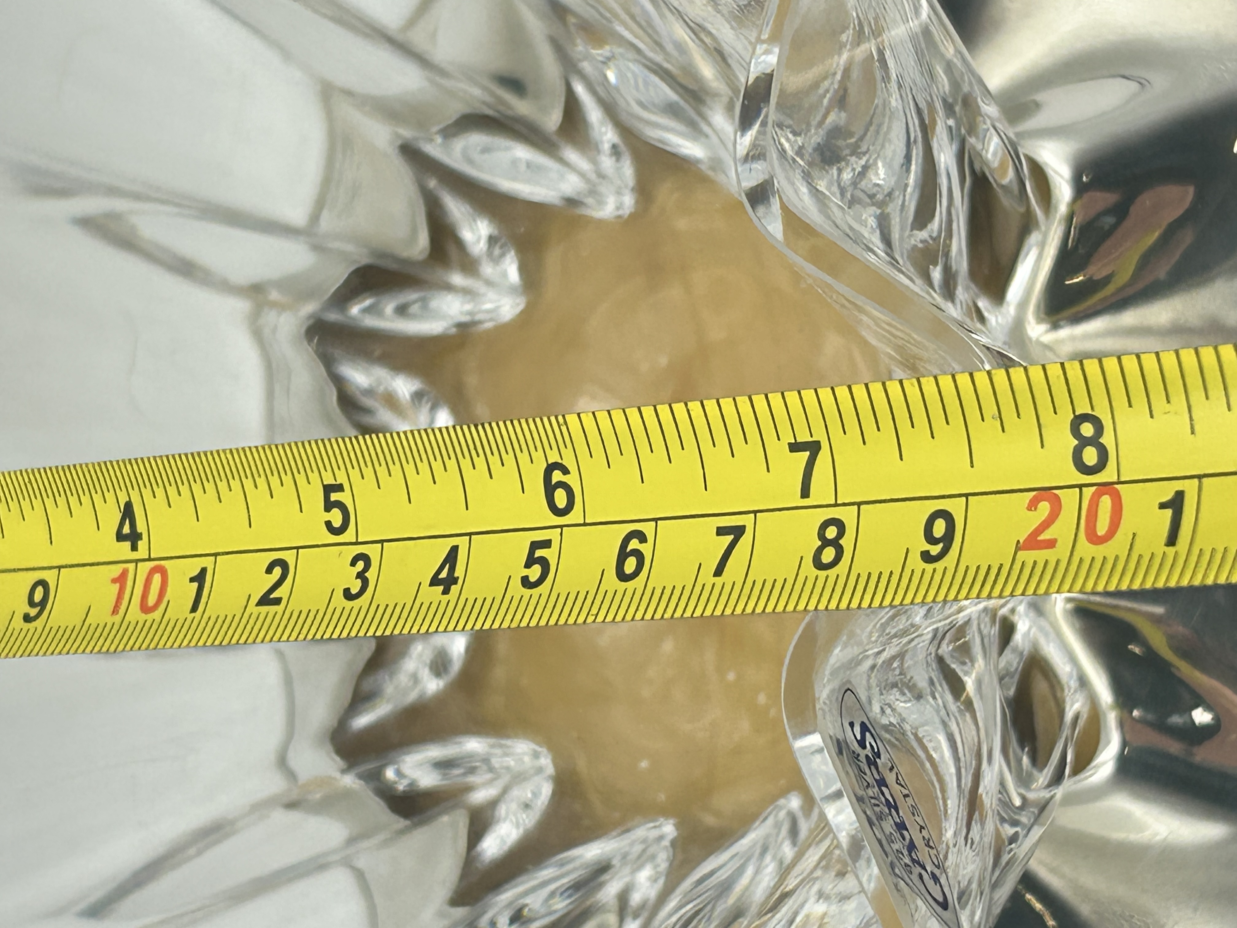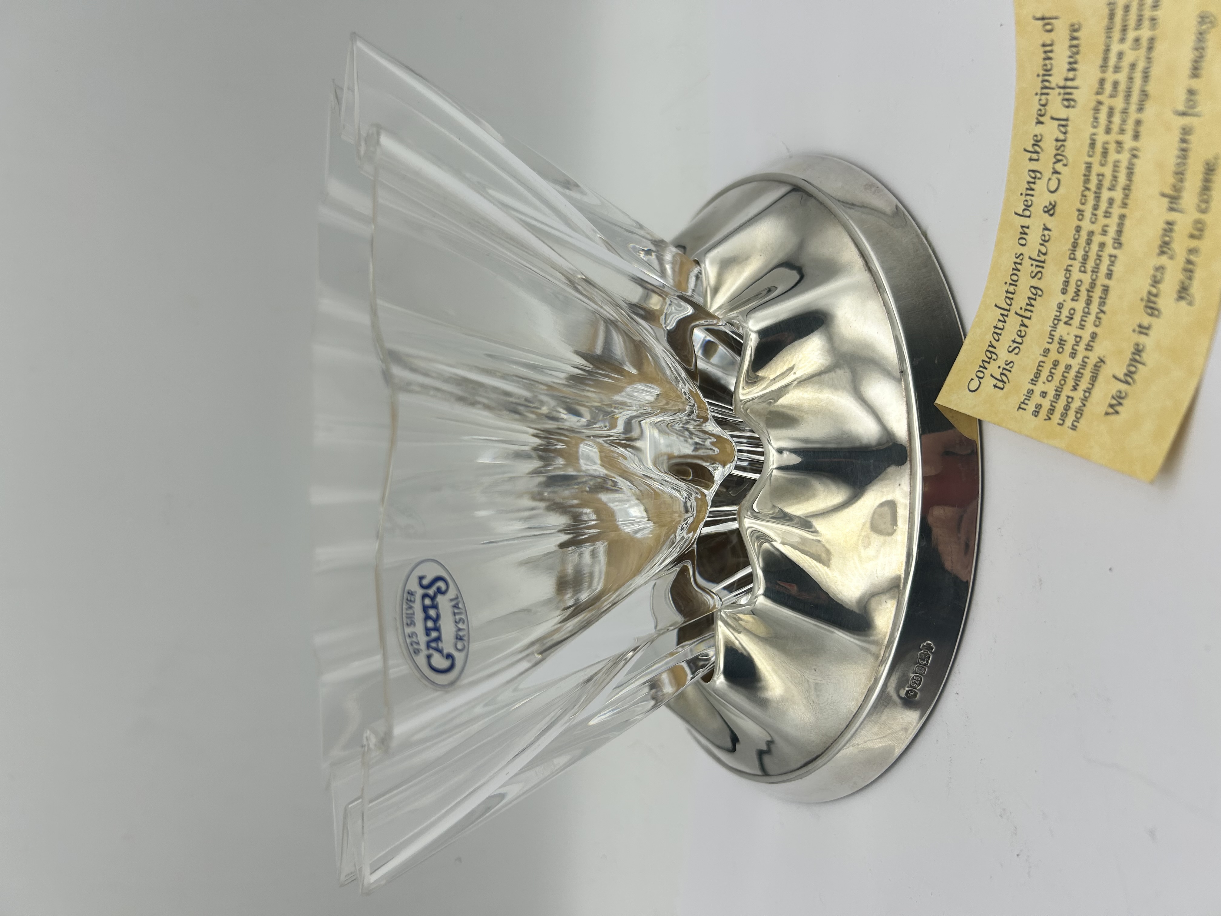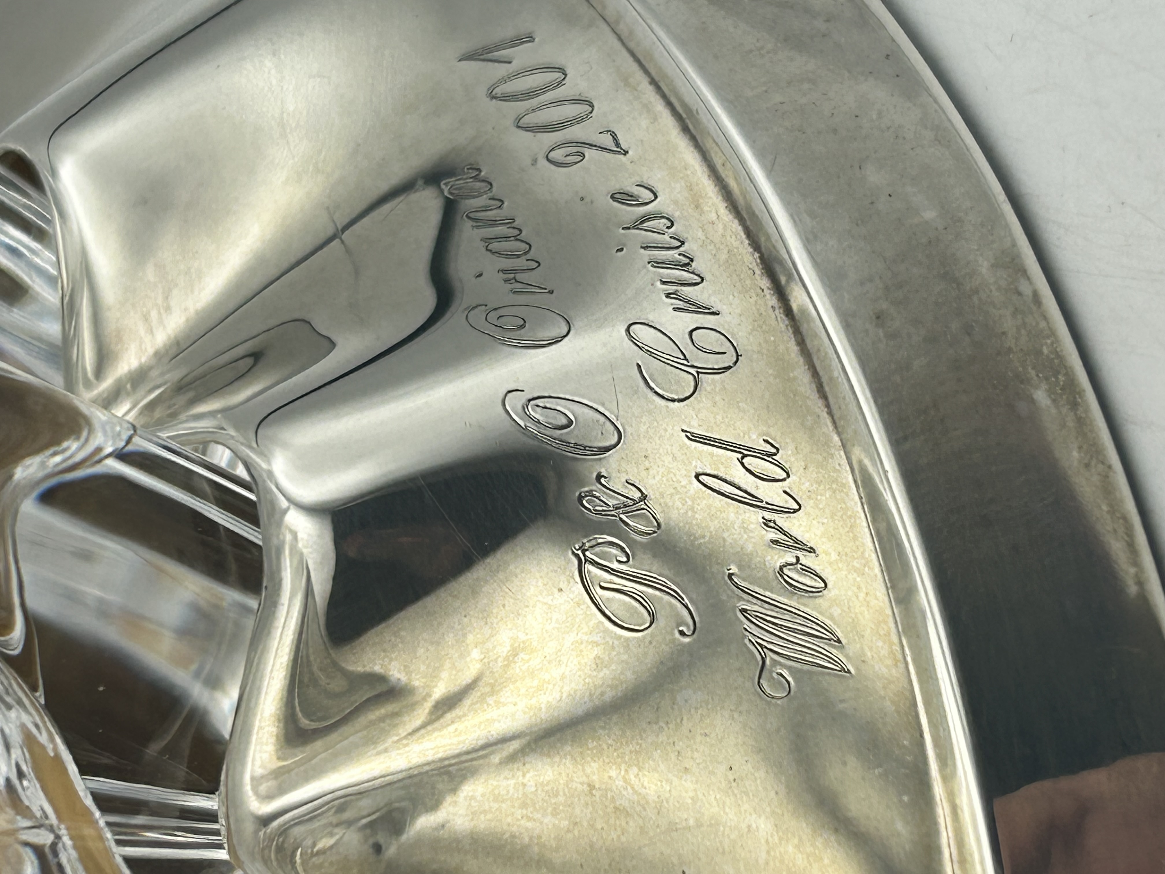 A commemorative sterling silver mounted crystal bowl by Carrs of Sheffield Ltd. The piece features a fluted clear crystal body with a wavy rim set into a circular weighted sterling silver base. The silver mount is hallmarked for Sheffield, 2000, with the maker mark RC for Carrs of Sheffield Ltd and the .925 fineness mark. The base is personalised with a cursive engraving reading P&O Oriana World Cruise 2001. A manufacturer sticker for CARRS CRYSTAL is present on the glass. The item is accompanied by a descriptive card from the maker.