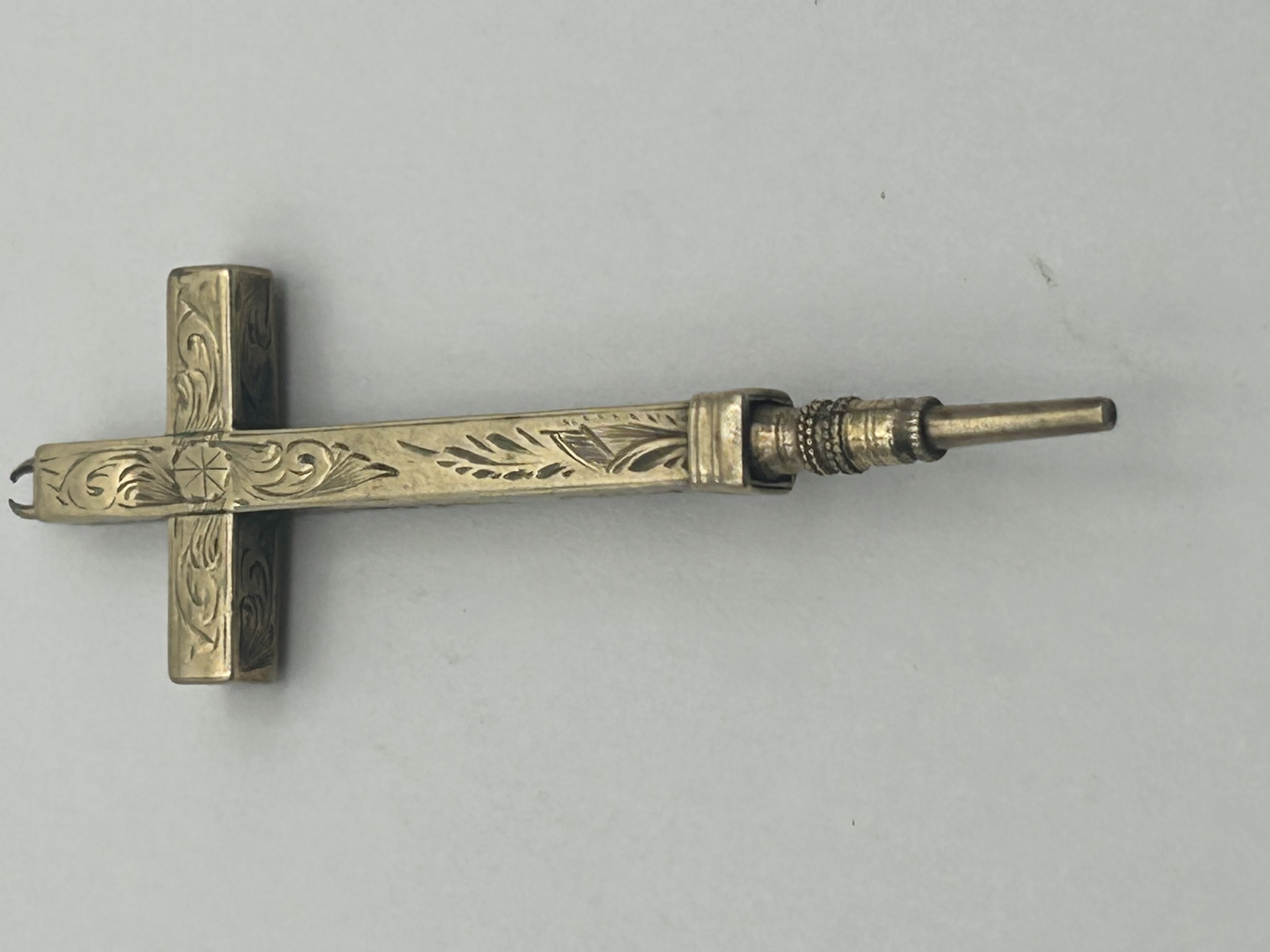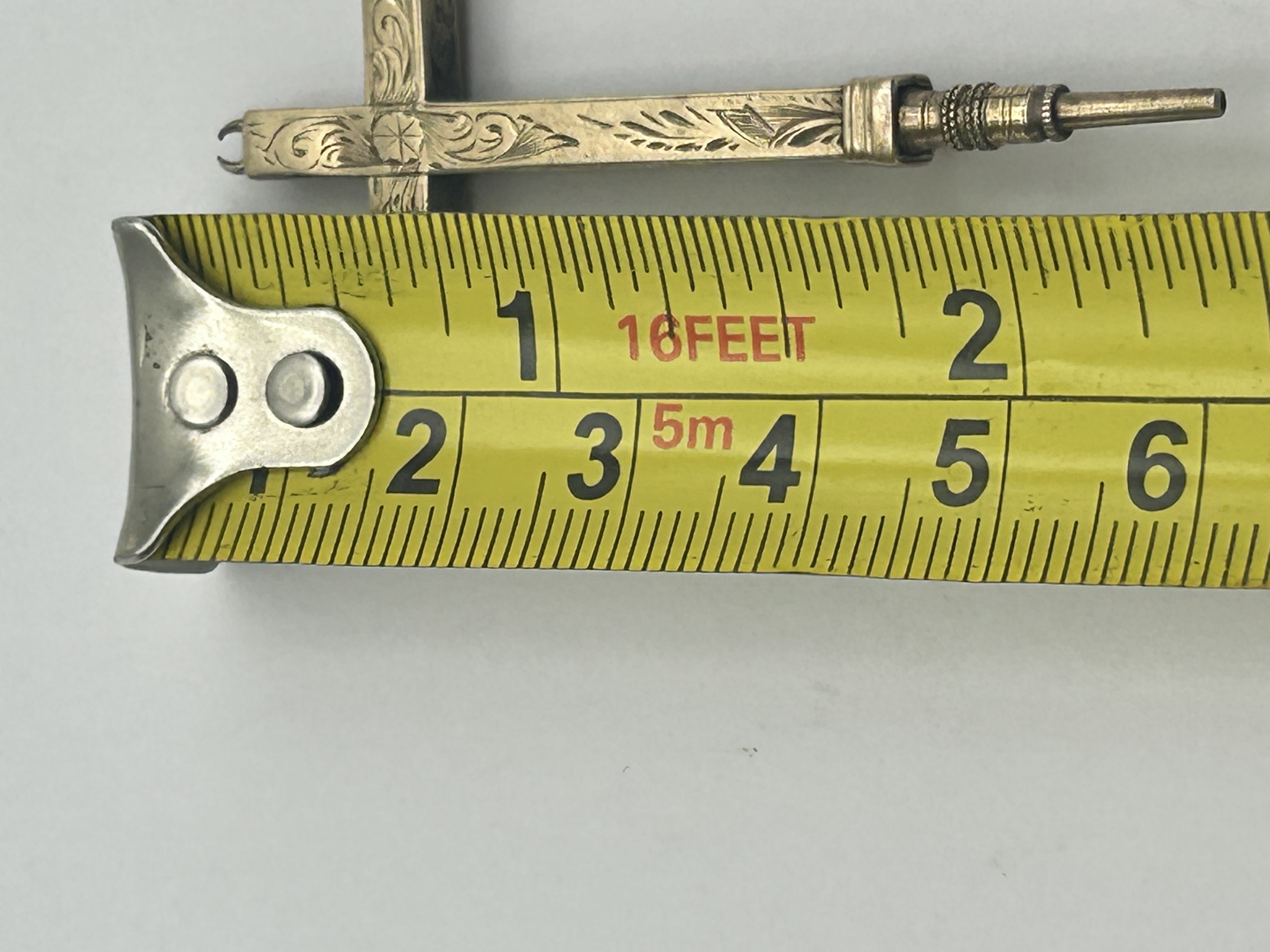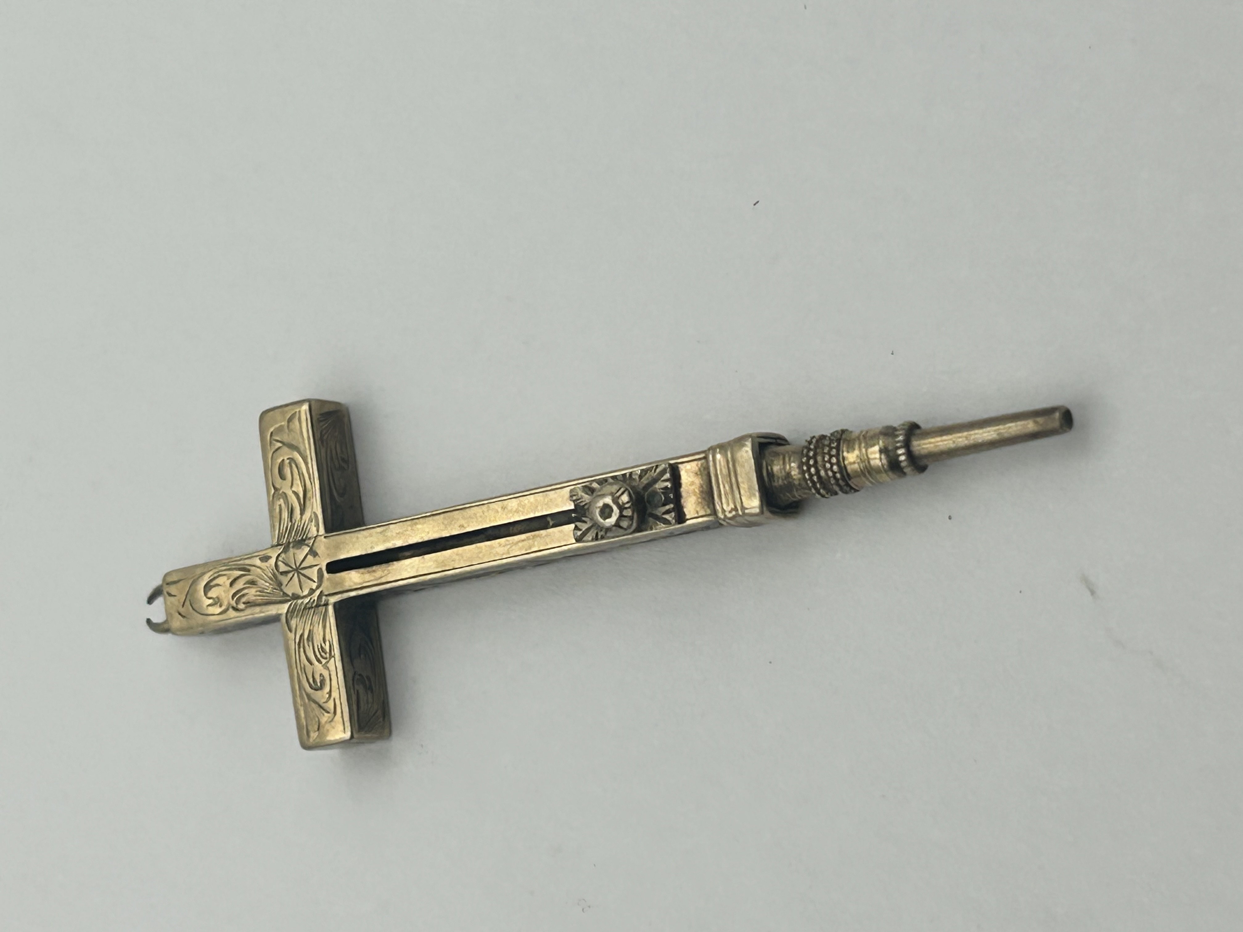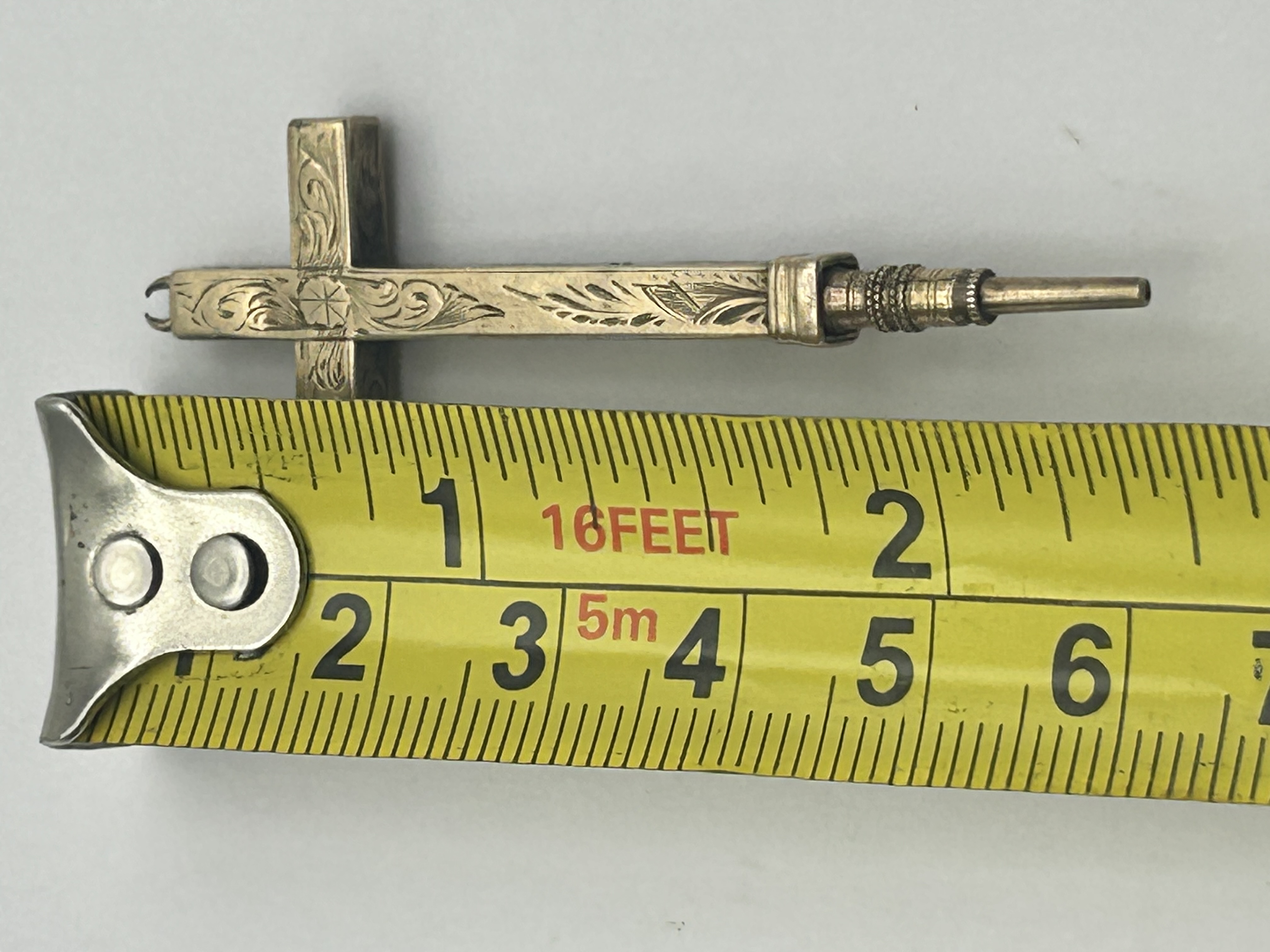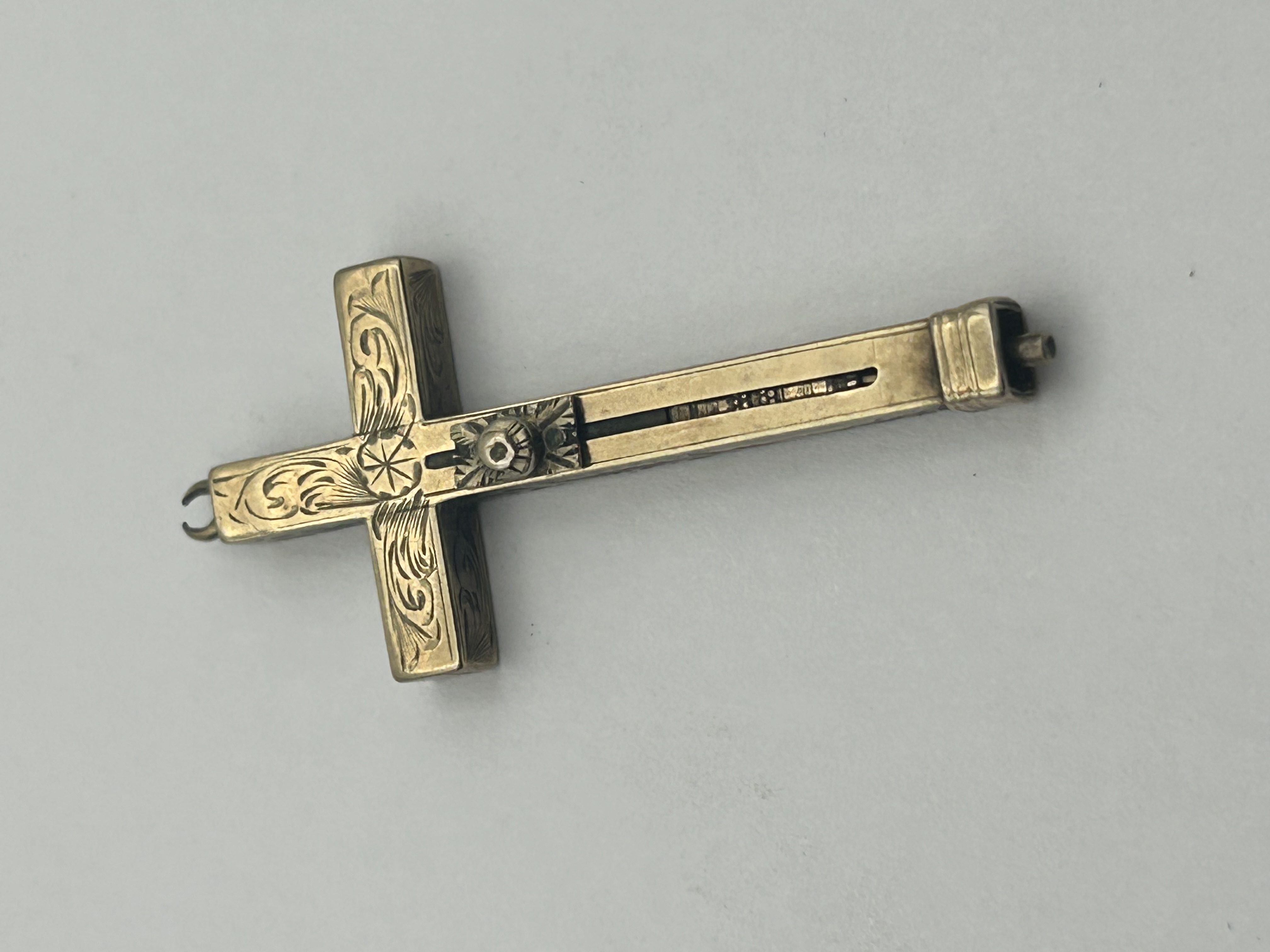 A Victorian novelty propelling pencil of crucifix form, crafted from yellow gold-toned metal. The exterior surfaces are decorated with engraved scrolling foliate patterns. The item features a telescoping action engaged by a sliding button cast with a skull and crossbones motif. Small, indistinct hallmarks or maker’s marks are visible within the internal channel of the sliding mechanism. The terminal is fitted with a suspension loop.